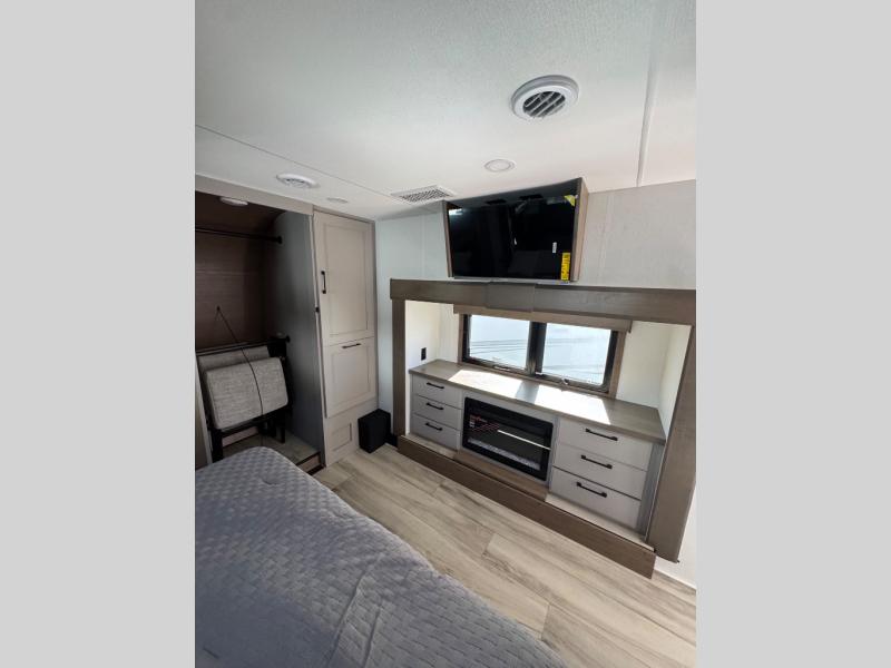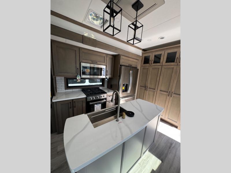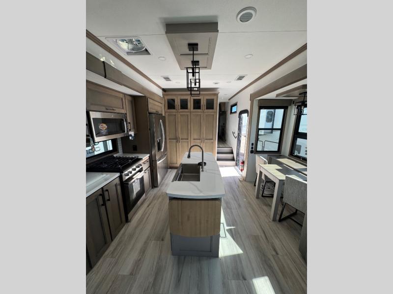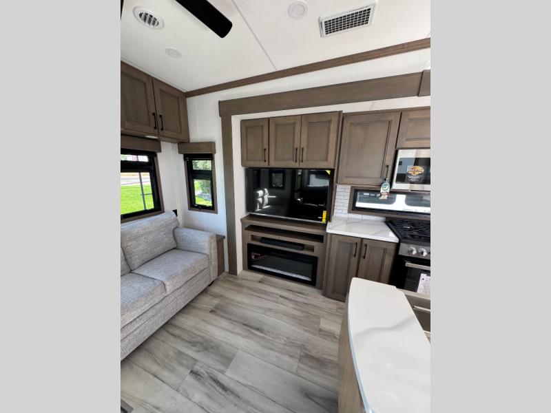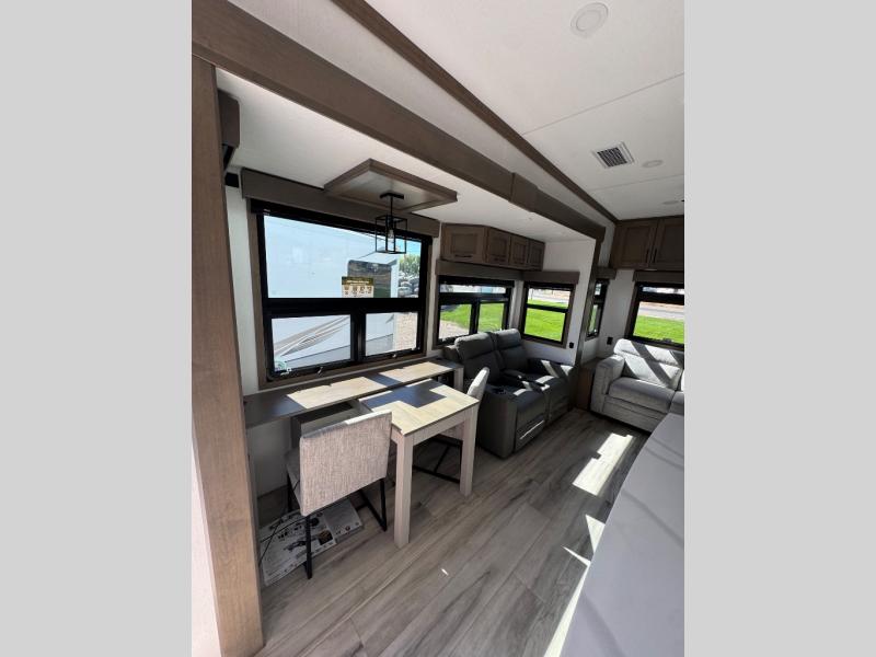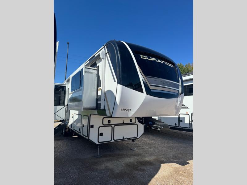 Camp wherever you want and stay as long as you desire with this full-time fifth wheel! You will love the spacious interior which includes a front bedroom with an electric tilt king bed slide with drawers underneath, a front wardrobe with washer and dryer prep, a closet with a built-in hamper, plus a slide out dresser with 32" Smart LED TV above. The full bathroom offers a residential shower with a seat plus linen storage, and the kitchen gives the cook a dream kitchen that includes a farmhouse stainless steel sink and dishwasher in the center island, a 26 cu. ft. house refrigerator with a 2,000W inverter, and more. The 50" Smart LED TV with a fireplace below can be seen from the sliding table / desk and chairs, the comfortable theater seats and the hide-a-bed sofa. Yet you might like to add the 10' 6" awning option, and there are more options to customize your Durango Gold.