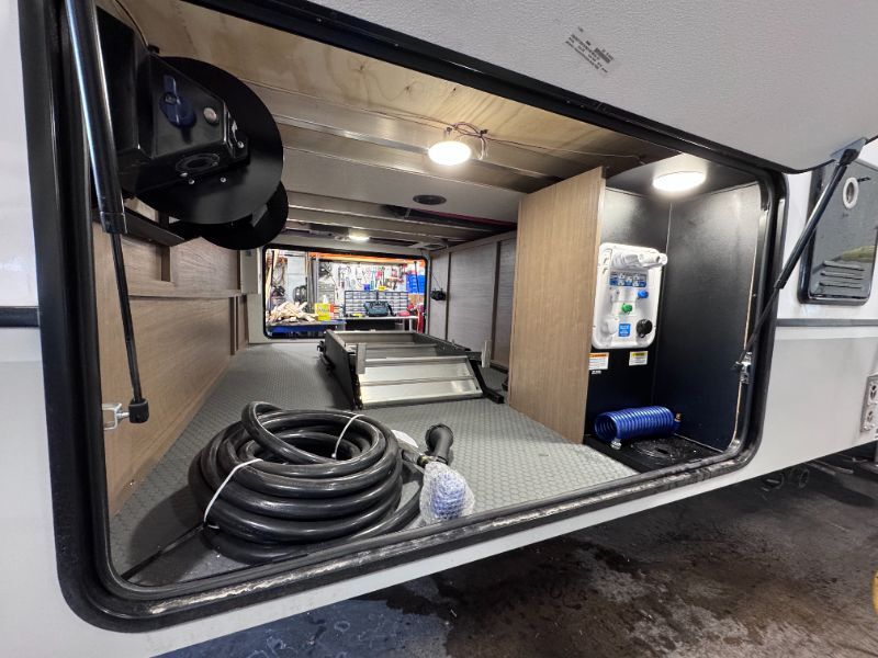 The unique patio deck on this Durango Gold offers a raised area to enjoy the great outdoors at a tailgate event, a big race, or just because you want this type of living space. You can also relax outside near the main entry under the 17' electric awning with an LED light strip. Back inside, you will love relaxing in the main living and kitchen area while you watch the 50" Smart LED TV with a fireplace below it while sitting in the chairs or on the hide-a-bed sofa which offers more sleeping space. The sliding table / desk and chairs is a great place to dine, or you can choose the full-timer's desk option if you need to work on occasion. The cook will love all their amenities including the kitchen island with a farmhouse stainless steel sink, the solid surface countertops, and the hutch next to the pantry. The master bedroom is up front just beyond the full bathroom which includes a residential shower with a seat and linen storage. The bedroom provides an electric tilt king bed slide for more floor space and has drawers underneath the bed. You will find another slide with a dresser and the 32" Smart LED TV, which brings the total number of slide outs to four in this model!