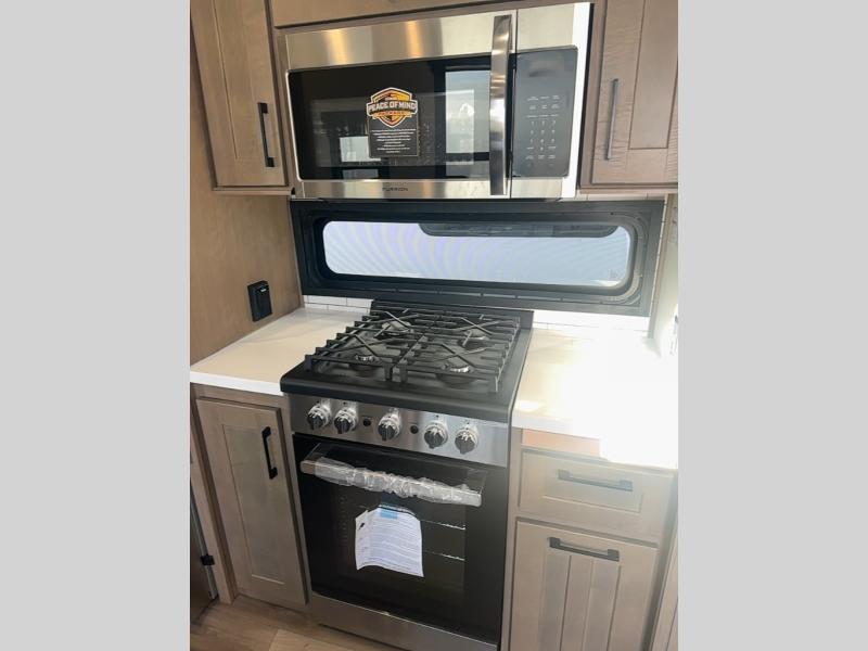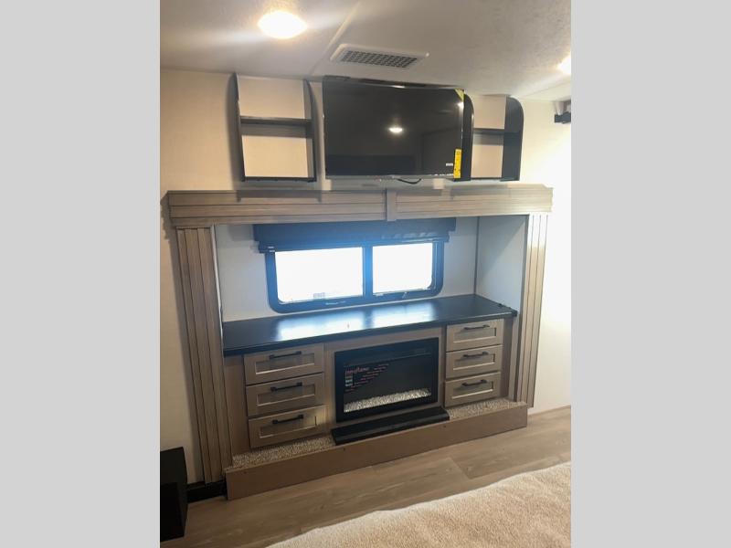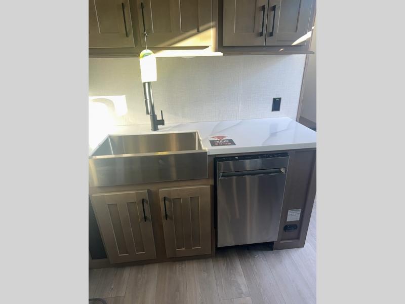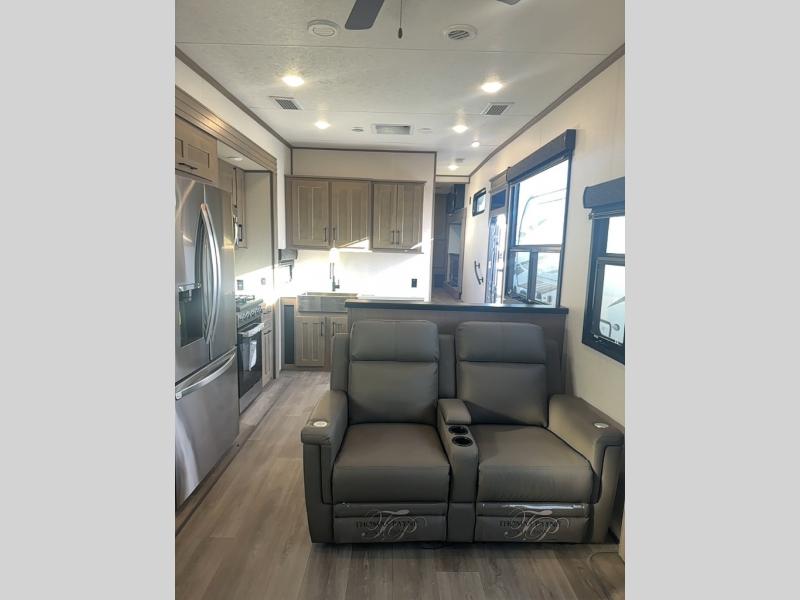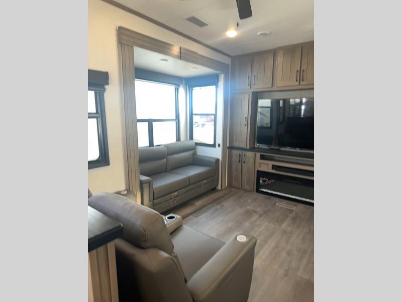 Enjoy a home away from home with this fifth wheel! The front private bedroom has an electric tilt king bed slide for extra comfort, a dresser with a TV, and a front closet with washer and dryer prep next to a built-in hamper so it will be easy to transfer your dirty clothes into the washer. Freshen up each morning in the full bathroom with the 48" x 30" residential shower with a seat. The chef will love cooking in the kitchen with the four burner range with 24" oven and love the dishwasher even more for easy clean ups. There is also a table with booth seating on one side and two chairs on the other to enjoy your meals. You could even cook at the outside griddle too. The rear living area offers a comfortable place to socialize together at night while relaxing on either one of the opposing hide-a-bed sofa slides or the theater seating with USB ports across from the 65" TV with 48" fireplace!