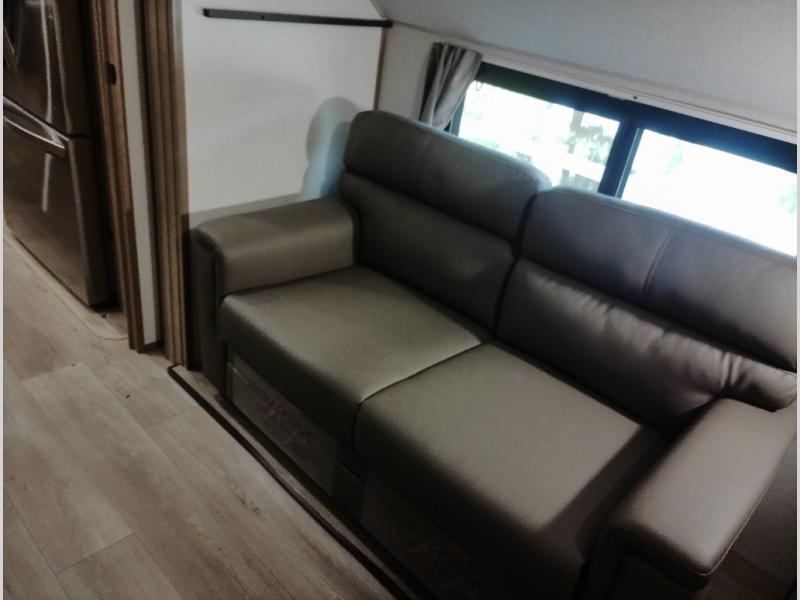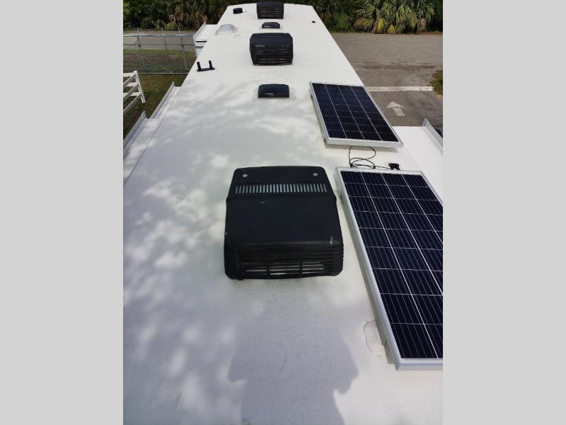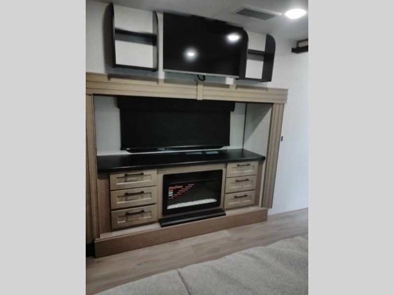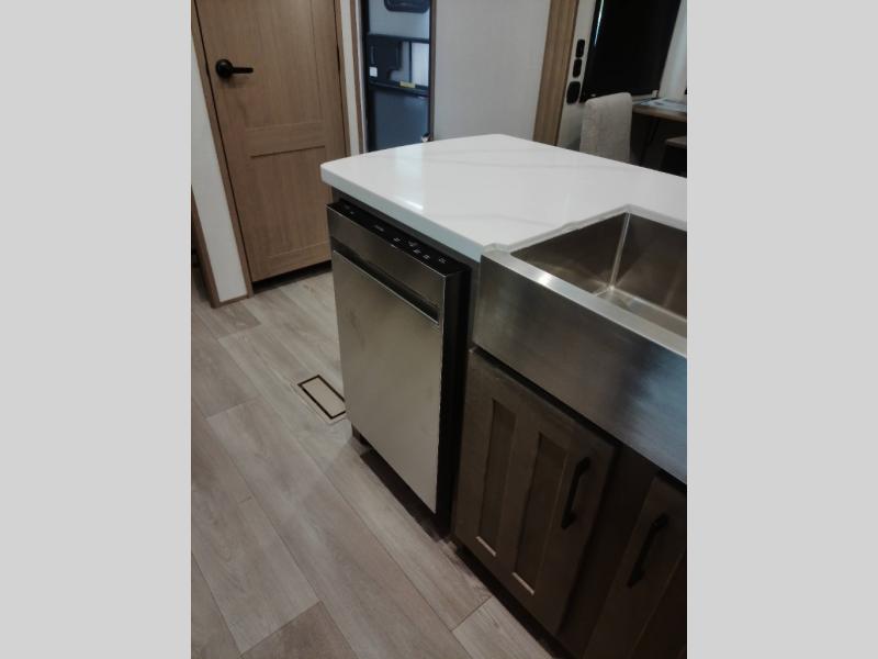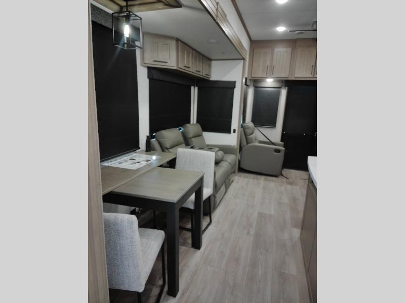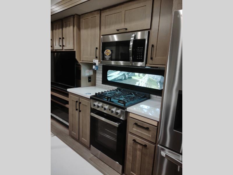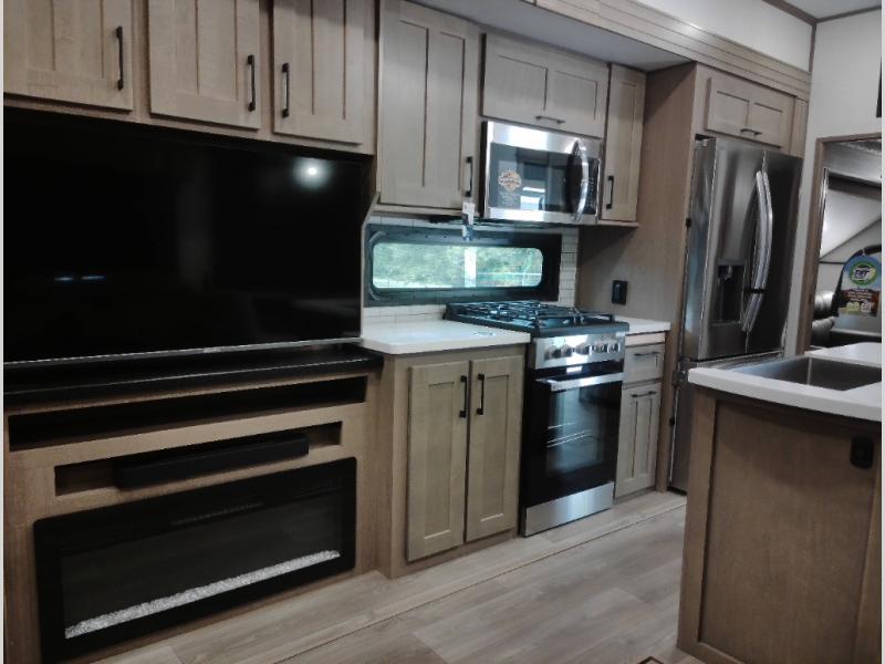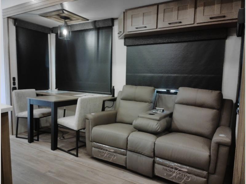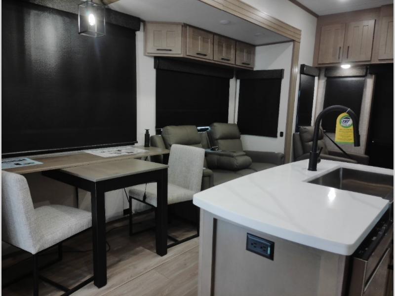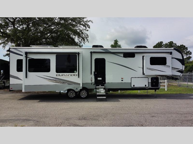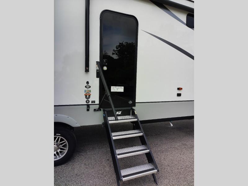 With any KZ Durango Gold full-time luxury fifth wheel, you will enjoy the new Blancher Cherry cabinetry, stainless steel appliances such as a 30" convection microwave and 24" oven with a four burner range, plus a stainless dishwasher. Other top features include an electric tilt bed with Serta Comfort foam king mattress, two 15K A/C units, plus theater seating with powered recline, heat and massage features. You will also appreciate a handy central vacuum system with attachments that stores out of sight. Each Durango Gold is constructed with six-sided aluminum framing, and has a heated, insulated and an enclosed underbelly. It is also constructed with Tufflex roofing material which is flexible, puncture resistant, and reflective. The now standard "Off The Grid" solar package includes two 200W solar panels, a 30A MPPT solar charge controller, and a 2,000W True Sine Wave inverter for off-grid capabilities. If you're wanting to go completely off-grid, you might want to choose the optional Boondocker Solar System with even more features that won't require you to be close to electric hookups!