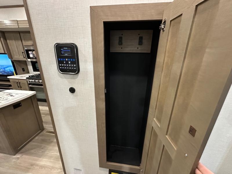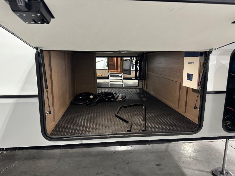 With any KZ Durango Gold full-time luxury fifth wheel, you will enjoy the new Blancher Cherry cabinetry, stainless steel appliances such as a 30" convection microwave and 24" oven with a four burner range, plus a stainless dishwasher. Other top features include an electric tilt bed with Serta Comfort foam king mattress, two 15K A/C units, plus theater seating with powered recline, heat and massage features. You will also appreciate a handy central vacuum system with attachments that stores out of sight. Each Durango Gold is constructed with six-sided aluminum framing, and has a heated, insulated and an enclosed underbelly. It is also constructed with Tufflex roofing material which is flexible, puncture resistant, and reflective. The now standard "Off The Grid" solar package includes two 200W solar panels, a 30A MPPT solar charge controller, and a 2,000W True Sine Wave inverter for off-grid capabilities. If you're wanting to go completely off-grid, you might want to choose the optional Boondocker Solar System with even more features that won't require you to be close to electric hookups!