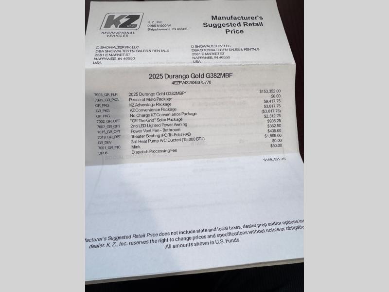 New 2025 KZ Durango Gold G382MBF Fifth Wheel