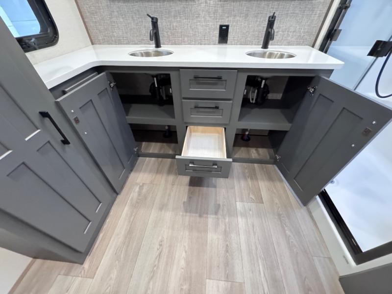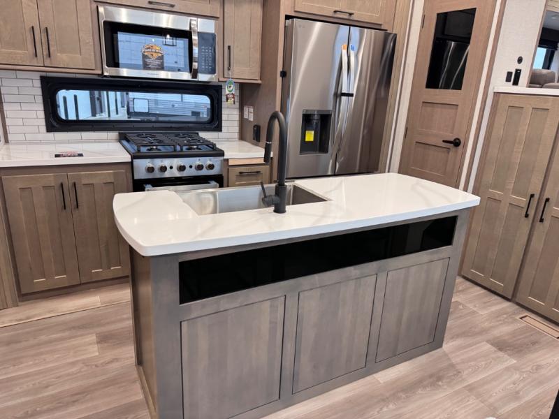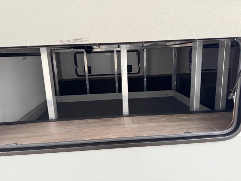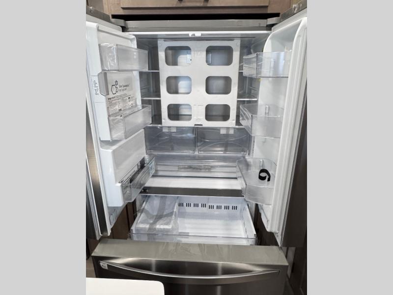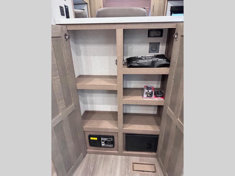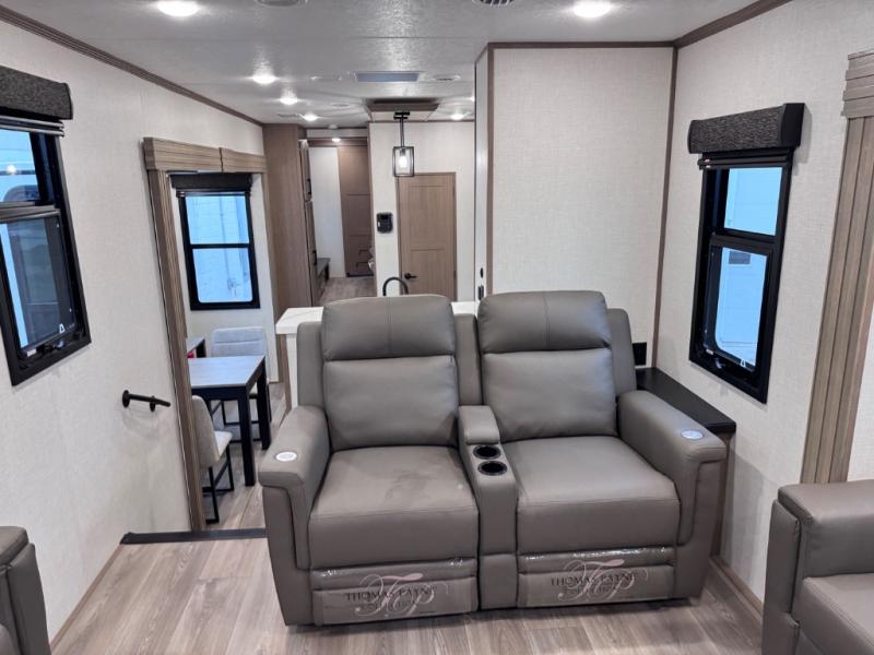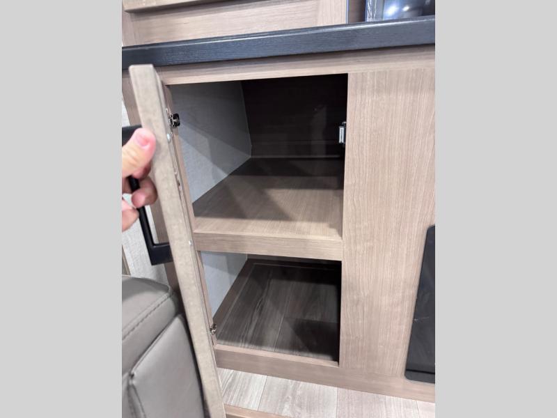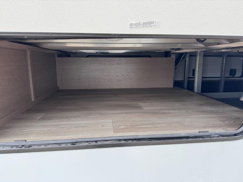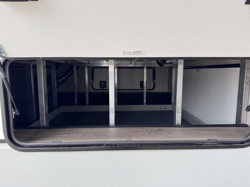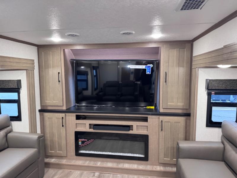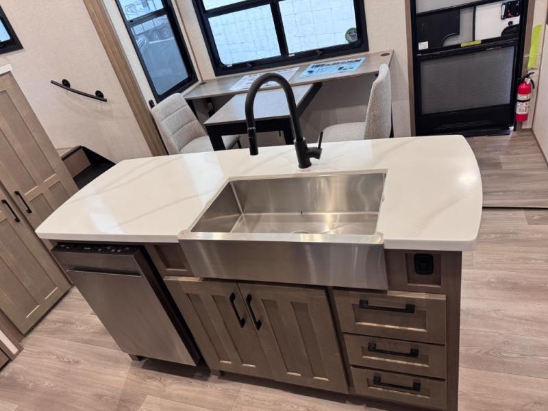 Fall in love with this unit kitchen with residential appliances, a farmhouse stainless steel sink, a dishwasher, a pantry, a 26 cu refrigerator, and a sliding table/desk with chairs. Spend cozy entertainment nights watching the 65" LED TV with a fireplace below, a theater seating with USB ports, and two hide-a-bed sofa slides that widen this area so everyone can stretch out and relax. At night, retire to your private bedroom with a king electric tilt bed with drawers underneath, a front wardrobe, a 32" Smart LED TV, and, a closet, perfect for easy organization. Also, the full rear bathroom provides a residential shower with a seat plus linen storage, washer and dryer prep, and two sinks for more convenience. This model is fitted with a pass-through storage ideal for store your things.