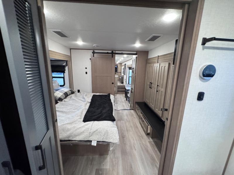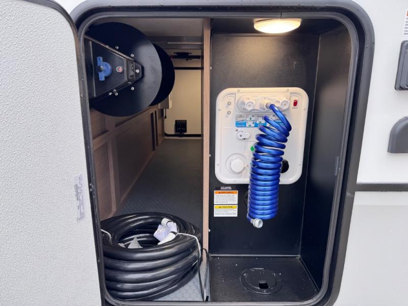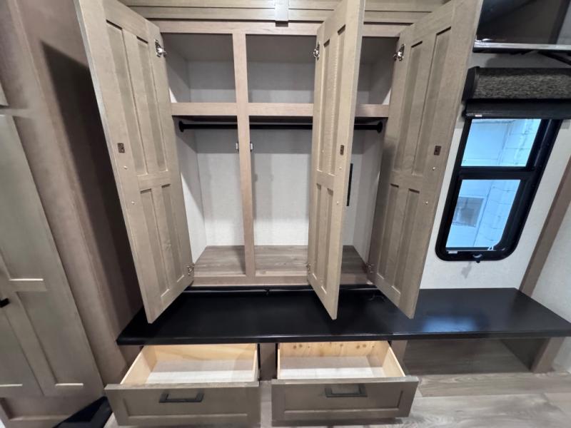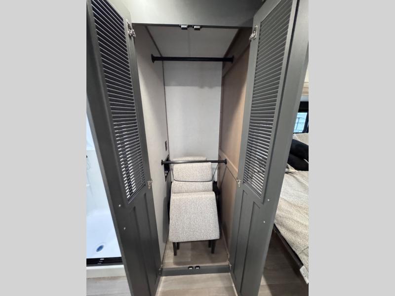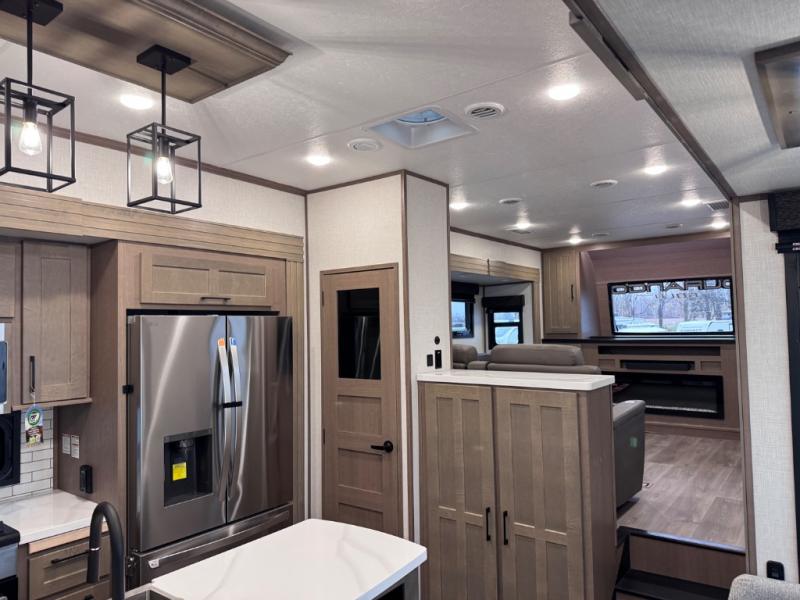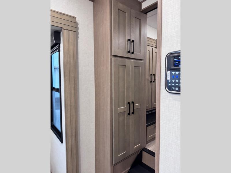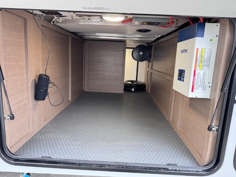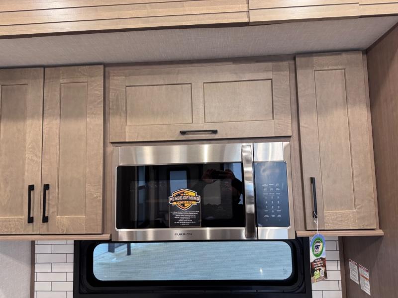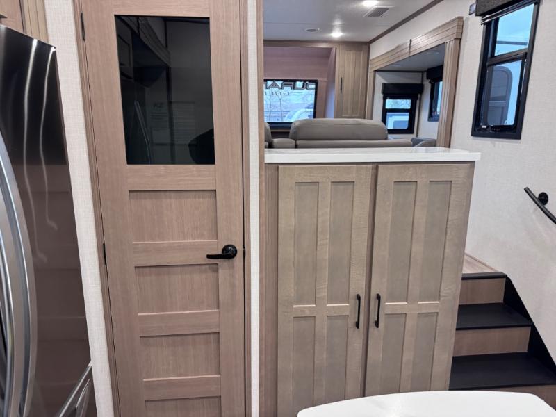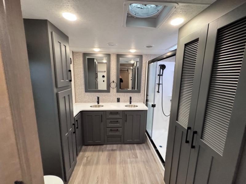 Fall in love with this unit kitchen with residential appliances, a farmhouse stainless steel sink, a dishwasher, a pantry, a 26 cu refrigerator, and a sliding table/desk with chairs. Spend cozy entertainment nights watching the 65" LED TV with a fireplace below, a theater seating with USB ports, and two hide-a-bed sofa slides that widen this area so everyone can stretch out and relax. At night, retire to your private bedroom with a king electric tilt bed with drawers underneath, a front wardrobe, a 32" Smart LED TV, and, a closet, perfect for easy organization. Also, the full rear bathroom provides a residential shower with a seat plus linen storage, washer and dryer prep, and two sinks for more convenience. This model is fitted with a pass-through storage ideal for store your things.
