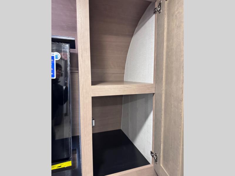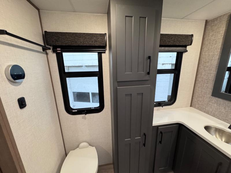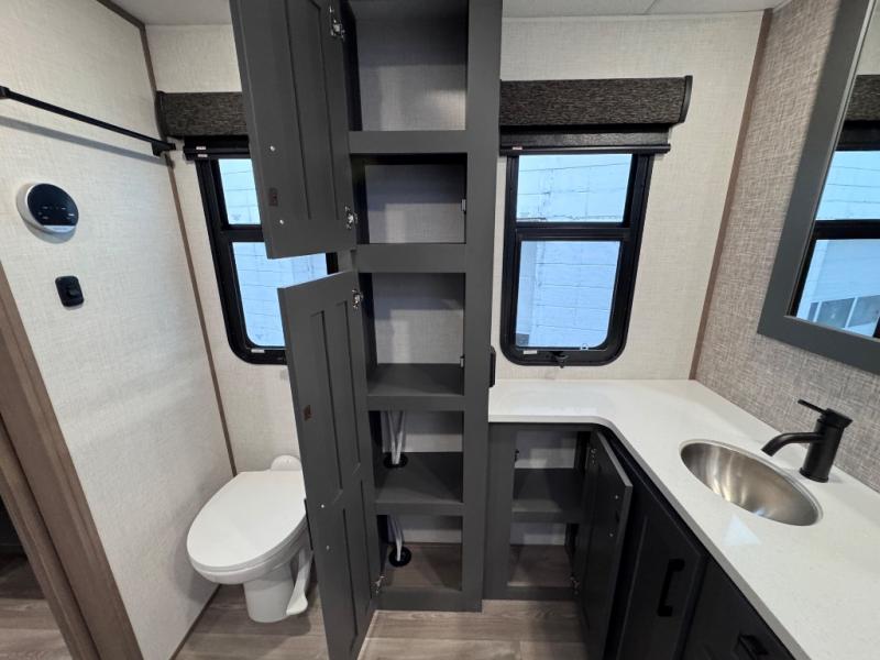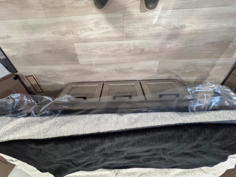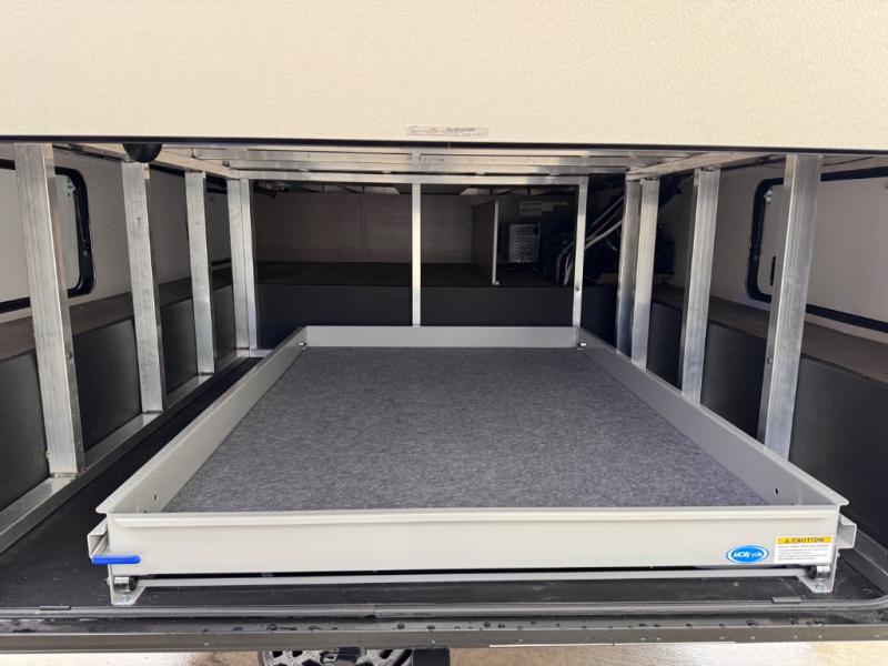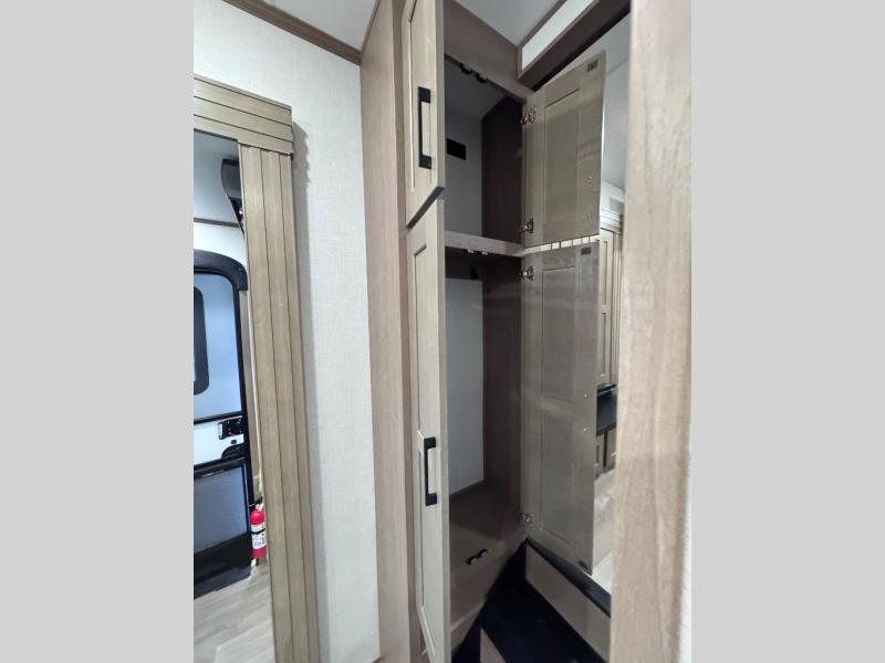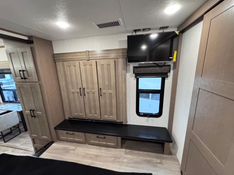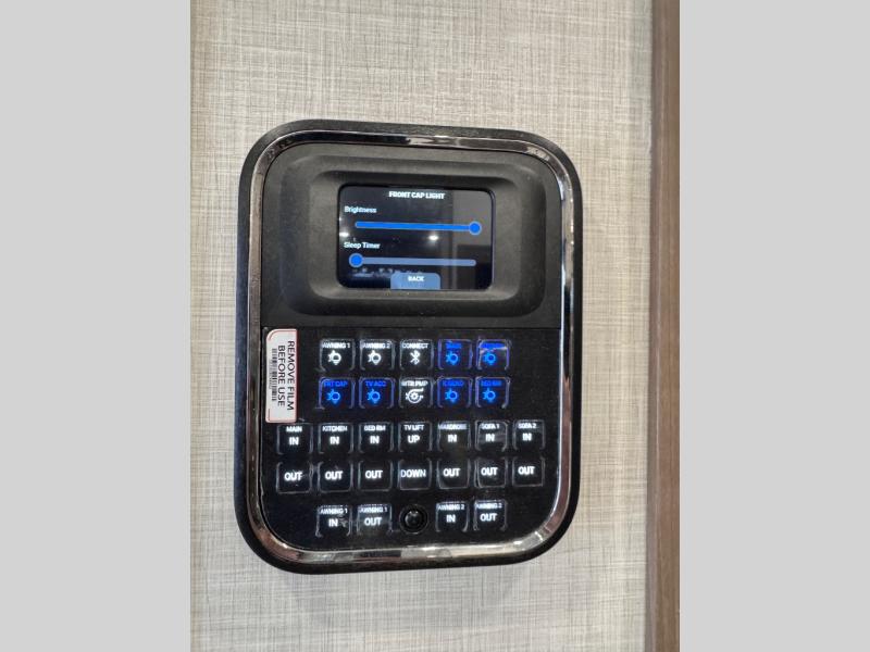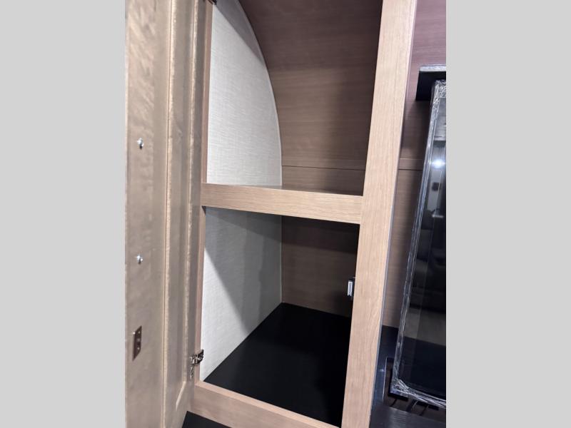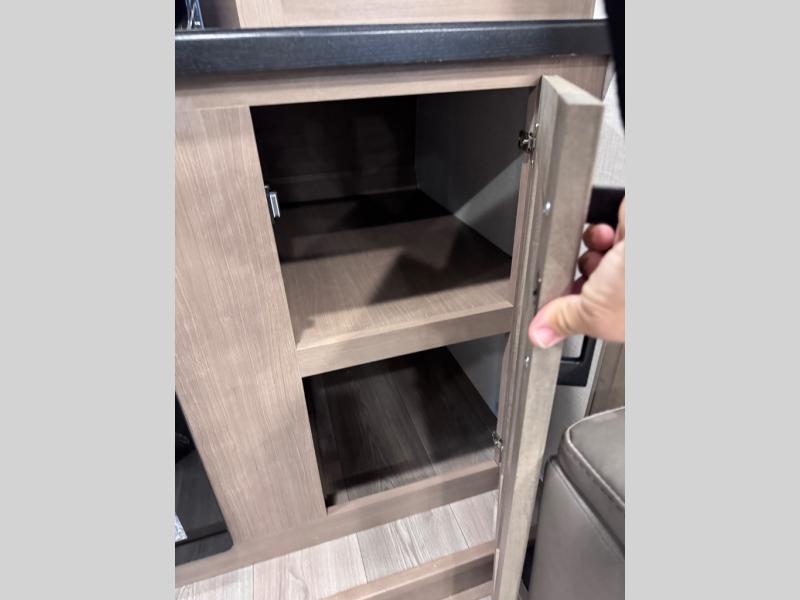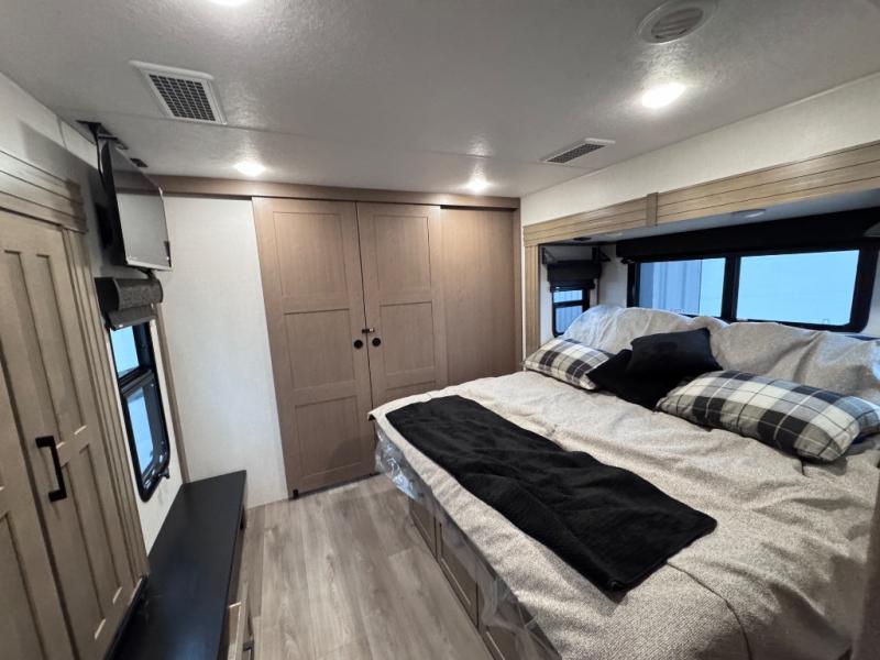 Fall in love with this unit kitchen with residential appliances, a farmhouse stainless steel sink, a dishwasher, a pantry, a 26 cu refrigerator, and a sliding table/desk with chairs. Spend cozy entertainment nights watching the 65" LED TV with a fireplace below, a theater seating with USB ports, and two hide-a-bed sofa slides that widen this area so everyone can stretch out and relax. At night, retire to your private bedroom with a king electric tilt bed with drawers underneath, a front wardrobe, a 32" Smart LED TV, and, a closet, perfect for easy organization. Also, the full rear bathroom provides a residential shower with a seat plus linen storage, washer and dryer prep, and two sinks for more convenience. This model is fitted with a pass-through storage ideal for store your things.