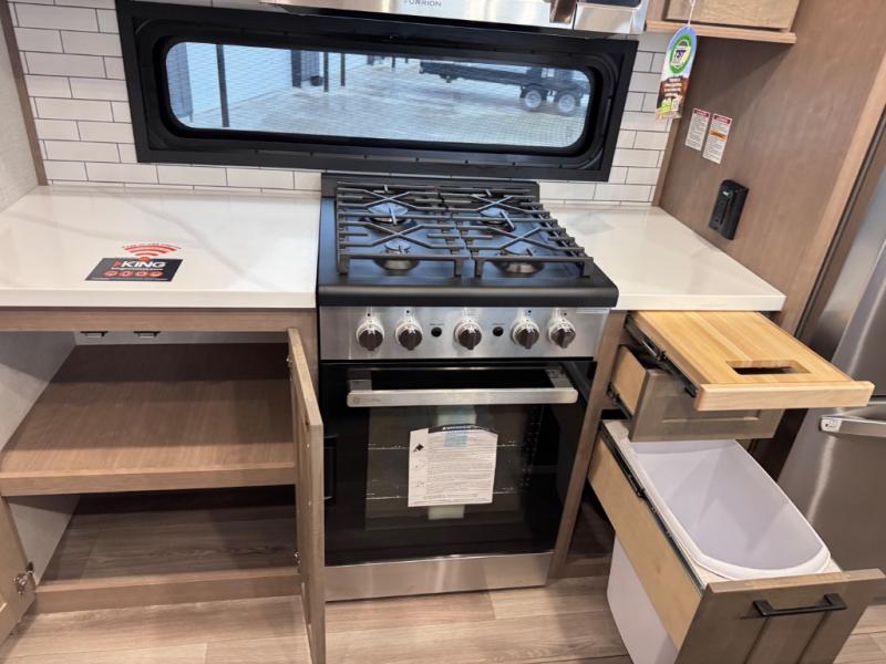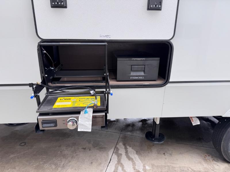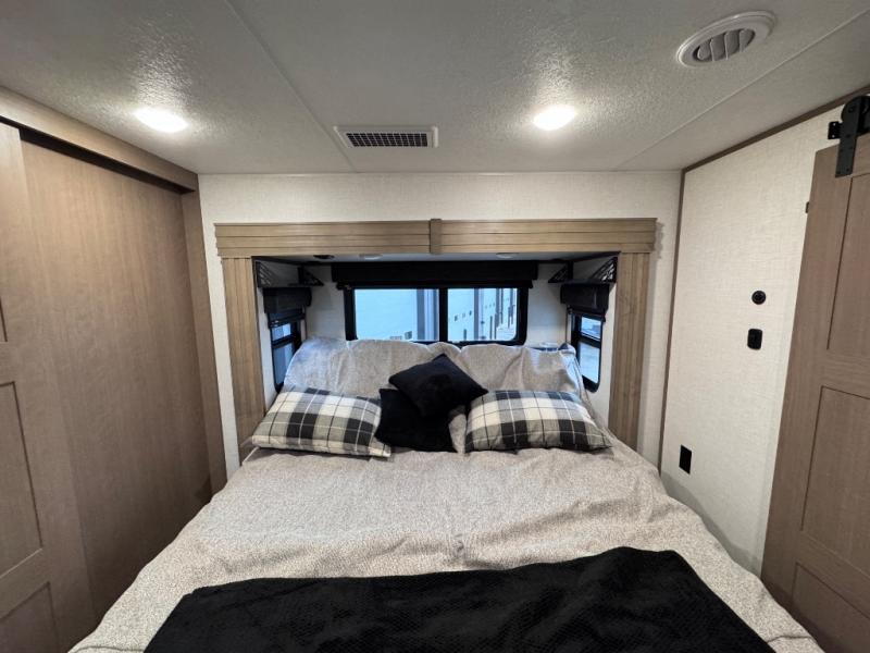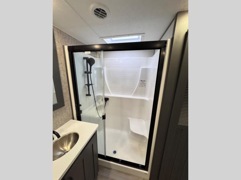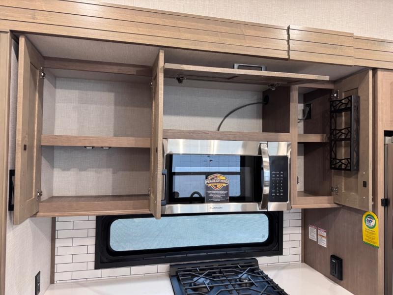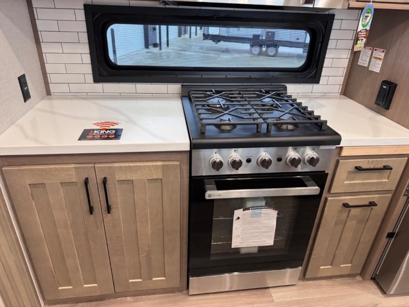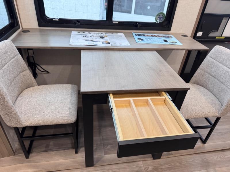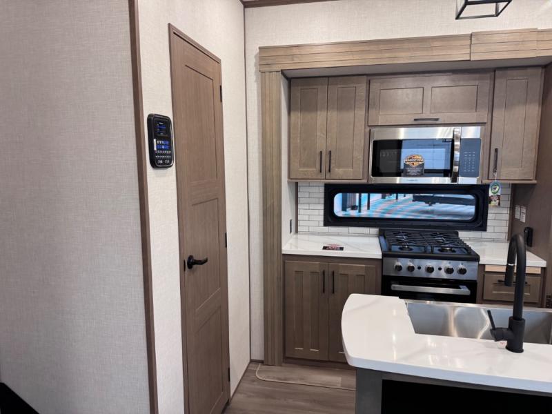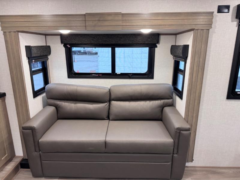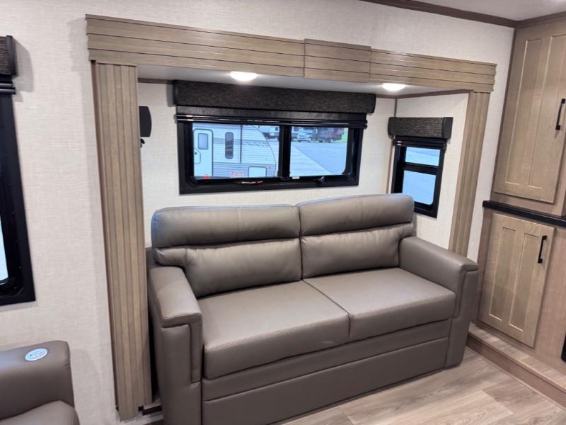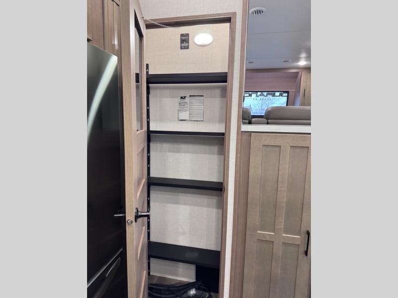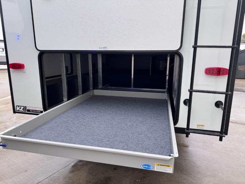 With any KZ Durango Gold full-time luxury fifth wheel, you will enjoy the new Blancher Cherry cabinetry, stainless steel appliances such as a 30" convection microwave and 24" oven with a four burner range, plus a stainless dishwasher. Other top features include an electric tilt bed with Serta Comfort foam king mattress, two 15K A/C units, plus theater seating with powered recline, heat and massage features. You will also appreciate a handy central vacuum system with attachments that stores out of sight. Each Durango Gold is constructed with six-sided aluminum framing, and has a heated, insulated and an enclosed underbelly. It is also constructed with Tufflex roofing material which is flexible, puncture resistant, and reflective. The now standard "Off The Grid" solar package includes two 200W solar panels, a 30A MPPT solar charge controller, and a 2,000W True Sine Wave inverter for off-grid capabilities. If you're wanting to go completely off-grid, you might want to choose the optional Boondocker Solar System with even more features that won't require you to be close to electric hookups!
