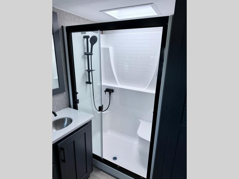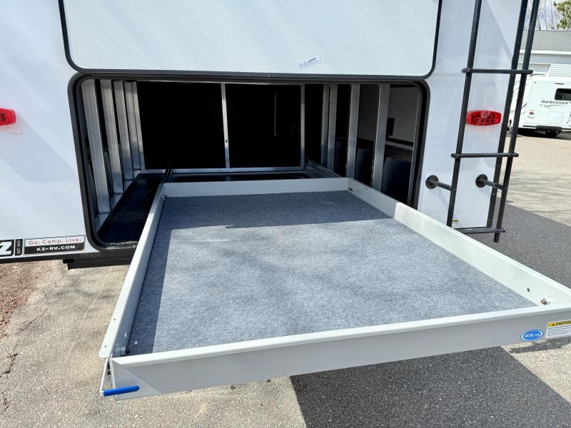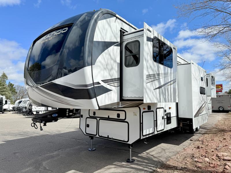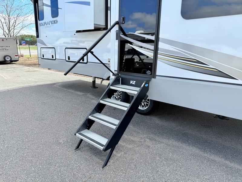 With any KZ Durango Gold full-time luxury fifth wheel, you will enjoy the new Blancher Cherry cabinetry, stainless steel appliances such as a 30" convection microwave and 24" oven with a four burner range, plus a stainless dishwasher. Other top features include an electric tilt bed with Serta Comfort foam king mattress, two 15K A/C units, plus theater seating with powered recline, heat and massage features. You will also appreciate a handy central vacuum system with attachments that stores out of sight. Each Durango Gold is constructed with six-sided aluminum framing, and has a heated, insulated and an enclosed underbelly. It is also constructed with Tufflex roofing material which is flexible, puncture resistant, and reflective. The now standard "Off The Grid" solar package includes two 200W solar panels, a 30A MPPT solar charge controller, and a 2,000W True Sine Wave inverter for off-grid capabilities. If you're wanting to go completely off-grid, you might want to choose the optional Boondocker Solar System with even more features that won't require you to be close to electric hookups!