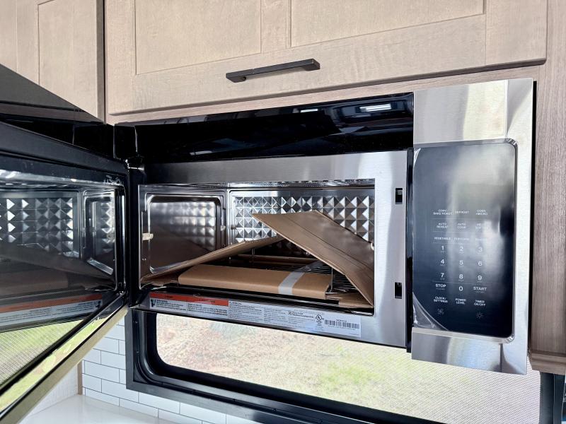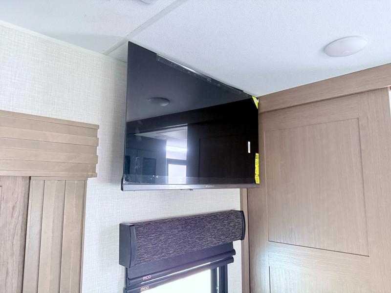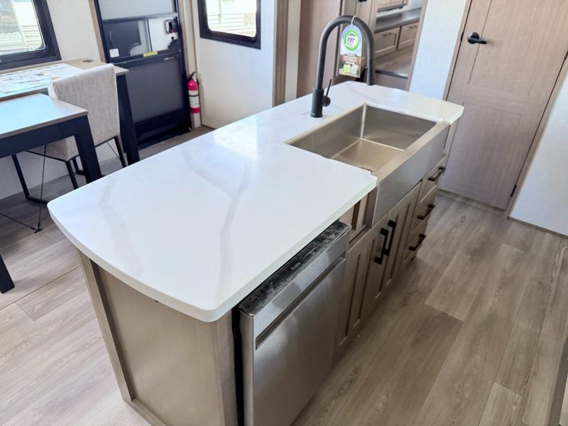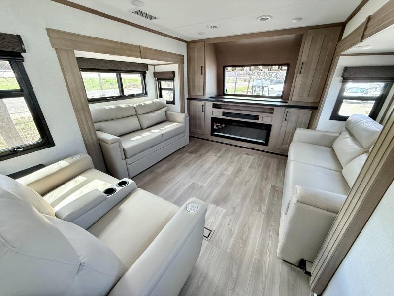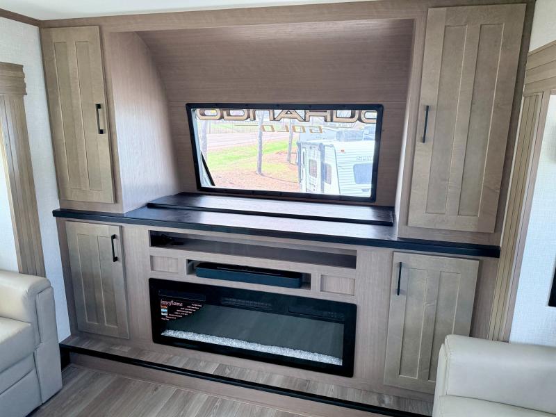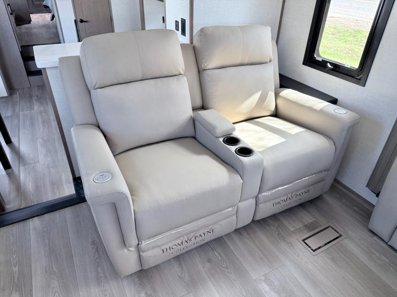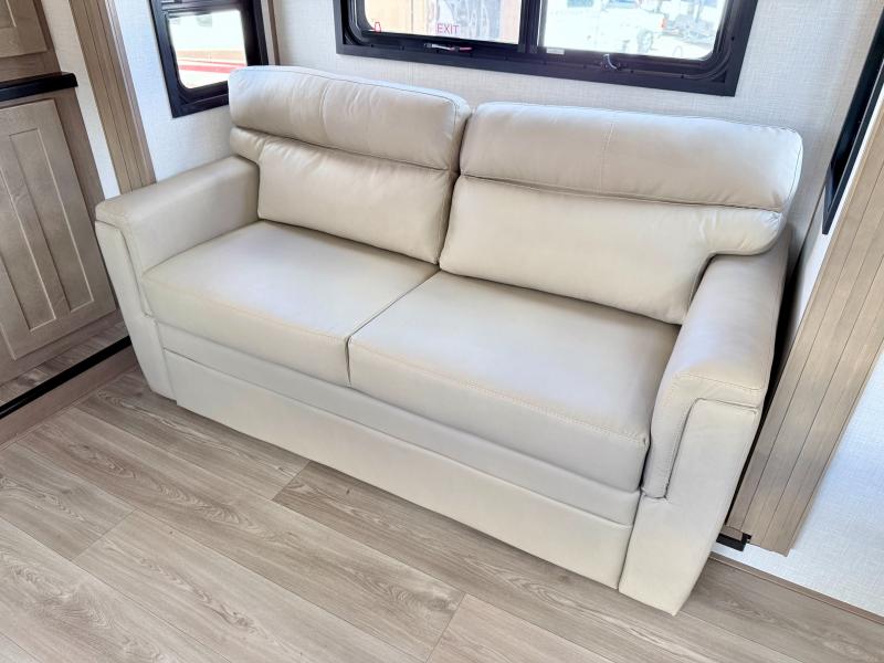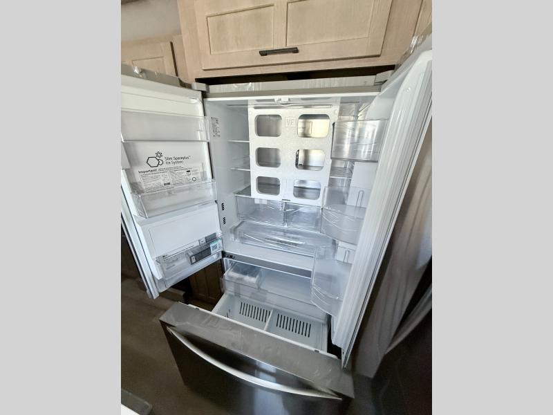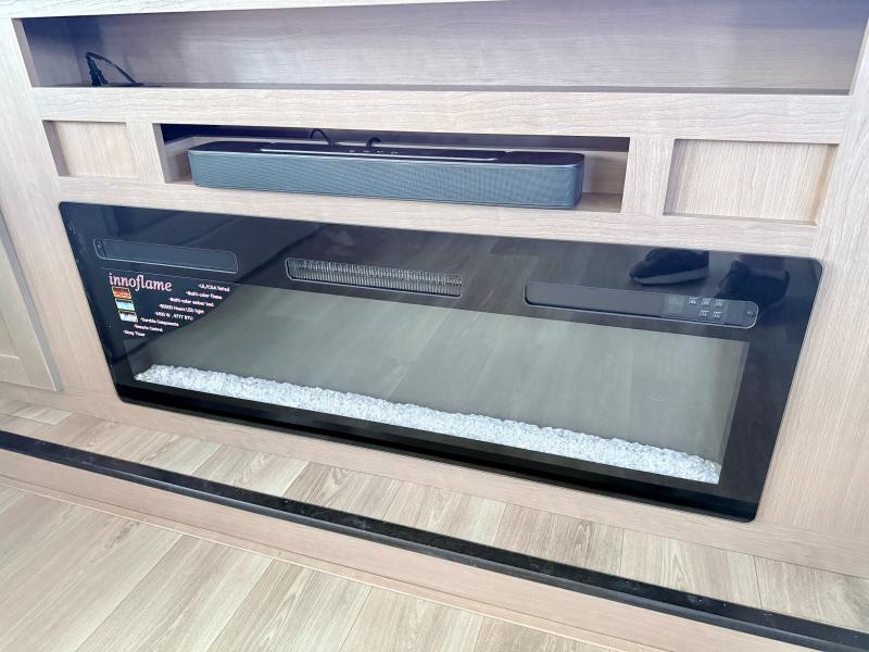 Fall in love with this unit kitchen with residential appliances, a farmhouse stainless steel sink, a dishwasher, a pantry, a 26 cu refrigerator, and a sliding table/desk with chairs. Spend cozy entertainment nights watching the 65" LED TV with a fireplace below, a theater seating with USB ports, and two hide-a-bed sofa slides that widen this area so everyone can stretch out and relax. At night, retire to your private bedroom with a king electric tilt bed with drawers underneath, a front wardrobe, a 32" Smart LED TV, and, a closet, perfect for easy organization. Also, the full rear bathroom provides a residential shower with a seat plus linen storage, washer and dryer prep, and two sinks for more convenience. This model is fitted with a pass-through storage ideal for store your things.
