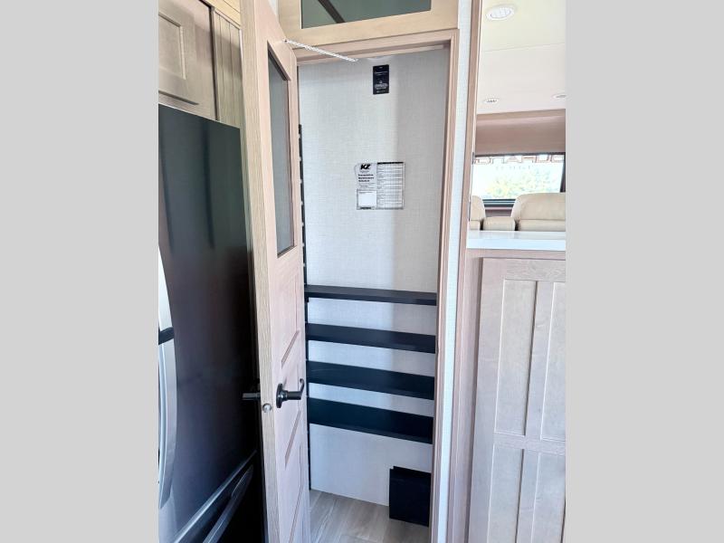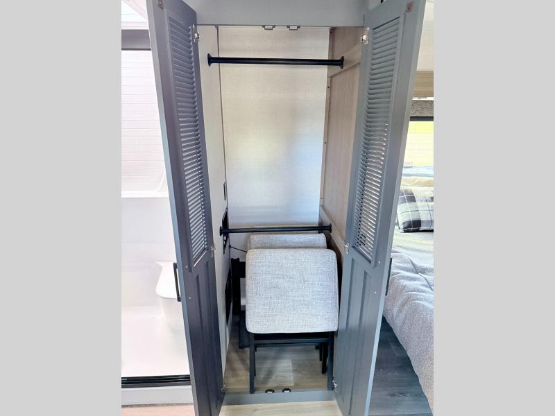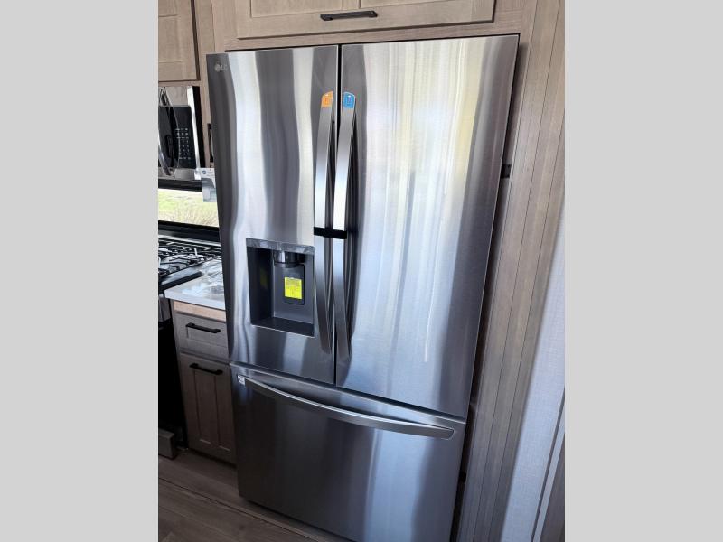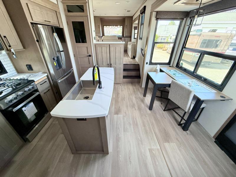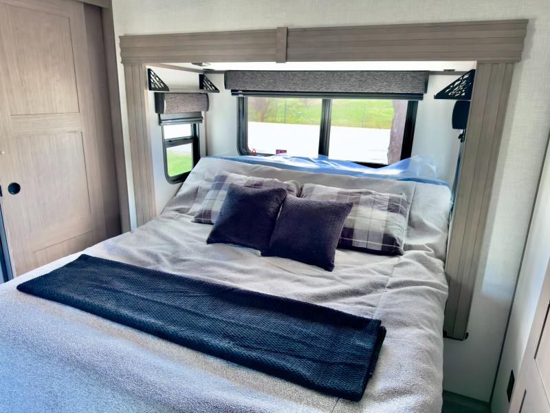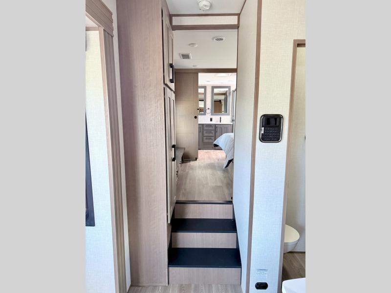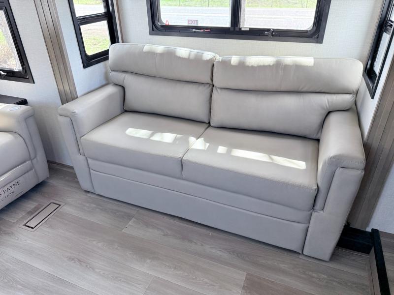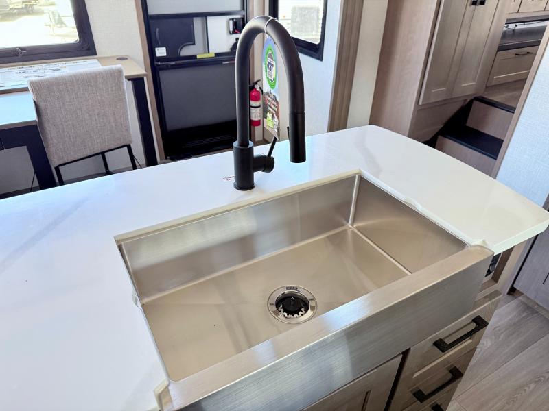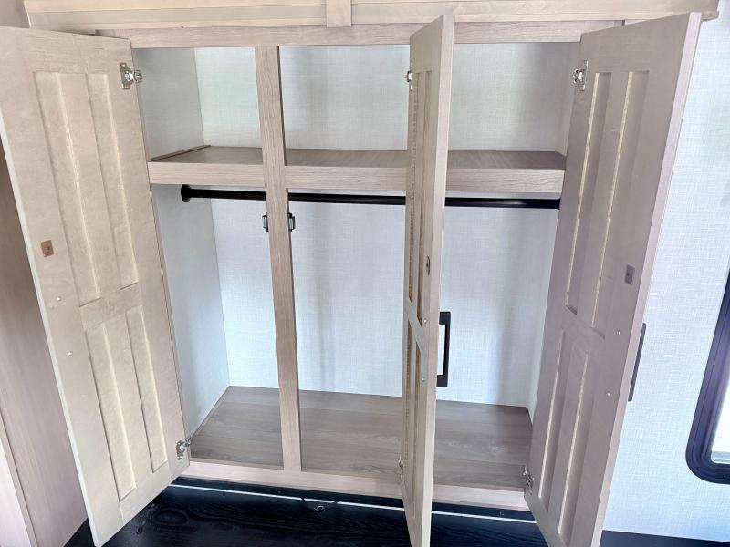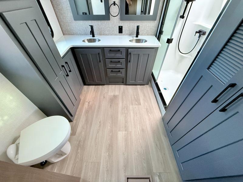 Fall in love with this unit kitchen with residential appliances, a farmhouse stainless steel sink, a dishwasher, a pantry, a 26 cu refrigerator, and a sliding table/desk with chairs. Spend cozy entertainment nights watching the 65" LED TV with a fireplace below, a theater seating with USB ports, and two hide-a-bed sofa slides that widen this area so everyone can stretch out and relax. At night, retire to your private bedroom with a king electric tilt bed with drawers underneath, a front wardrobe, a 32" Smart LED TV, and, a closet, perfect for easy organization. Also, the full rear bathroom provides a residential shower with a seat plus linen storage, washer and dryer prep, and two sinks for more convenience. This model is fitted with a pass-through storage ideal for store your things.