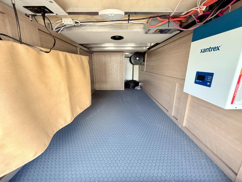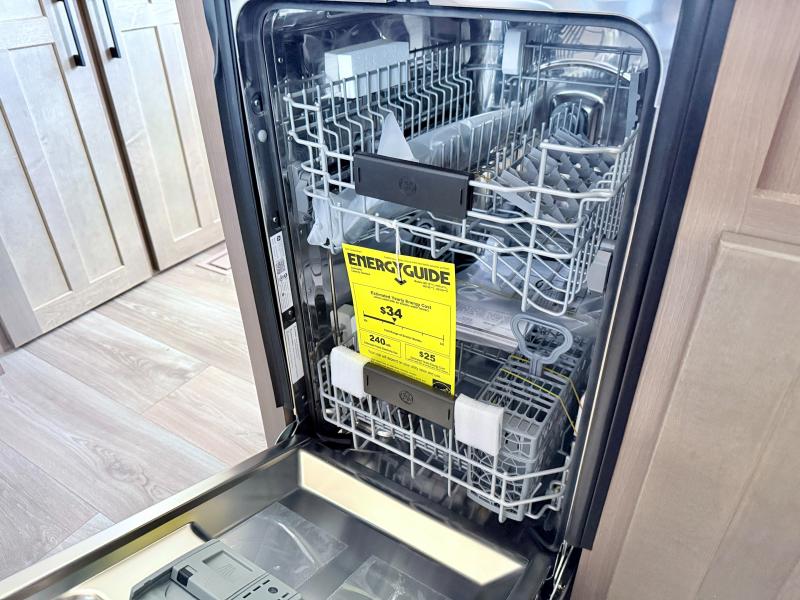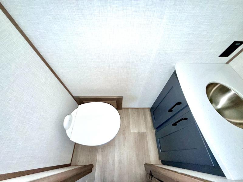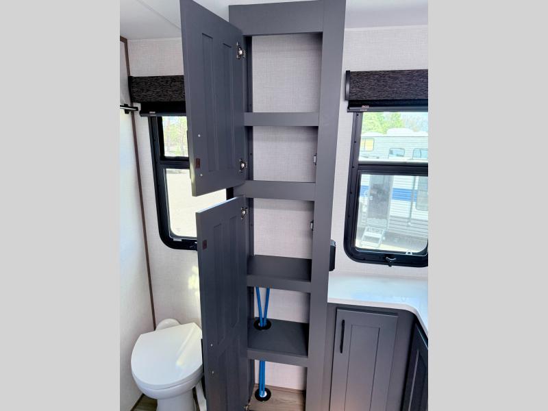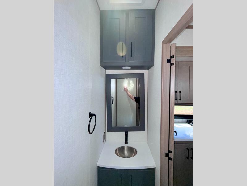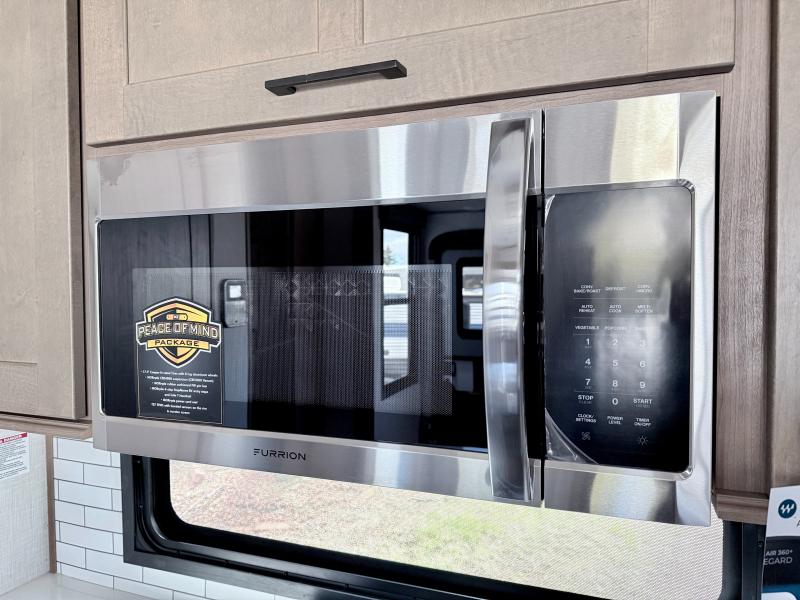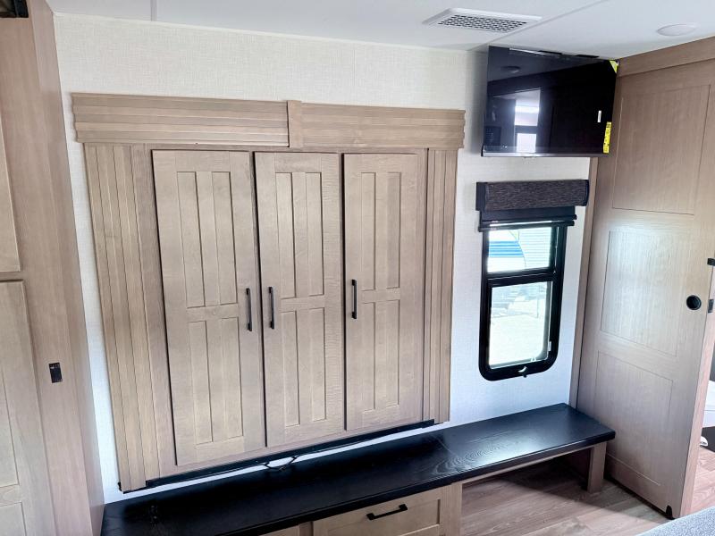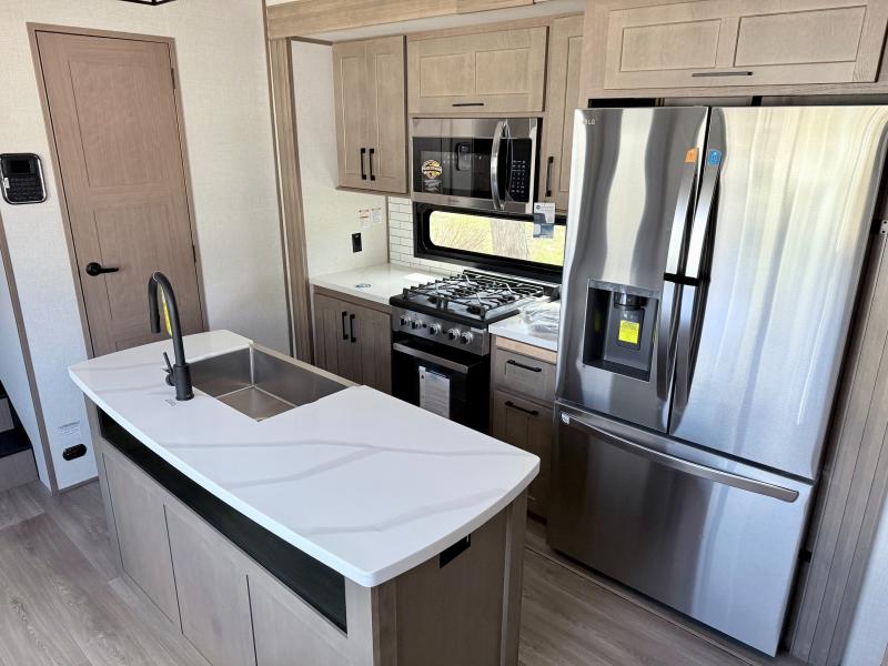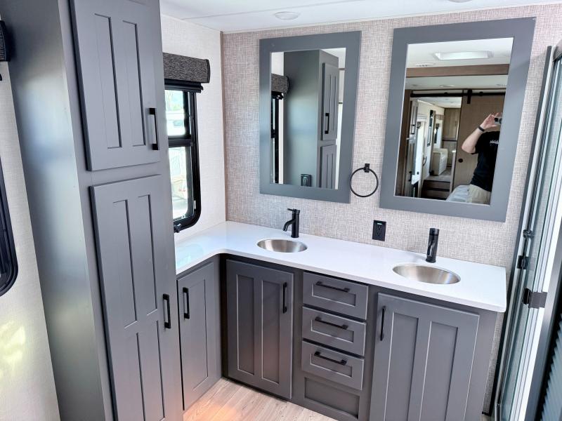 Fall in love with this unit kitchen with residential appliances, a farmhouse stainless steel sink, a dishwasher, a pantry, a 26 cu refrigerator, and a sliding table/desk with chairs. Spend cozy entertainment nights watching the 65" LED TV with a fireplace below, a theater seating with USB ports, and two hide-a-bed sofa slides that widen this area so everyone can stretch out and relax. At night, retire to your private bedroom with a king electric tilt bed with drawers underneath, a front wardrobe, a 32" Smart LED TV, and, a closet, perfect for easy organization. Also, the full rear bathroom provides a residential shower with a seat plus linen storage, washer and dryer prep, and two sinks for more convenience. This model is fitted with a pass-through storage ideal for store your things.