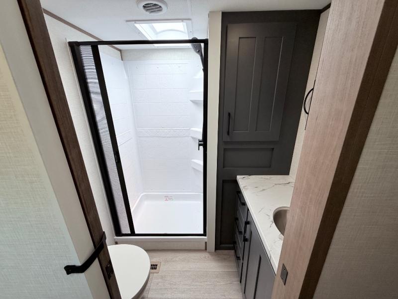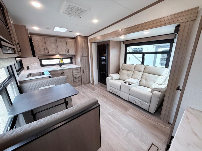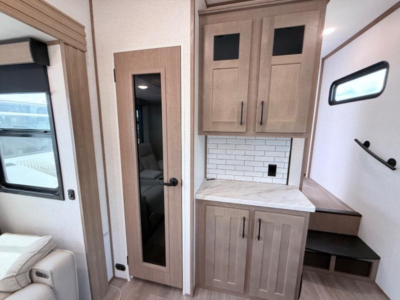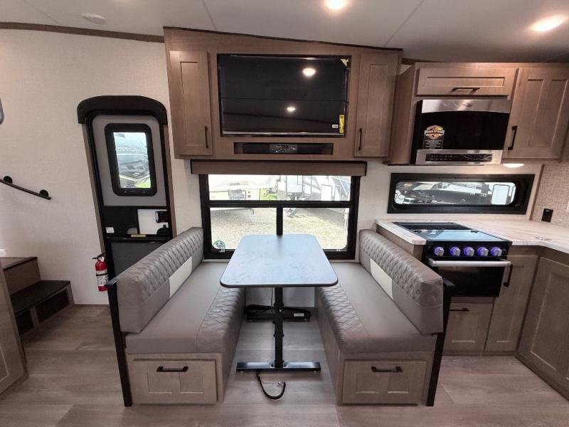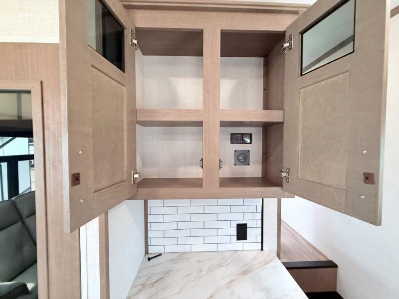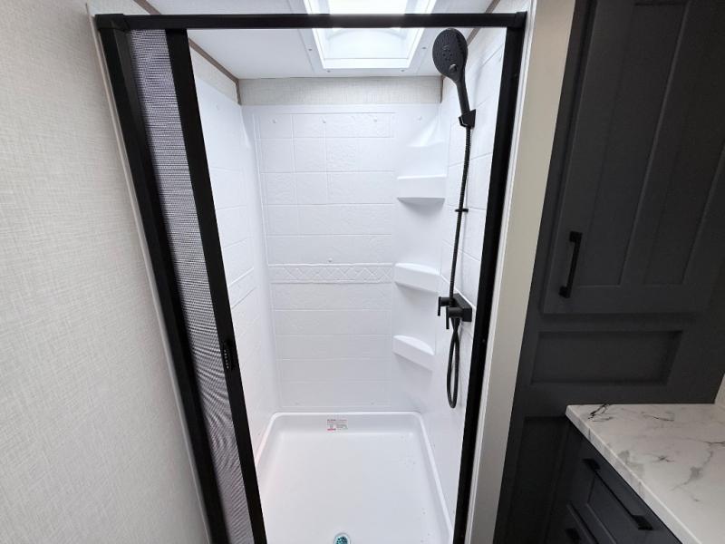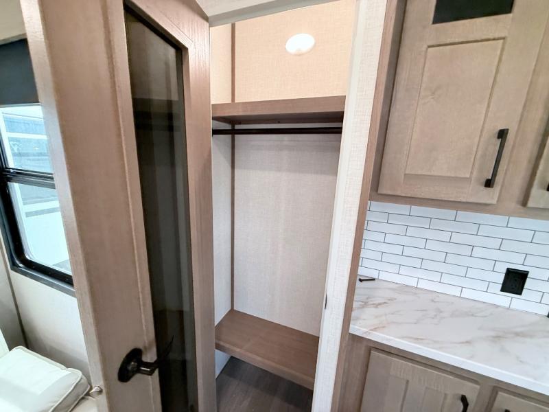This fifth wheel has everything you need and more. Retreat to the serene bedroom, featuring a queen bed, spacious wardrobe, and washer/dryer prep for effortless laundry days. The kitchen is equipped with a pantry, 12-cu. refrigerator, and microwave for quick and easy meal prep. Enjoy meals with family and friends at the dinette, which features an EZ-adjustable table for customizable comfort. The living room boasts an entertainment center, hutch, and coat closet for ample storage. Relax in style in the full bathroom, featuring a spacious 36” x 30” shower. Finally, enjoy the convenience of pass-thru storage and stay in touch with nature under the shade of the 16“awning.
