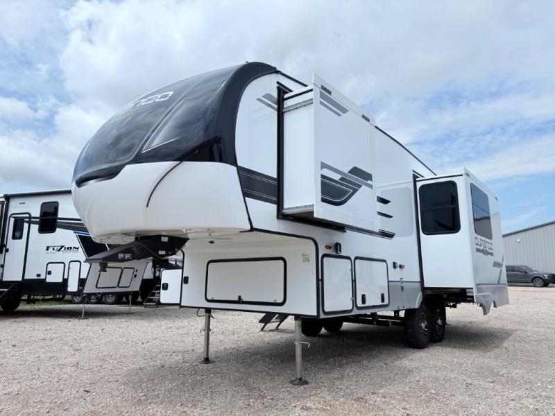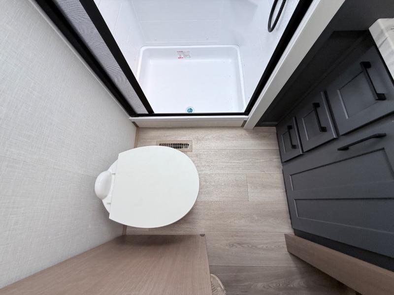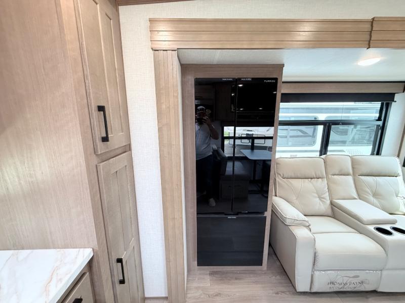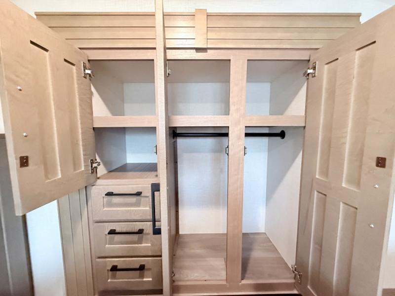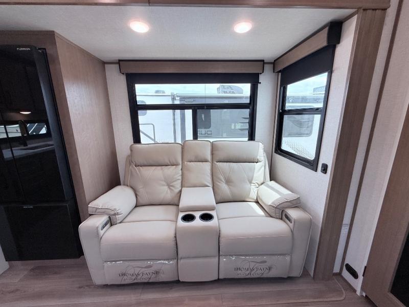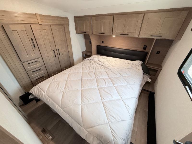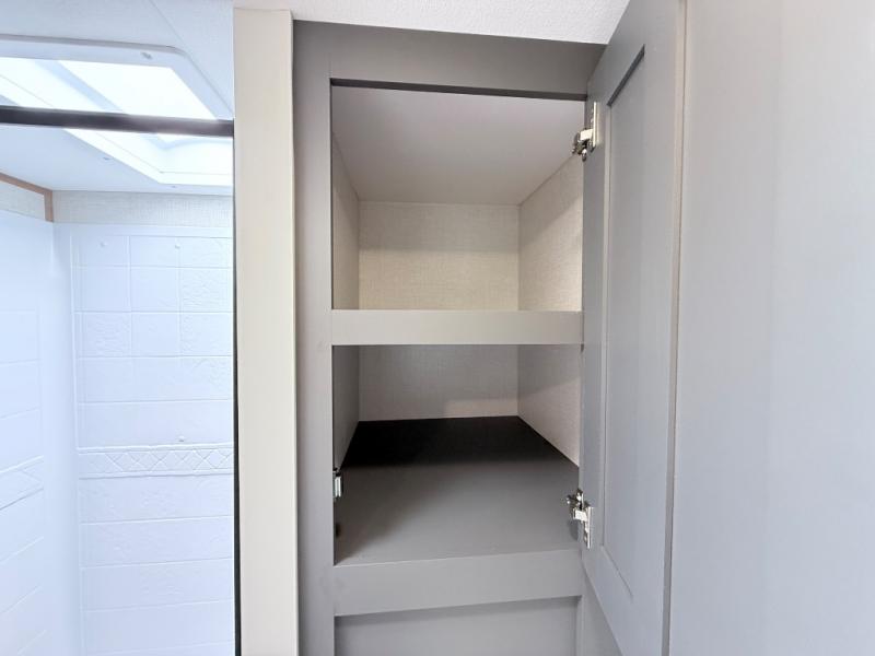 This fifth wheel has everything you need and more. Retreat to the serene bedroom, featuring a queen bed, spacious wardrobe, and washer/dryer prep for effortless laundry days. The kitchen is equipped with a pantry, 12-cu. refrigerator, and microwave for quick and easy meal prep. Enjoy meals with family and friends at the dinette, which features an EZ-adjustable table for customizable comfort. The living room boasts an entertainment center, hutch, and coat closet for ample storage. Relax in style in the full bathroom, featuring a spacious 36” x 30” shower. Finally, enjoy the convenience of pass-thru storage and stay in touch with nature under the shade of the 16“awning.