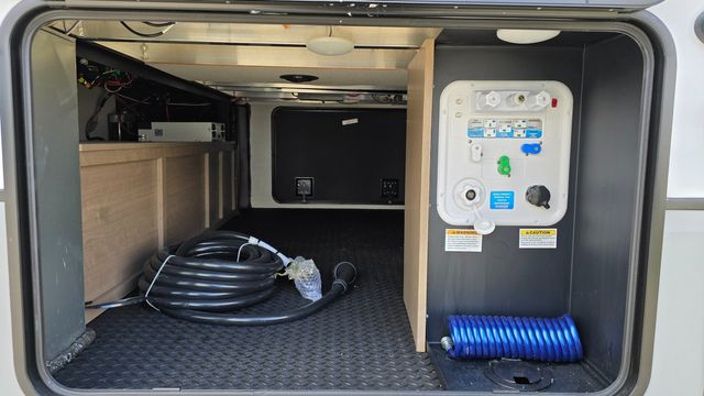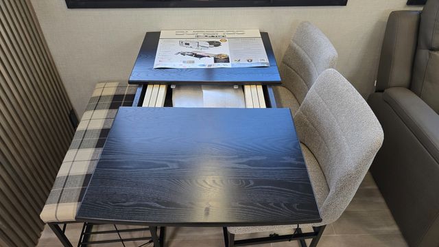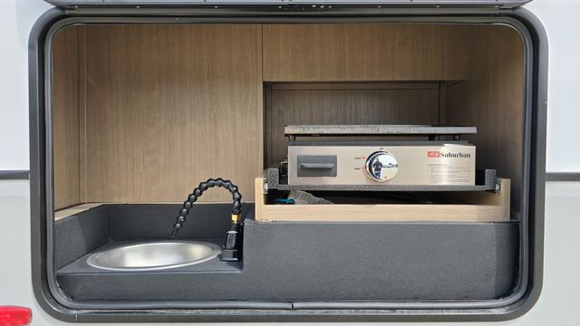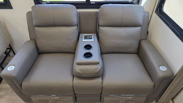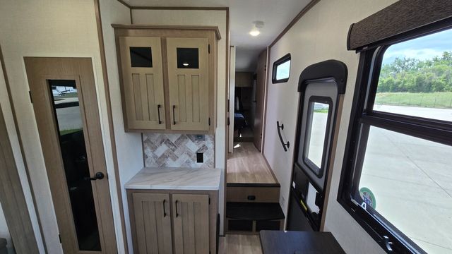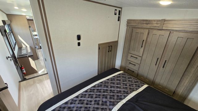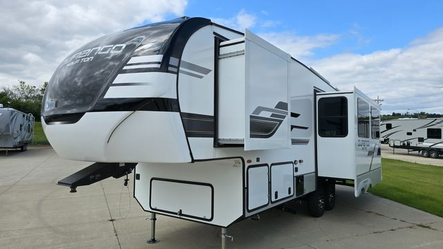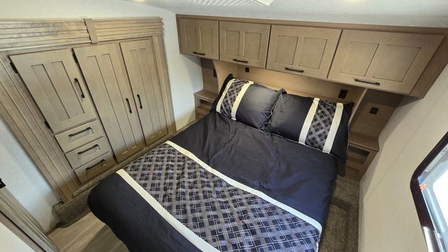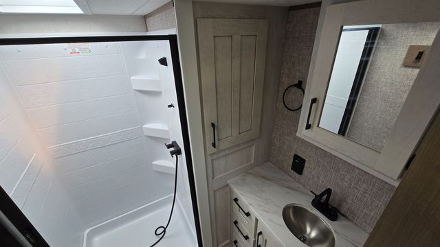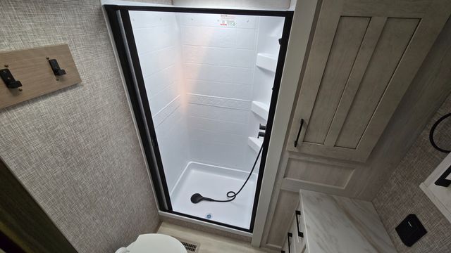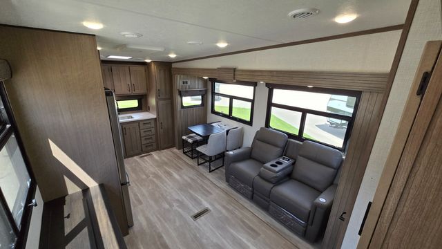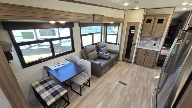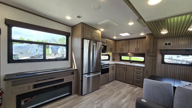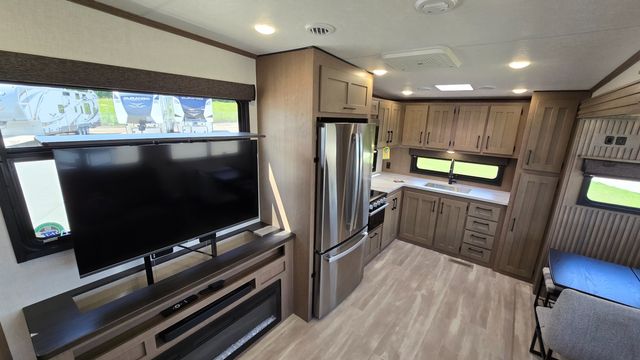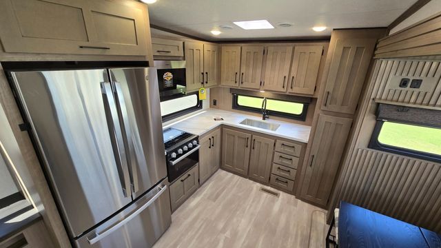 You'll fit right into this spacious fifth wheel for four! The rear kitchen includes plenty of counter space, a three burner drop-in cooktop, plus a spacious refrigerator and a pantry for food storage. Your crew can get cozy on the hide-a-bed sofa or choose the optional theater seating if you're not needing the extra sleeping space. The cook will also love having an outside kitchen with a griddle for pancakes in the morning! The dinette with EZ adjust table will give you a place to dine or play a game of cards, or you can sit outdoors under the 19' power awning with LED lights. The large 30" x 36" shower includes a skylight for more standing room and natural light, and the front private bedroom will provide you with your own space at night. Here, you'll find a queen bed with underbed storage, a wardrobe slide out, and a closet with washer and dryer prep that will make going full-time easier than ever!