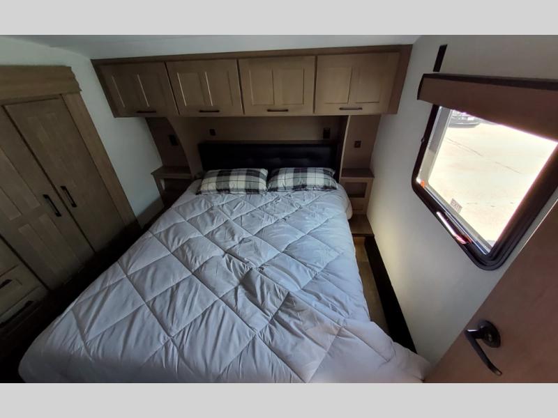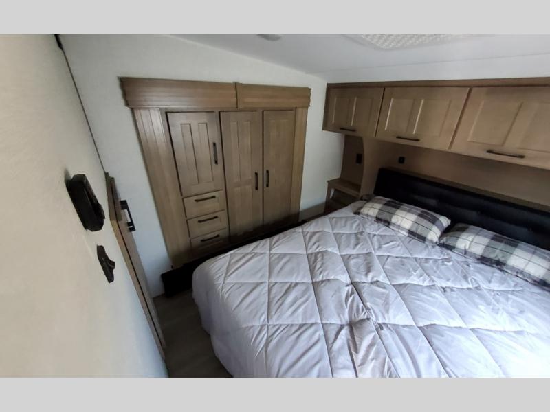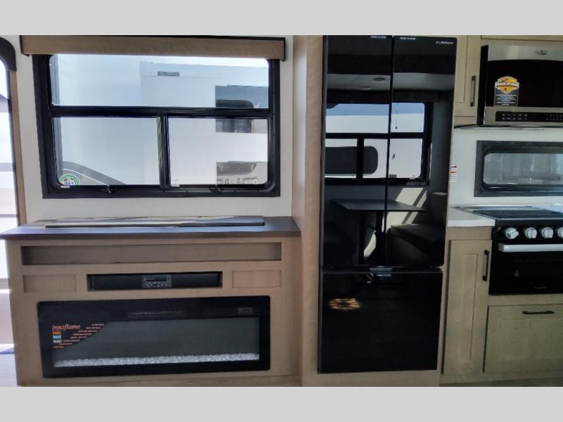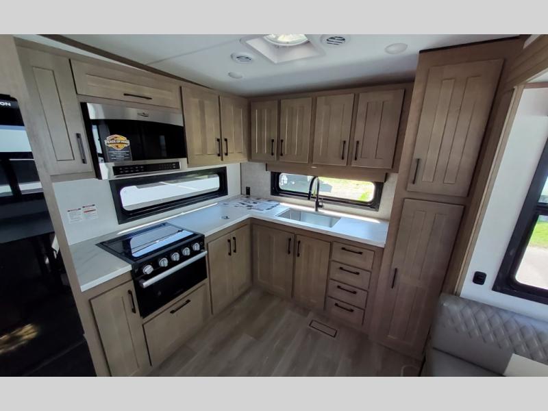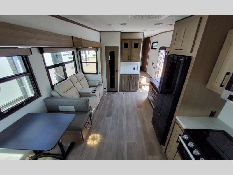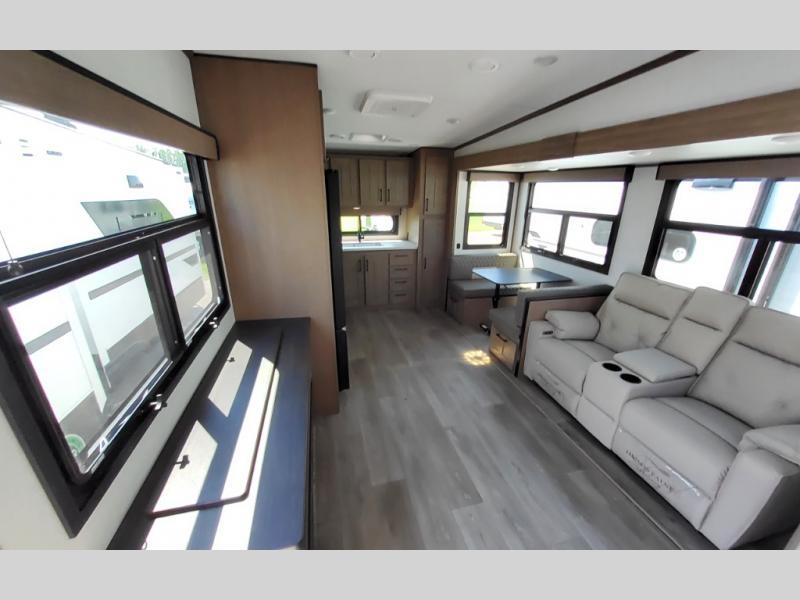 You'll fit right into this spacious fifth wheel for four! The rear kitchen includes plenty of counter space, a three burner drop-in cooktop, plus a spacious refrigerator and a pantry for food storage. Your crew can get cozy on the hide-a-bed sofa or choose the optional theater seating if you're not needing the extra sleeping space. The cook will also love having an outside kitchen with a griddle for pancakes in the morning! The dinette with EZ adjust table will give you a place to dine or play a game of cards, or you can sit outdoors under the 19' power awning with LED lights. The large 30" x 36" shower includes a skylight for more standing room and natural light, and the front private bedroom will provide you with your own space at night. Here, you'll find a queen bed with underbed storage, a wardrobe slide out, and a closet with washer and dryer prep that will make going full-time easier than ever!
