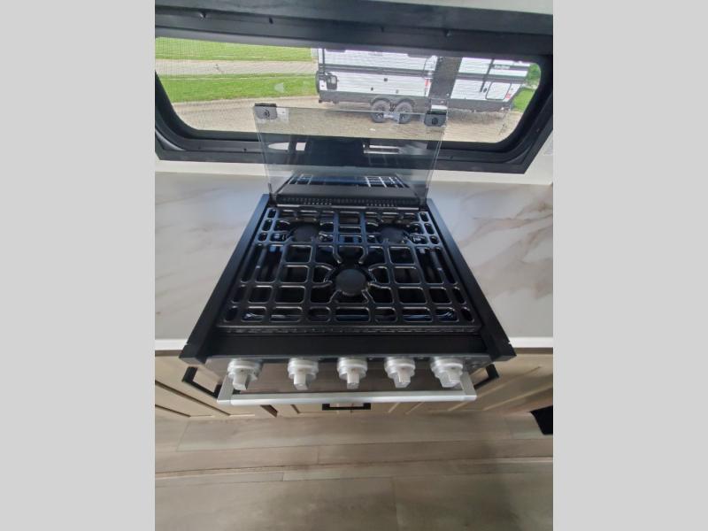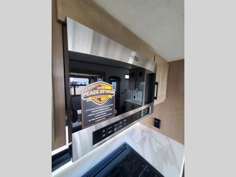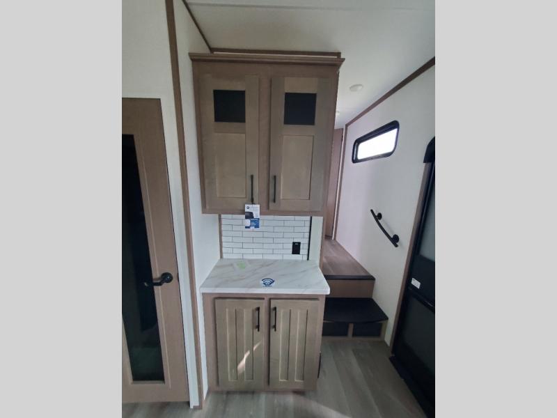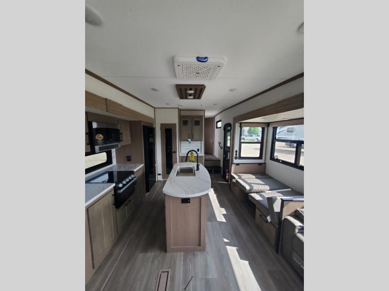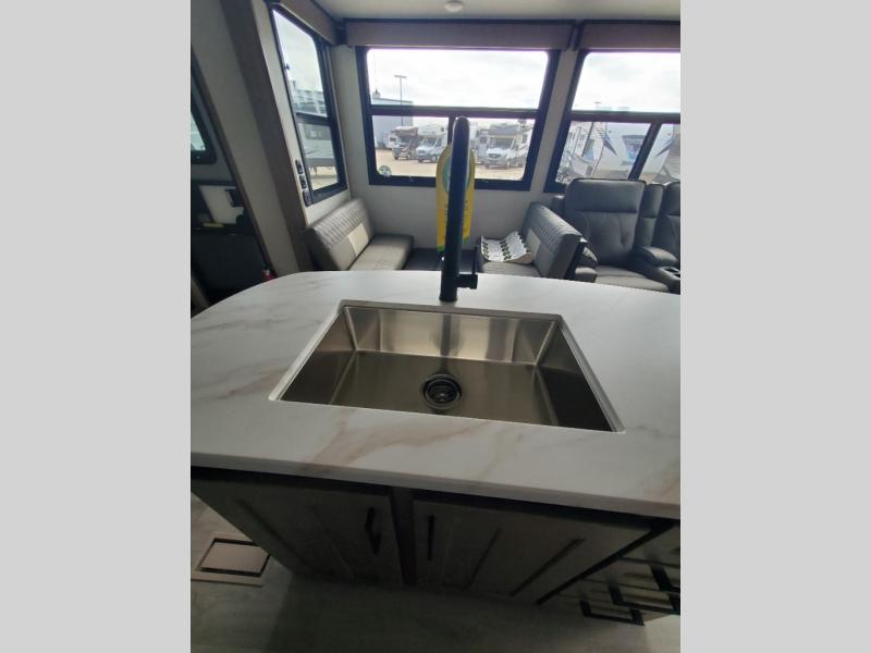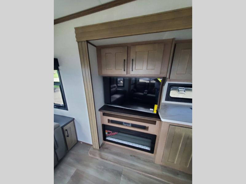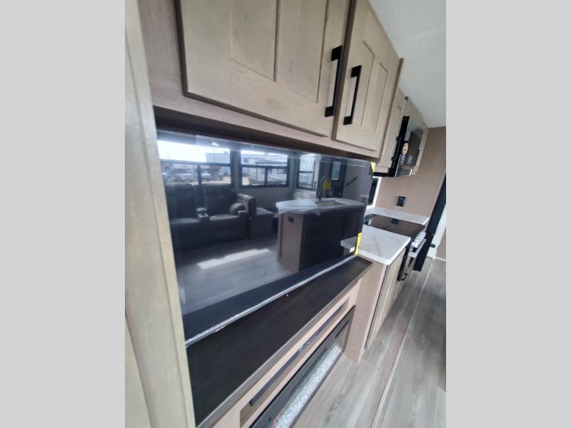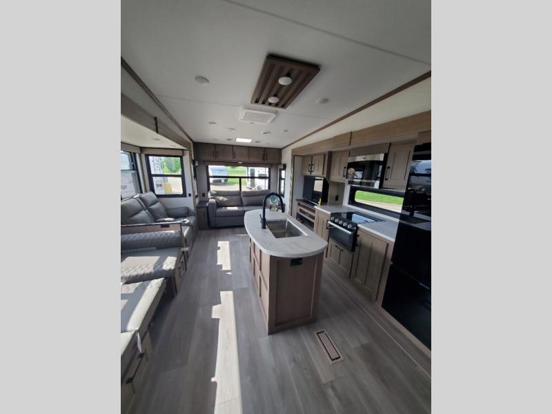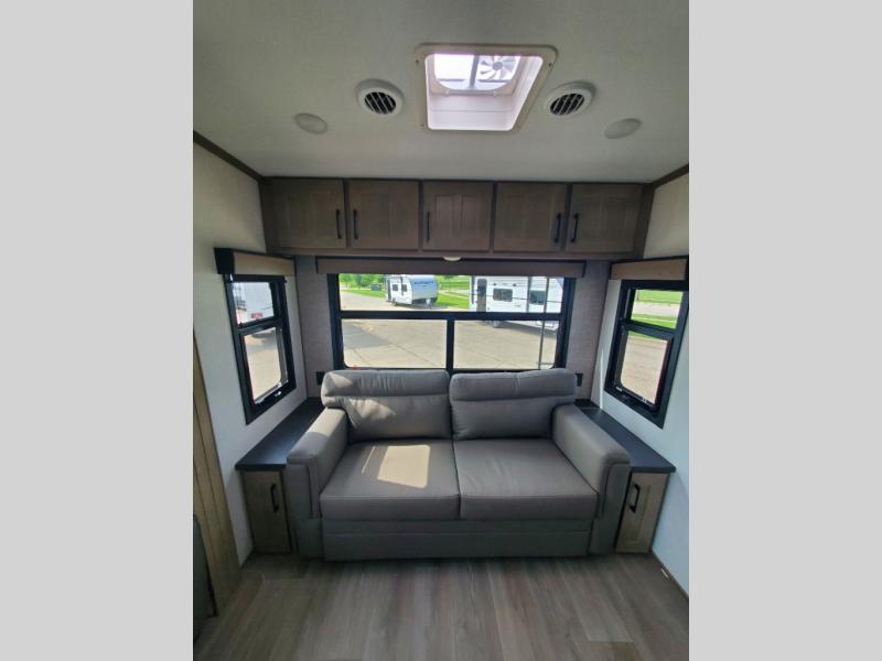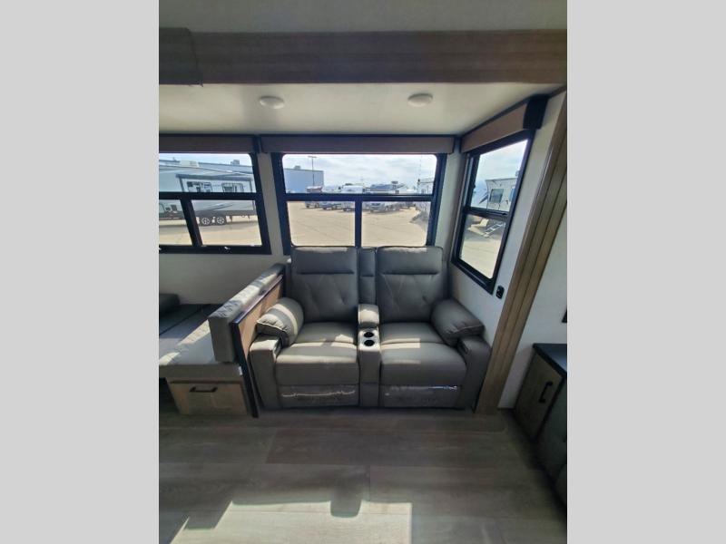 This fifth wheel will feel just like home with its kitchen island, theater seating, and front private bedroom! If you have any overnight guests, they can sleep on the rear hide-a-bed sofa. There is also a dinette with EZ adjust table for dining space, an entertainment center with a 43" Smart LED TV and an optional 40" fireplace. You will love the extra features that have been added, like the hutch in the kitchen for extra counter and storage space, the shower skylight in the spacious full bath, and the slide out wardrobe in the front bedroom!