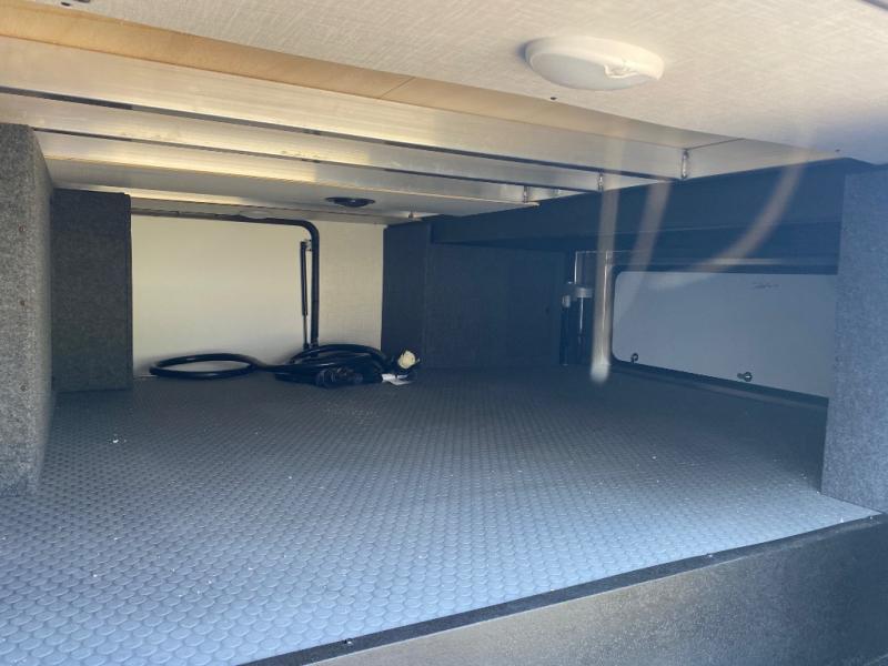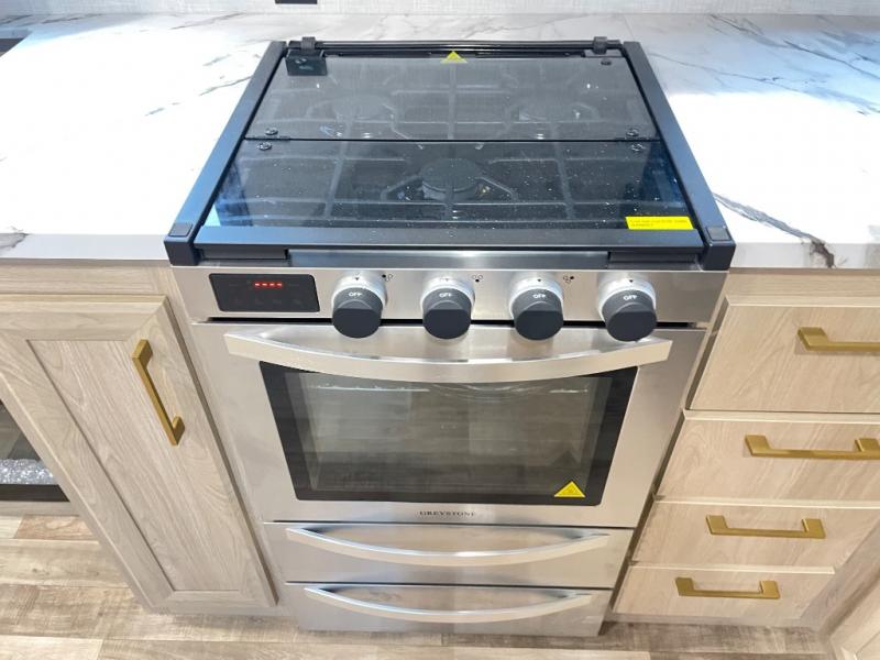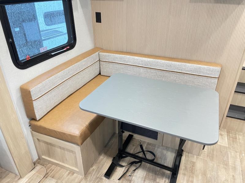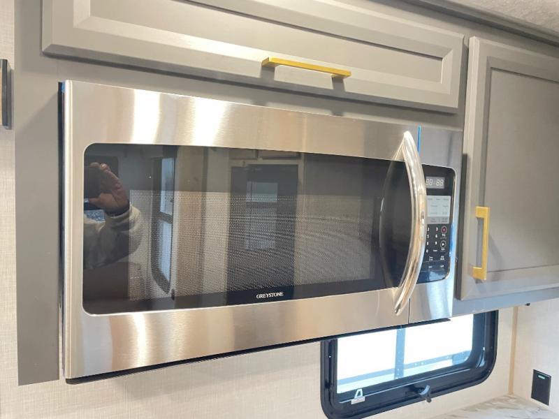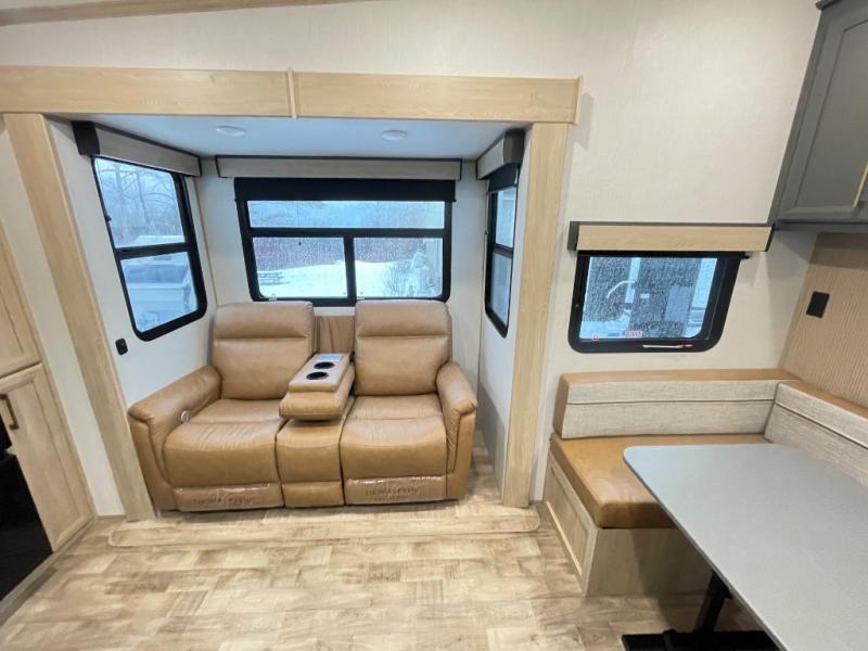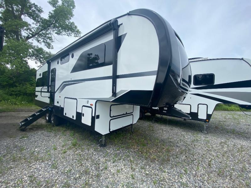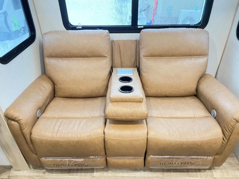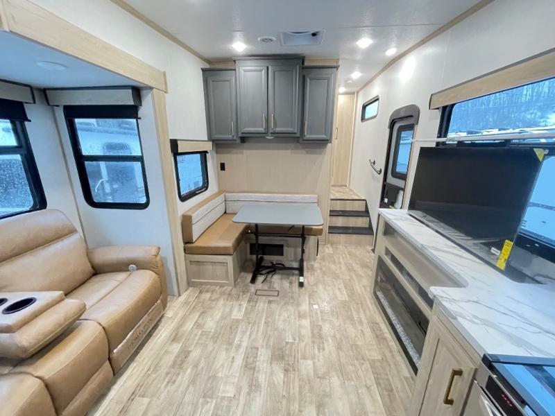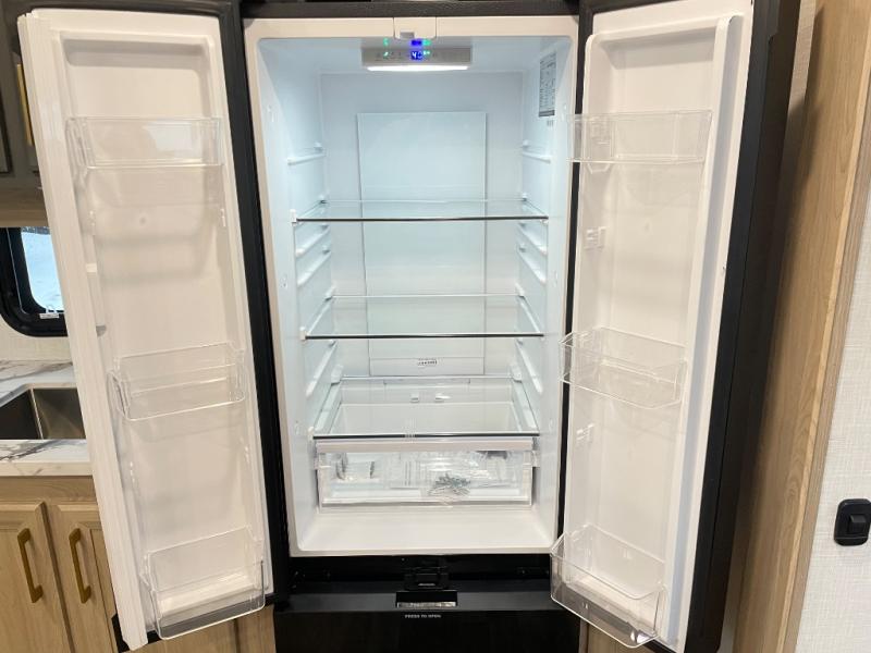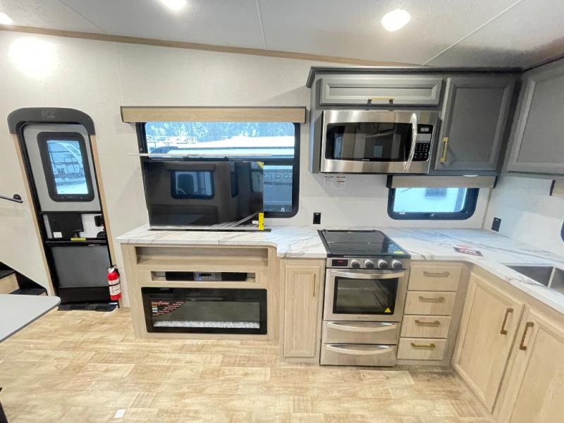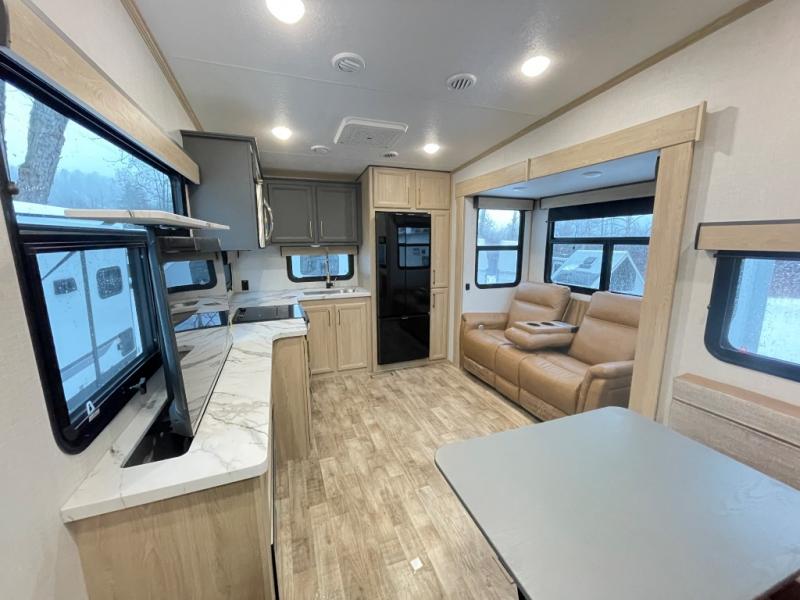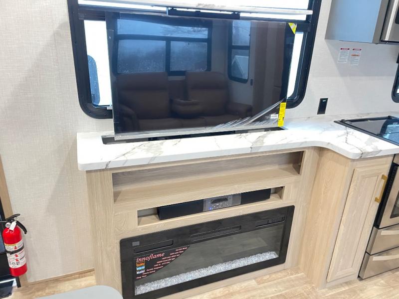 When you want to get away from it all, hitch up this spacious fifth wheel and head out! Once you arrive at the campground, you can make lunch in the rear kitchen that includes ample counter space, a 21" oven and 30" microwave, plus a pantry and French door refrigerator for food storage. Your crew can relax at the L-dinette with an EZ adjust table or on the theater seating across from the fireplace and Smart LED TV. And if you're needing additional sleeping space, just choose the optional hide-a-bed sofa in place of the theater seating! The dual entry bath features a spacious 42" x 30" residential shower, convenient towel hooks and a large slide out that is shared with the front master bedroom. You'll sleep soundly on the king bed here, and you can keep your things organized in the dresser and front closet. There is also washer and dryer prep if you want to add those appliances!