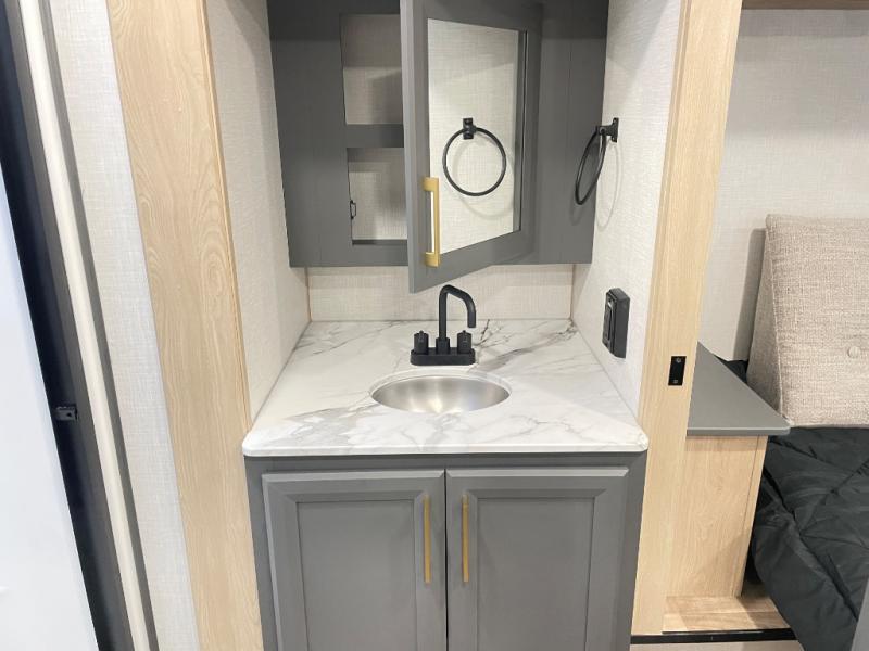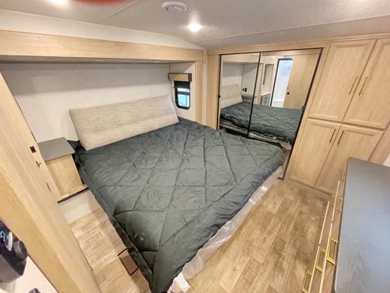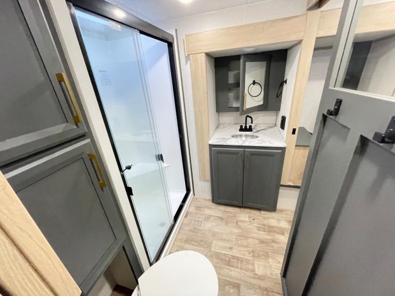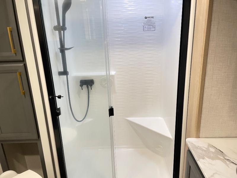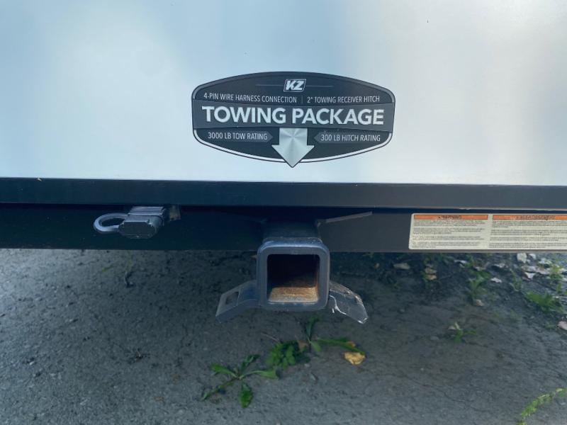 When you choose a Ridgeway fifth wheel by KZ you are choosing a modern design, convenient features, and comfort at every turn! These units have been constructed with some of the most durable materials in the industry, including Azdel composite panels and Tufflex roofing material. The exterior includes a full painted front cap, a fully-finished, heated and sealed basement storage compartment, and a deluxe heated water convenience center to easily monitor your units water levels. There is also 4-point auto electric leveling, Keyed-Alike for baggage and entry doors, a 2" towing receiver hitch, and many more stand-out exterior features. Once inside, you'll enjoy the ceiling crown molding, 5" gold cabinet hardware, deluxe residential-style furniture, and all-wood lumber core screwed cabinets with hardwood doors. The comforts continue on in the bathroom and bedroom with a shower skylight and built-in seat, large linen closets, a luxurious bedspread, and XL under-bed storage for luggage, extra blankets and more!