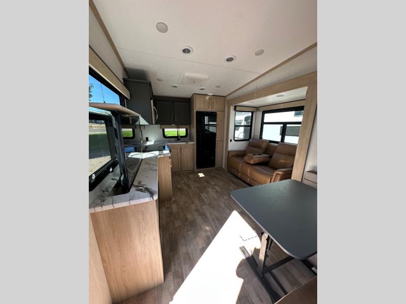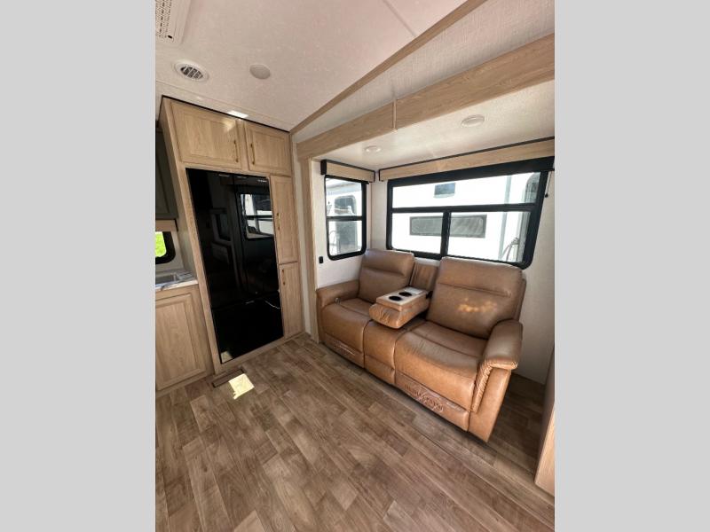 When you want to get away from it all, hitch up this spacious fifth wheel and head out! Once you arrive at the campground, you can make lunch in the rear kitchen that includes ample counter space, a 21" oven and 30" microwave, plus a pantry and French door refrigerator for food storage. Your crew can relax at the L-dinette with an EZ adjust table or on the theater seating across from the fireplace and Smart LED TV. And if you're needing additional sleeping space, just choose the optional hide-a-bed sofa in place of the theater seating! The dual entry bath features a spacious 42" x 30" residential shower, convenient towel hooks and a large slide out that is shared with the front master bedroom. You'll sleep soundly on the king bed here, and you can keep your things organized in the dresser and front closet. There is also washer and dryer prep if you want to add those appliances!