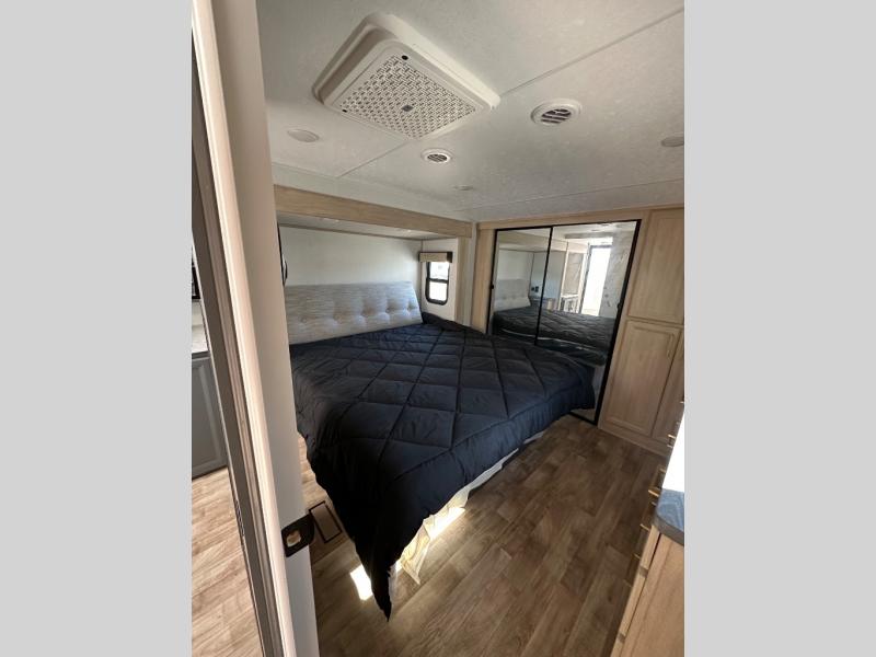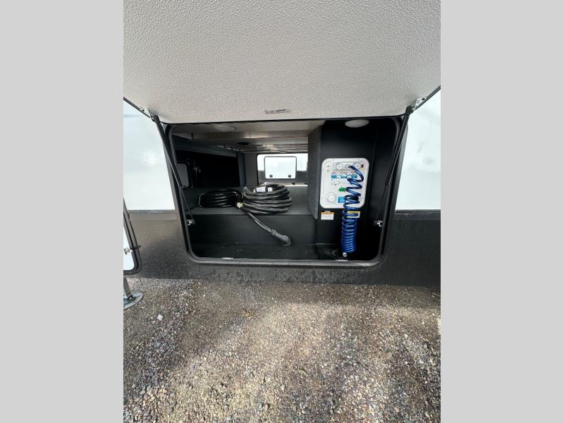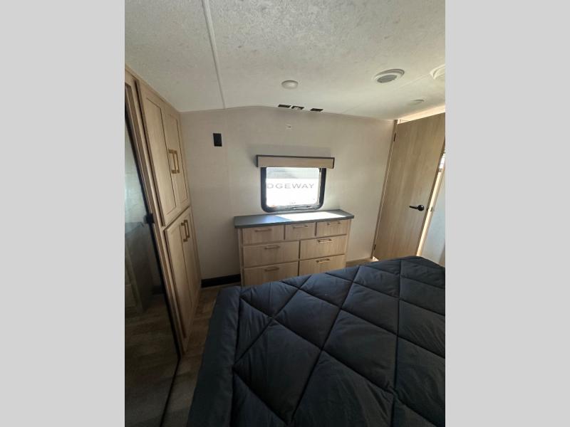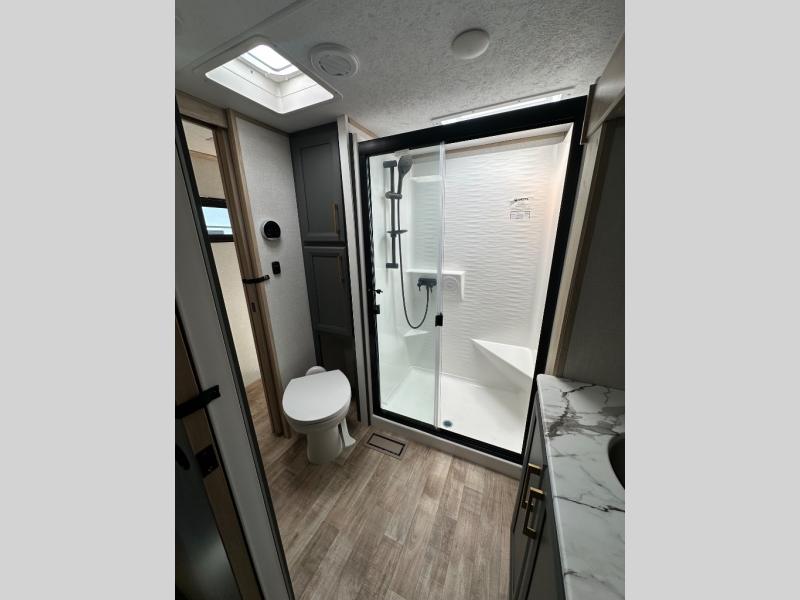 When you choose a Ridgeway fifth wheel by KZ you are choosing a modern design, convenient features, and comfort at every turn! These units have been constructed with some of the most durable materials in the industry, including Azdel composite panels and Tufflex roofing material. The exterior includes a full painted front cap, a fully-finished, heated and sealed basement storage compartment, and a deluxe heated water convenience center to easily monitor your units water levels. There is also 4-point auto electric leveling, Keyed-Alike for baggage and entry doors, a 2" towing receiver hitch, and many more stand-out exterior features. Once inside, you'll enjoy the ceiling crown molding, 5" gold cabinet hardware, deluxe residential-style furniture, and all-wood lumber core screwed cabinets with hardwood doors. The comforts continue on in the bathroom and bedroom with a shower skylight and built-in seat, large linen closets, a luxurious bedspread, and XL under-bed storage for luggage, extra blankets and more!