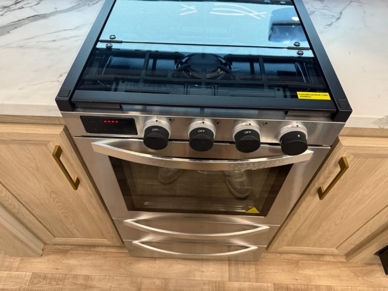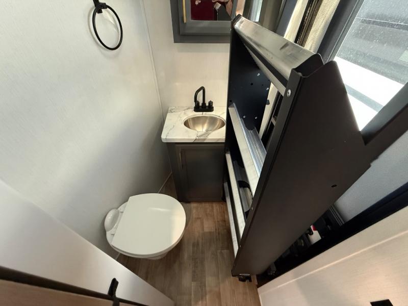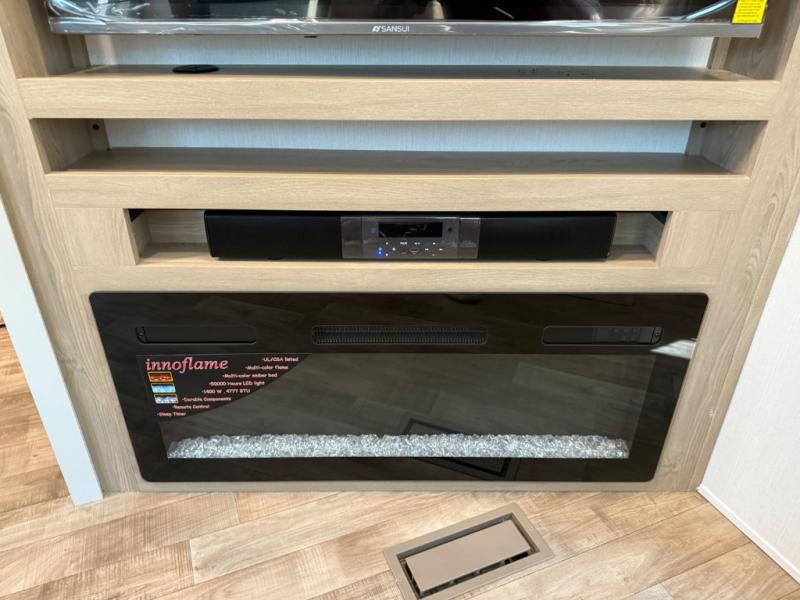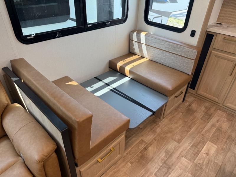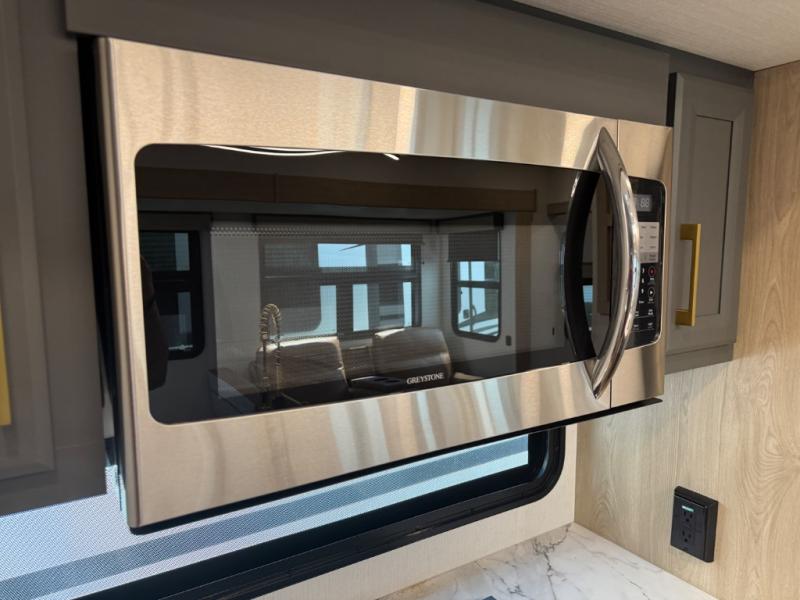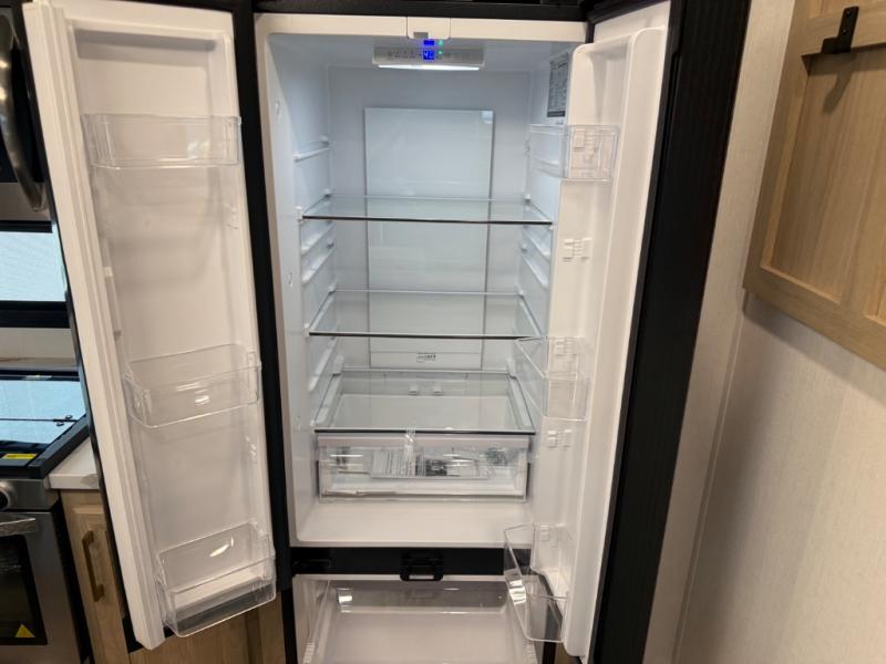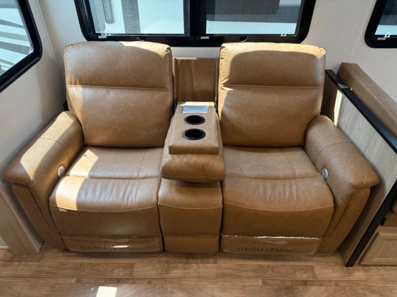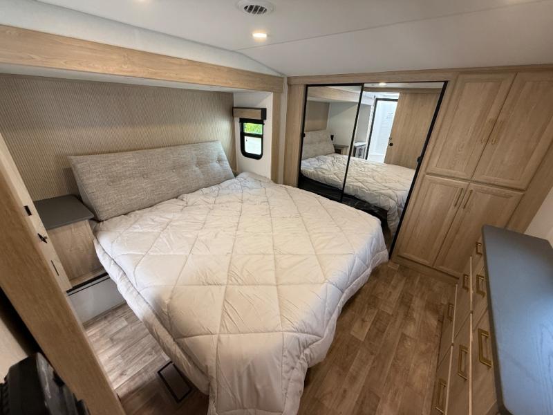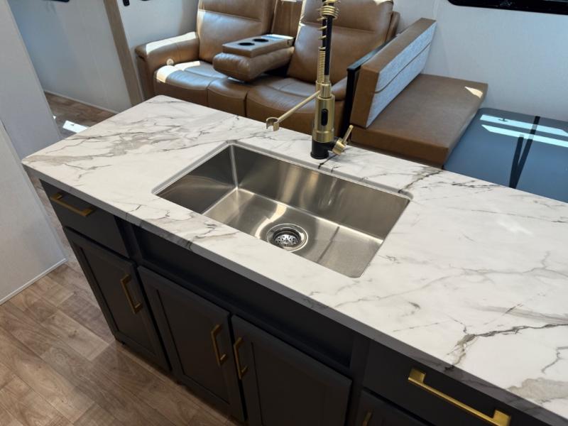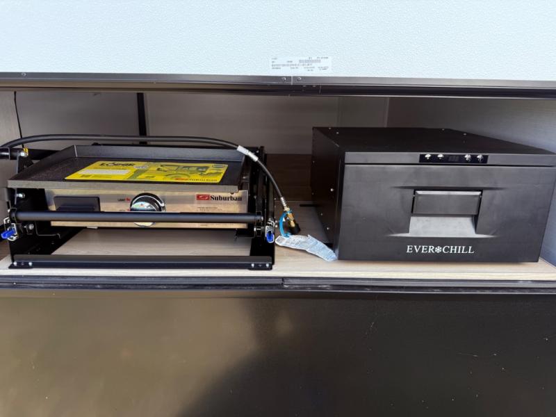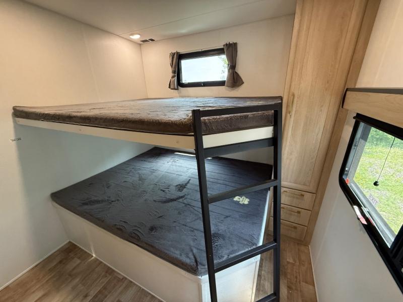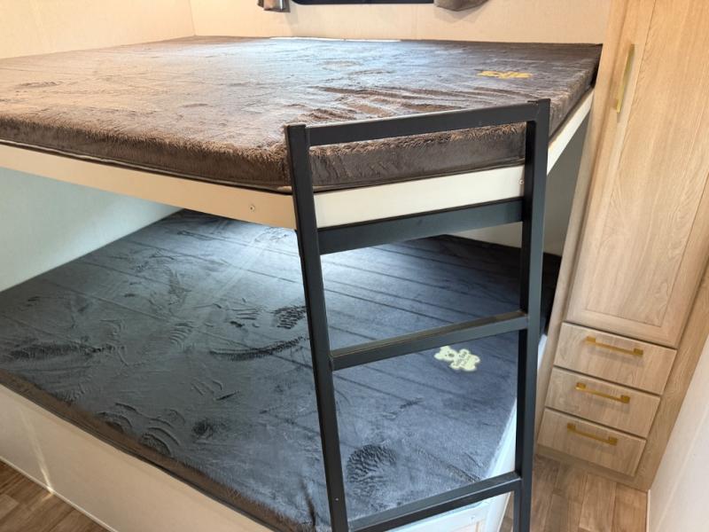 If you're looking for more space and a large sleeping capacity in your next RV, this fifth wheel is the one! Not only are there triple slides, but you can sleep six to eight, depending on the options you choose. The rear bunkhouse suite includes queen-size bunks, a closet, plus a half bath that features one of the dual entry doors to the unit for added convenience. You can make your meals inside on the three burner range and 21" oven, or head outdoors to use the outside griddle! Once you're back inside, your crew can play a game at the dinette or just relax on the theater seating. This can also be replaced with an optional hide-a-bed sofa for more sleeping space. A dual entry full bath will create a front master bedroom you are sure to love since there is a king bed slide, a dresser, and a front closet with washer and dryer prep!