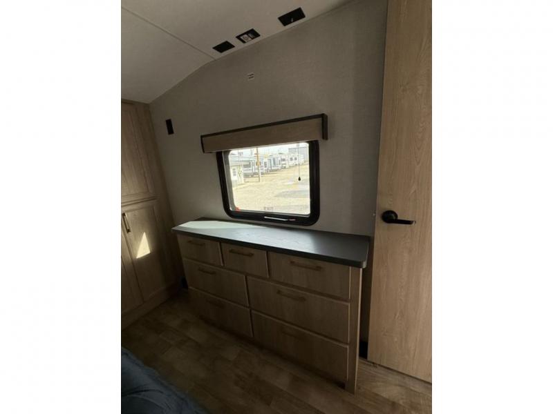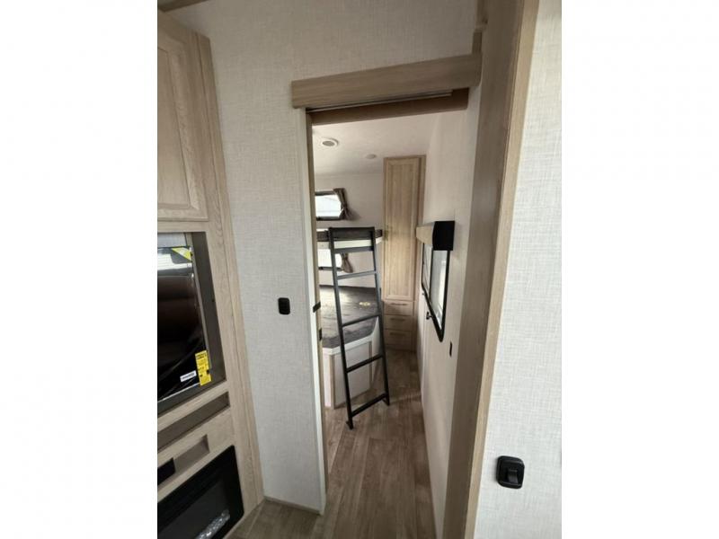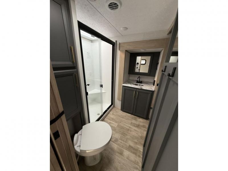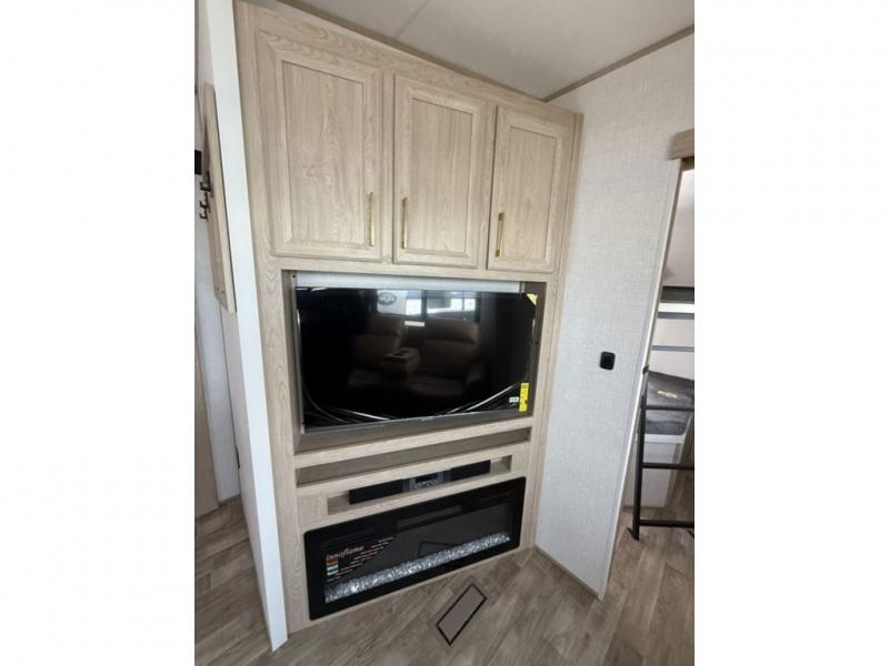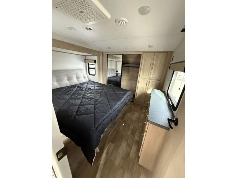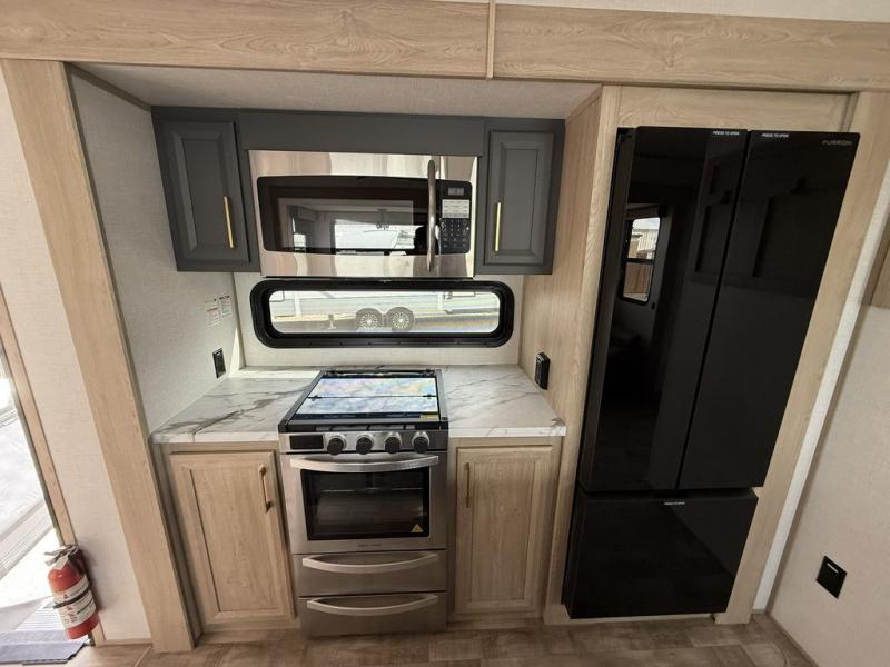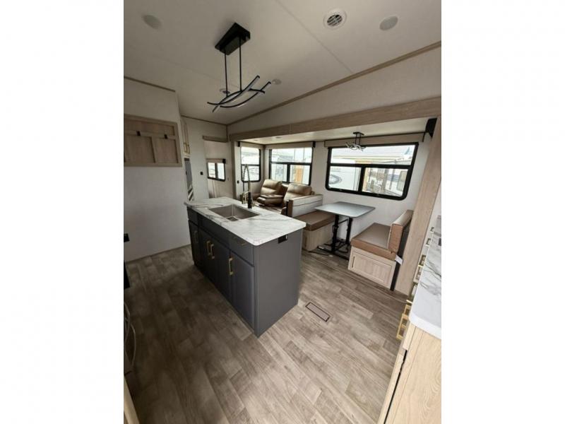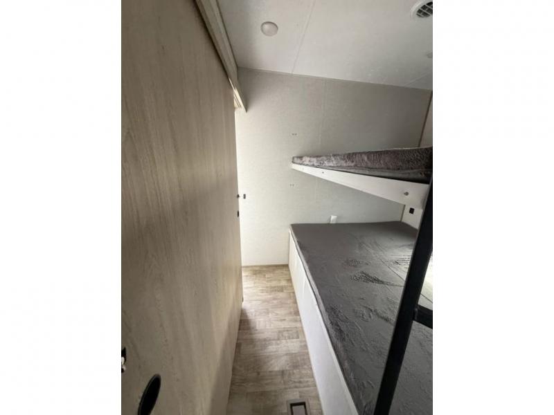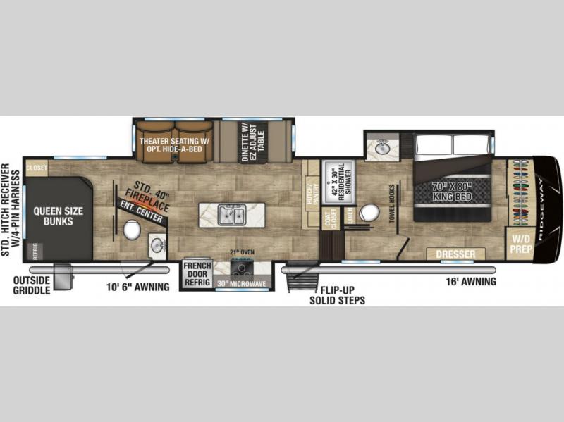 If you're looking for more space and a large sleeping capacity in your next RV, this fifth wheel is the one! Not only are there triple slides, but you can sleep six to eight, depending on the options you choose. The rear bunkhouse suite includes queen-size bunks, a closet, plus a half bath that features one of the dual entry doors to the unit for added convenience. You can make your meals inside on the three burner range and 21" oven, or head outdoors to use the outside griddle! Once you're back inside, your crew can play a game at the dinette or just relax on the theater seating. This can also be replaced with an optional hide-a-bed sofa for more sleeping space. A dual entry full bath will create a front master bedroom you are sure to love since there is a king bed slide, a dresser, and a front closet with washer and dryer prep!