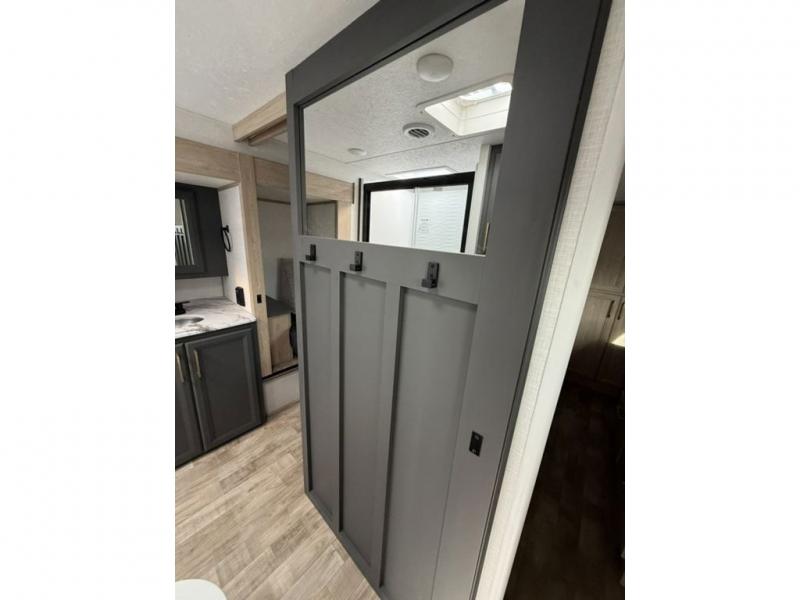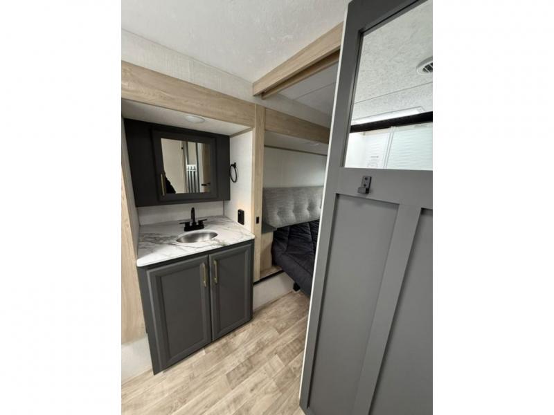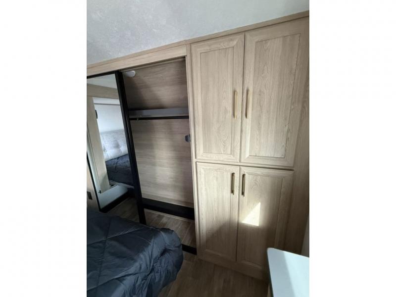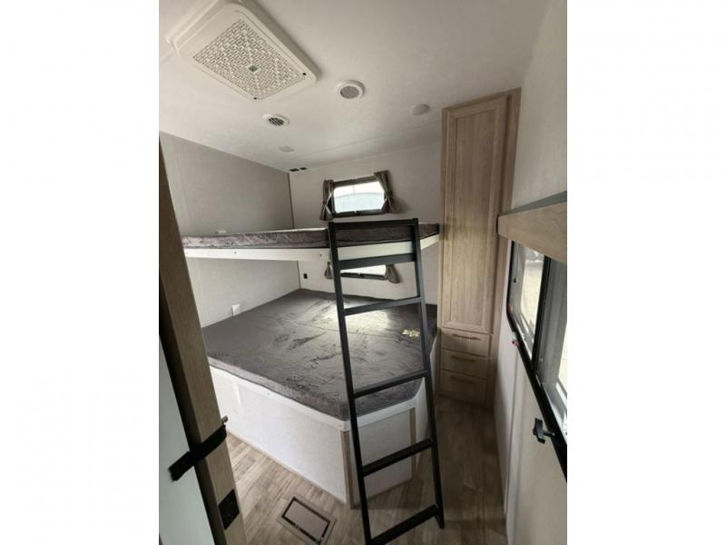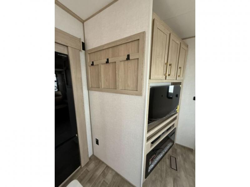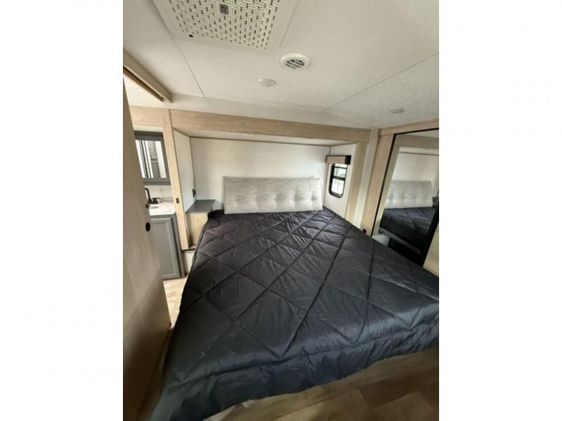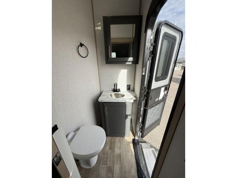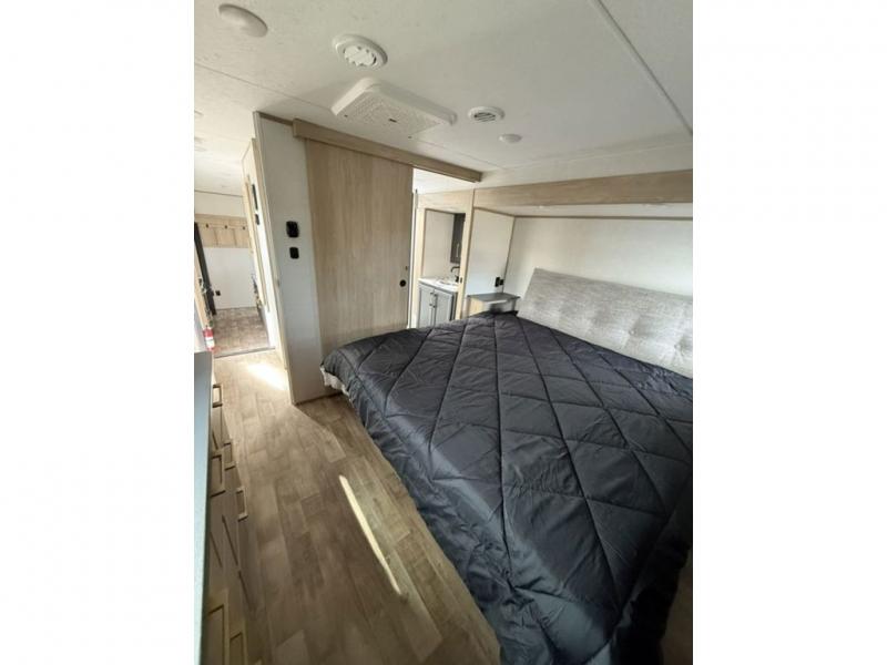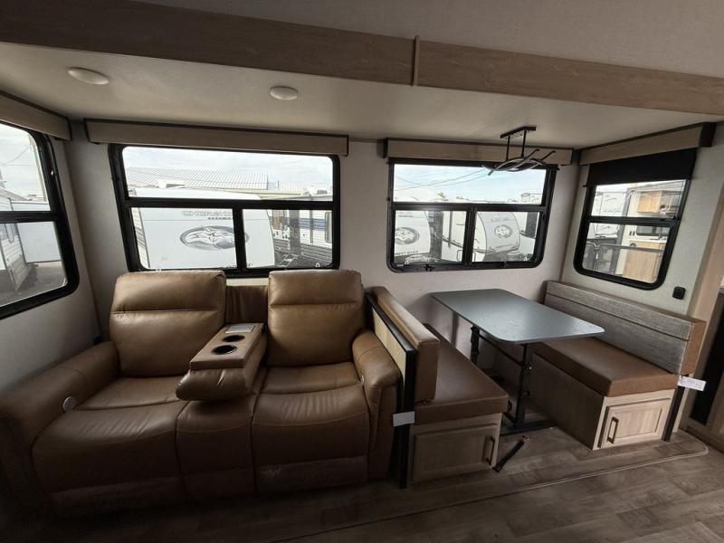 If you're looking for more space and a large sleeping capacity in your next RV, this fifth wheel is the one! Not only are there triple slides, but you can sleep six to eight, depending on the options you choose. The rear bunkhouse suite includes queen-size bunks, a closet, plus a half bath that features one of the dual entry doors to the unit for added convenience. You can make your meals inside on the three burner range and 21" oven, or head outdoors to use the outside griddle! Once you're back inside, your crew can play a game at the dinette or just relax on the theater seating. This can also be replaced with an optional hide-a-bed sofa for more sleeping space. A dual entry full bath will create a front master bedroom you are sure to love since there is a king bed slide, a dresser, and a front closet with washer and dryer prep!