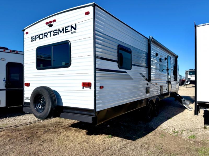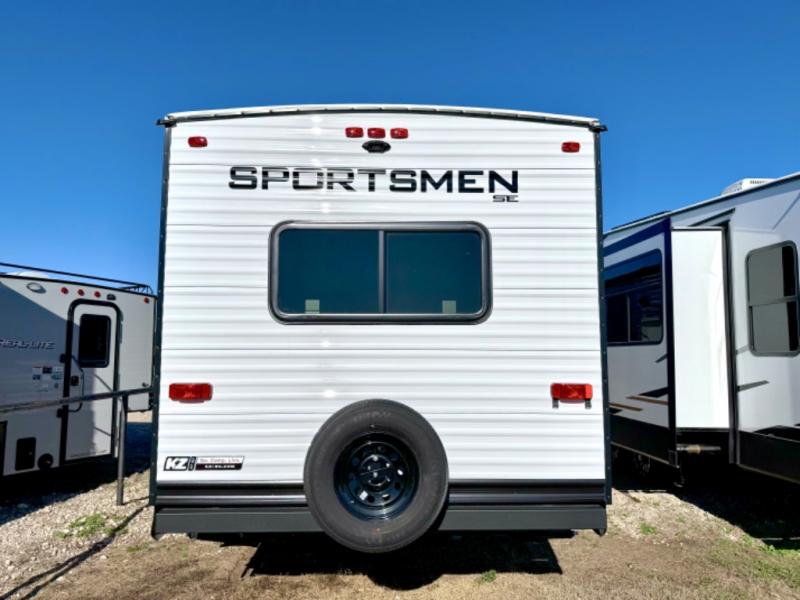Each Sportsmen SE travel trailer and toy hauler by KZ is constructed with KZ exclusive tough shield exterior metal, a one-piece seamless walk-on Tufflex roofing material, and diamond plate rock guard to protect your unit from road debris. You will appreciate the extra large baggage doors for stowing away your gear when not in use, and tinted windows to help keep the harmful sun rays out plus keeping it cooler inside. Some of the exterior conveniences found in the mandatory Advantage Package are the solid folding steps with a large folding grab handle for easy entry and exit, a full glass friction hinged entry door, plus an exterior shower for your pets or to rinse off before you head inside. You'll also appreciate the nitrogen-filled tires, solar and backup camera prep, plus a Leash Latch with a bonus beverage opener. You'll feel right at home inside with linoleum flooring throughout, a 13,500 BTU air conditioner, large overhead cabinets, a shower surround, and much more!