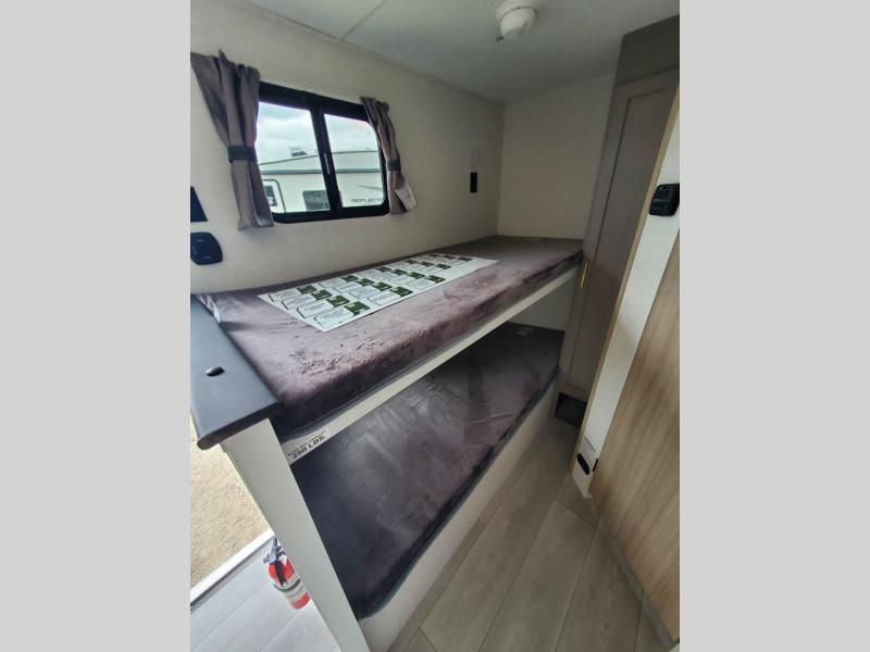 This cozy travel trailer with bunk beds will let you camp with ease! While your guests or the kids take the bunks, you can enjoy the front 54" x 80" bed all to yourselves. There is a private bath with a shower and toilet so won't have to use the camp's facilities. A two burner cooktop and microwave oven will let you make meals each day, and there is a refrigerator to keep perishables fresh. When you're ready for some fresh air, grab your hiking gear from the exterior trunk door and head for the trails!