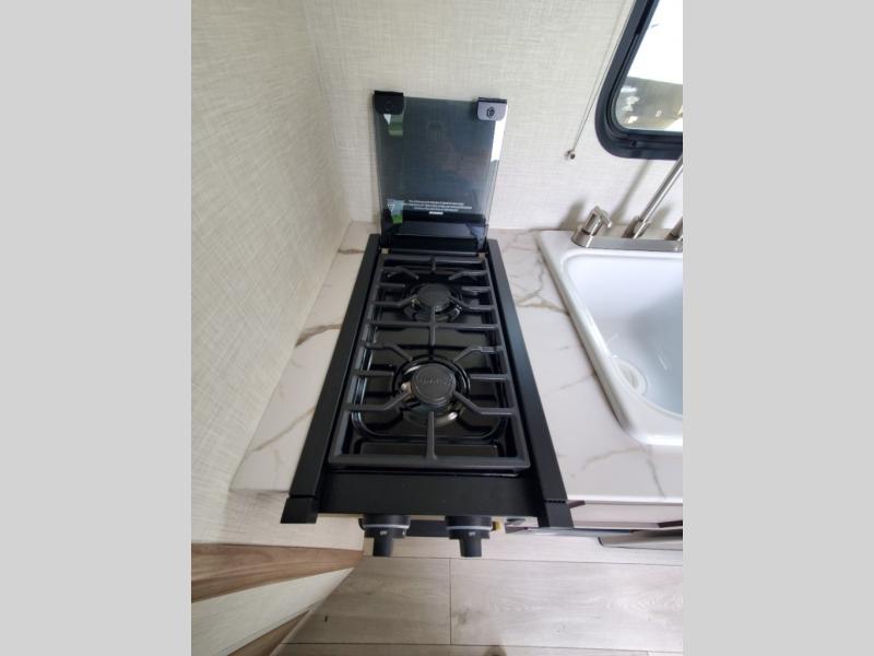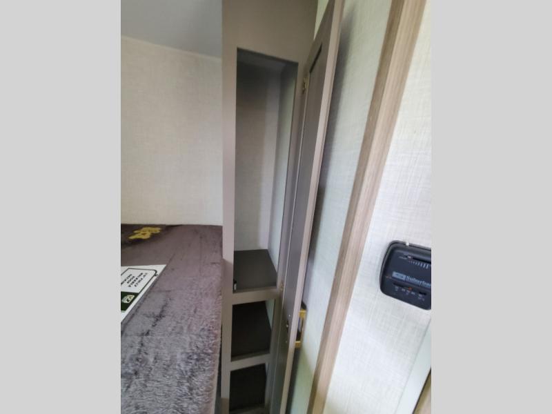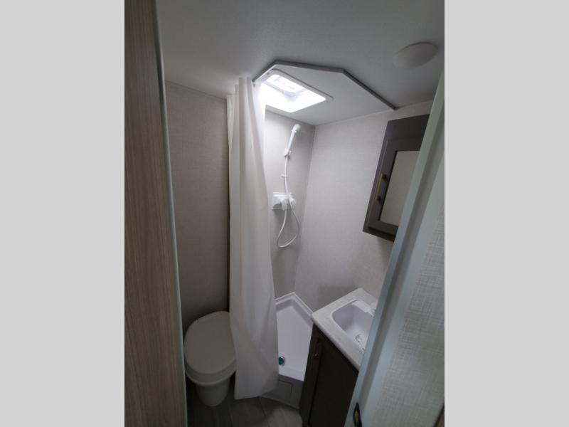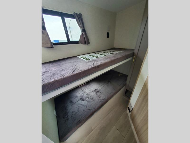 This cozy travel trailer with bunk beds will let you camp with ease! While your guests or the kids take the bunks, you can enjoy the front 54" x 80" bed all to yourselves. There is a private bath with a shower and toilet so won't have to use the camp's facilities. A two burner cooktop and microwave oven will let you make meals each day, and there is a refrigerator to keep perishables fresh. When you're ready for some fresh air, grab your hiking gear from the exterior trunk door and head for the trails!