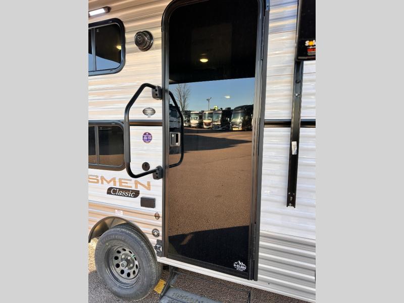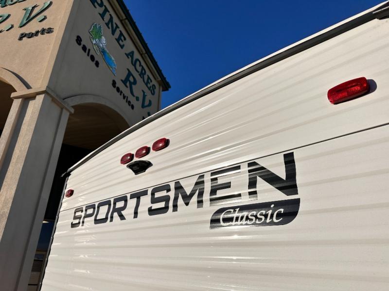 With any Sportsmen Classis travel trailer by KZ you will find durable construction materials, like the 3/8" fully-walkable roof and the one-piece seamless Tufflex material. Each model includes scissor-style stabilizer jacks, a Key-Alike program for baggage and entry doors, and a Leash Latch with a bonus beverage opener. You will find interior and exterior speakers plus backup camera prep and solar prep. The Sportsmen Classic is designed to make you feel at home with LED interior lights, rail-style cabinet doors, residential grade linoleum, and plenty of storage space for all your belongings.