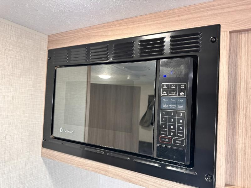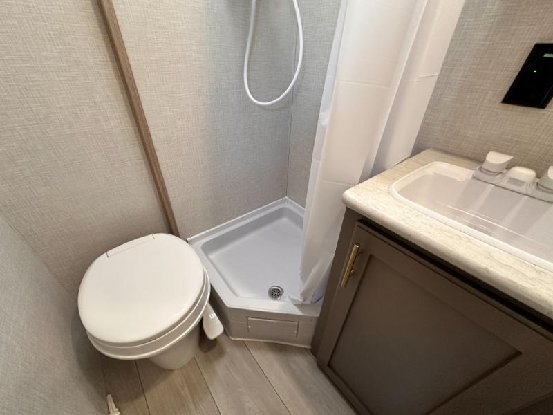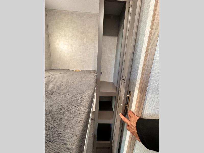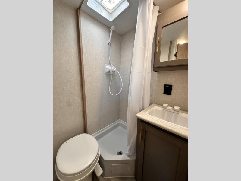 This cozy travel trailer with bunk beds will let you camp with ease! While your guests or the kids take the bunks, you can enjoy the front 54" x 80" bed all to yourselves. There is a private bath with a shower and toilet so won't have to use the camp's facilities. A two burner cooktop and microwave oven will let you make meals each day, and there is a refrigerator to keep perishables fresh. When you're ready for some fresh air, grab your hiking gear from the exterior trunk door and head for the trails!