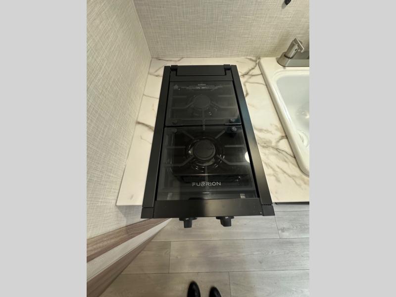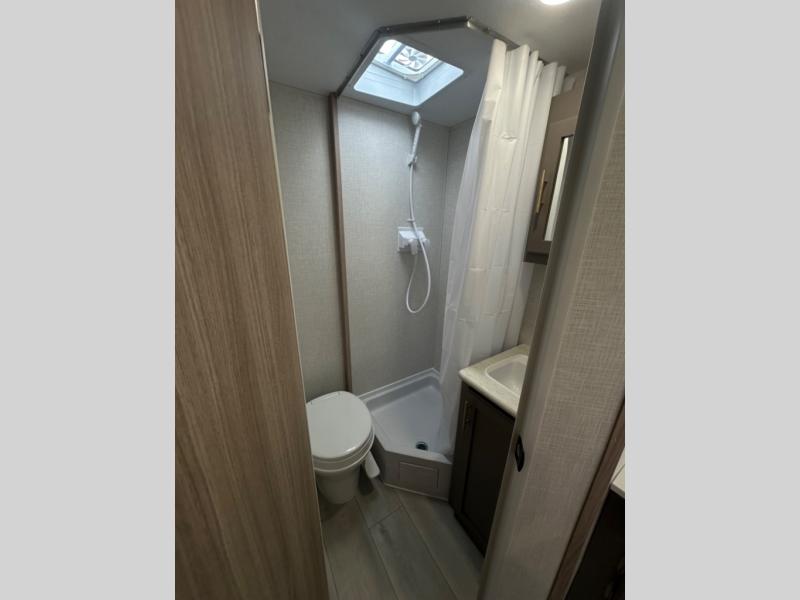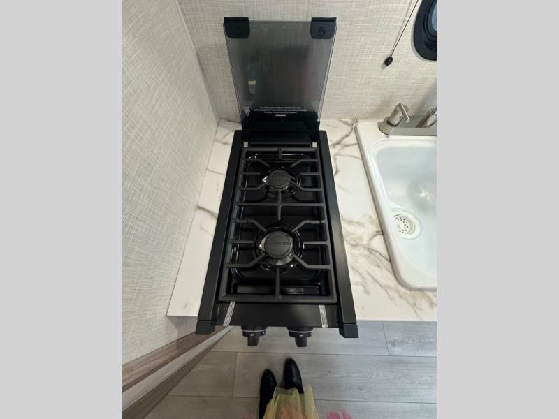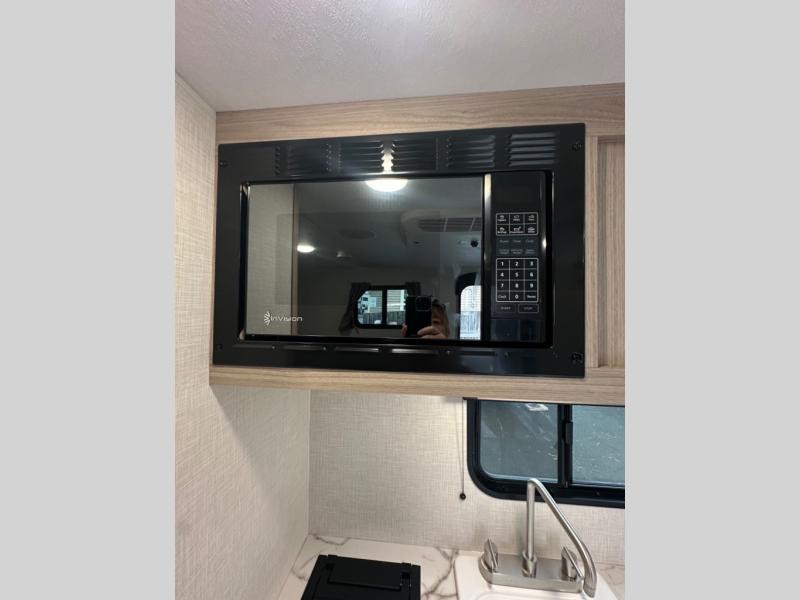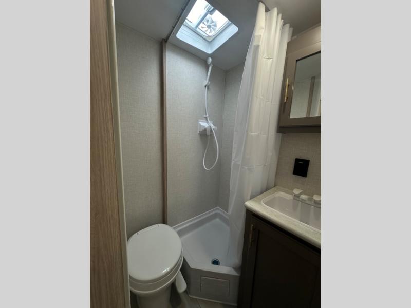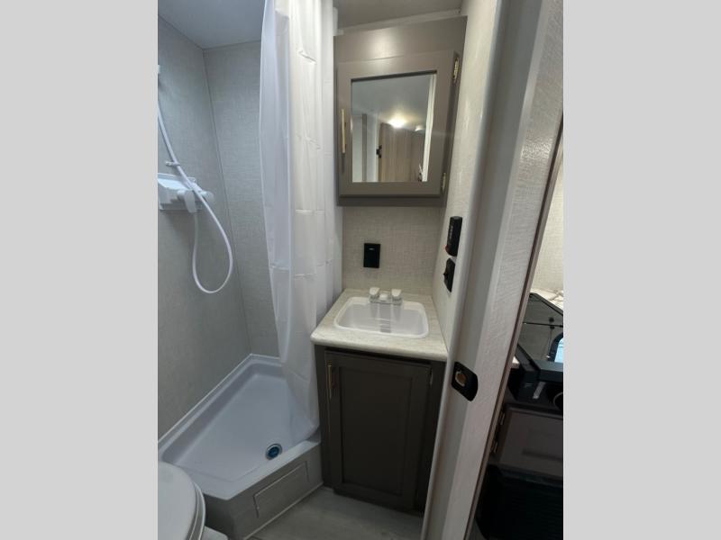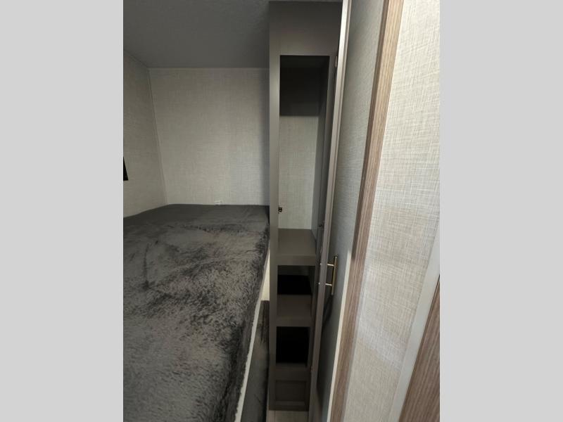 This cozy travel trailer with bunk beds will let you camp with ease! While your guests or the kids take the bunks, you can enjoy the front 54" x 80" bed all to yourselves. There is a private bath with a shower and toilet so won't have to use the camp's facilities. A two burner cooktop and microwave oven will let you make meals each day, and there is a refrigerator to keep perishables fresh. When you're ready for some fresh air, grab your hiking gear from the exterior trunk door and head for the trails!