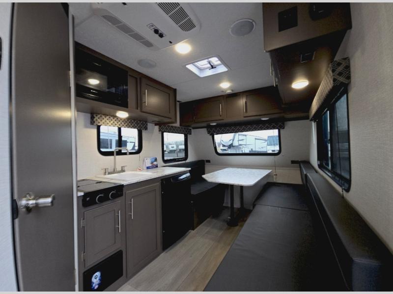 Your tent-camping days are over with this cute travel trailer that can sleep two to three people each night. The front 54" booth dinette can be used as dining and sleeping space, and there is a sofa for more seating and sleeping space. Prepare your meals on the two burner cooktop, and the single bowl sink will make clean-up a breeze. This model includes a closet just as you enter the unit for your shoes and jackets.