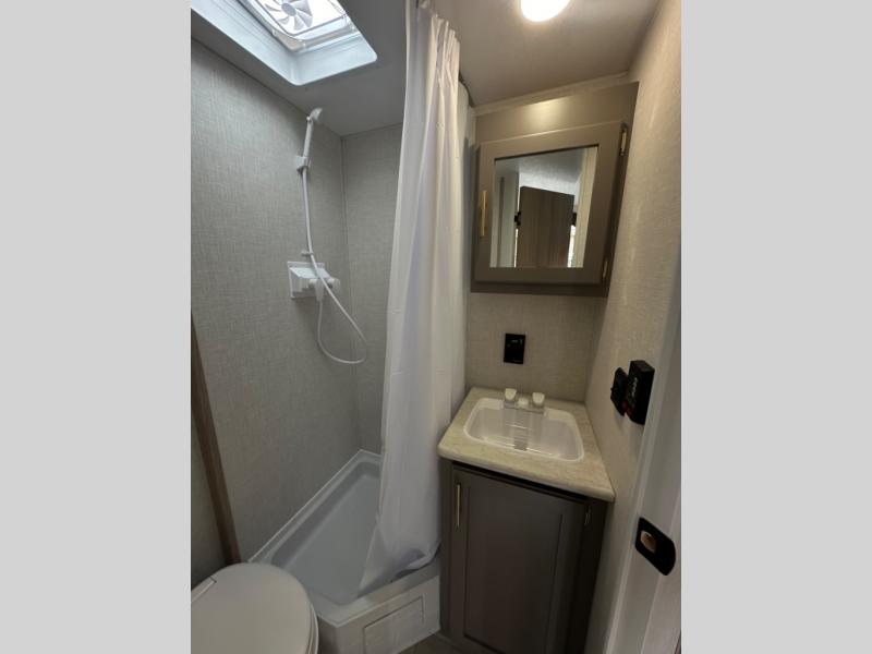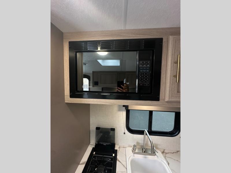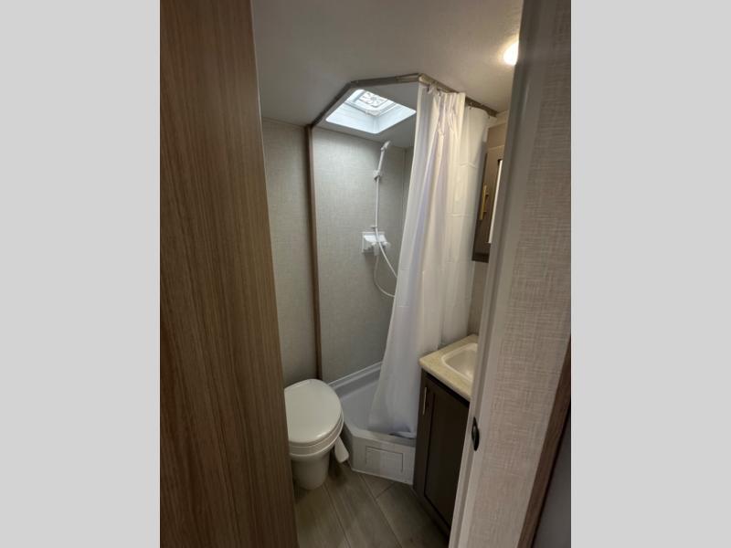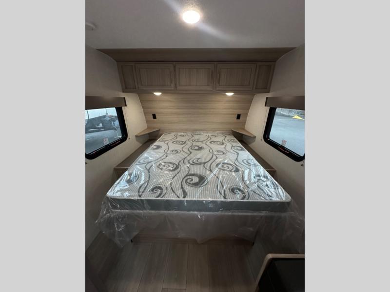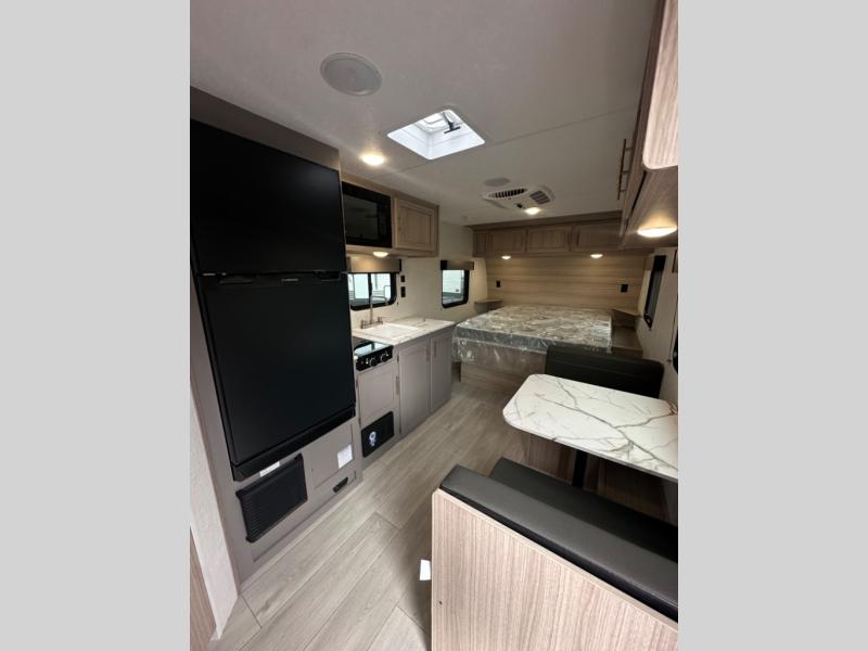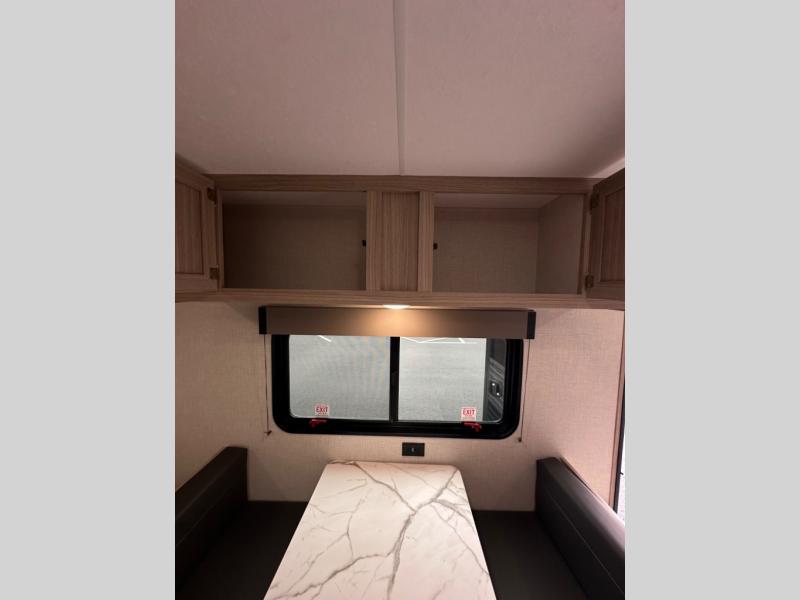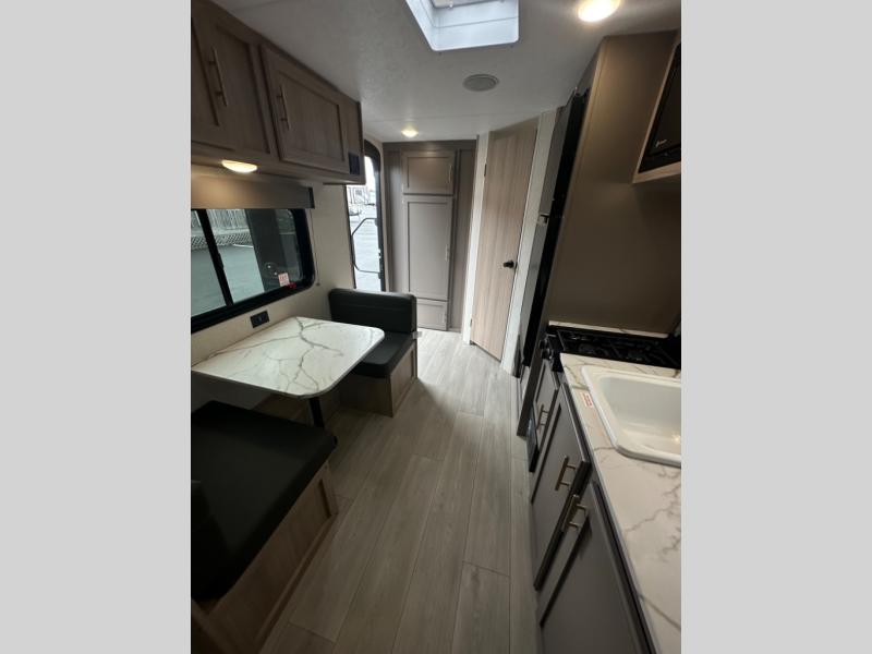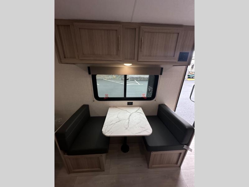 This travel trailer will feel just like home with its full bath, walk-around queen bed, and plenty of storage space for your belongings. Once you arrive at the campground, grab your fishing poles from the pass-through storage and head down to the river. You can get cleaned up in the full bath before heading to the kitchen to prepare a meal on the two burner cooktop with a glass cover or in the microwave oven. There is a comfortable booth dinette to dine at, and this space can double as sleeping space for overnight guests or two little ones.