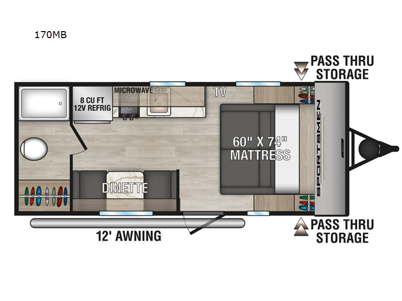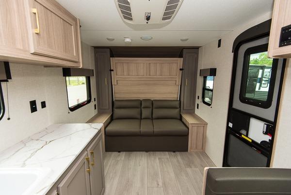 This versatile travel trailer is perfect for weekend trips to the lake. You'll sleep soundly each night on the 60" x 74" mattress, and there are dual bedside wardrobes to keep your things tidy. This model also includes a booth dinette that can be used for dining and sleeping space. The chef of your group can prepare meals on the two burner cooktop with a glass cover, and leftovers can go in the 8 cu. ft. 12V refrigerator. This model also includes a 12' power awning that will provide shade while you're outdoors as well.