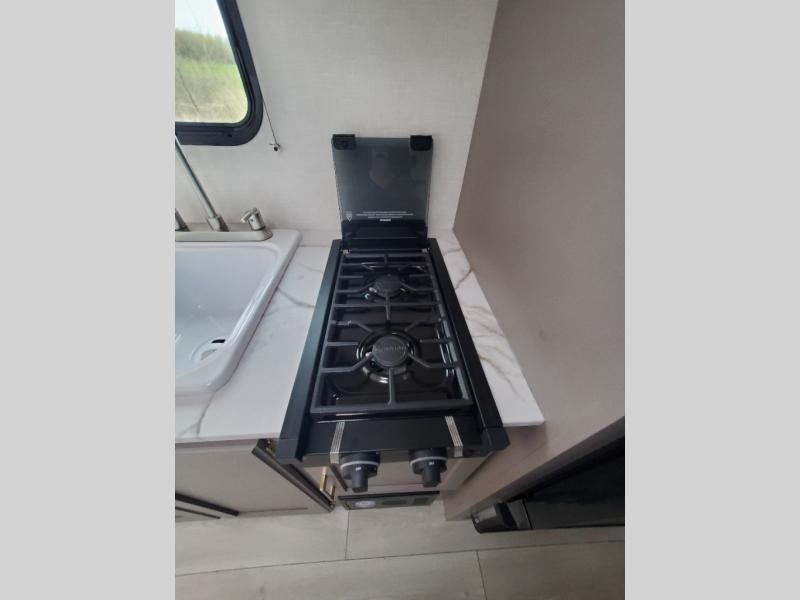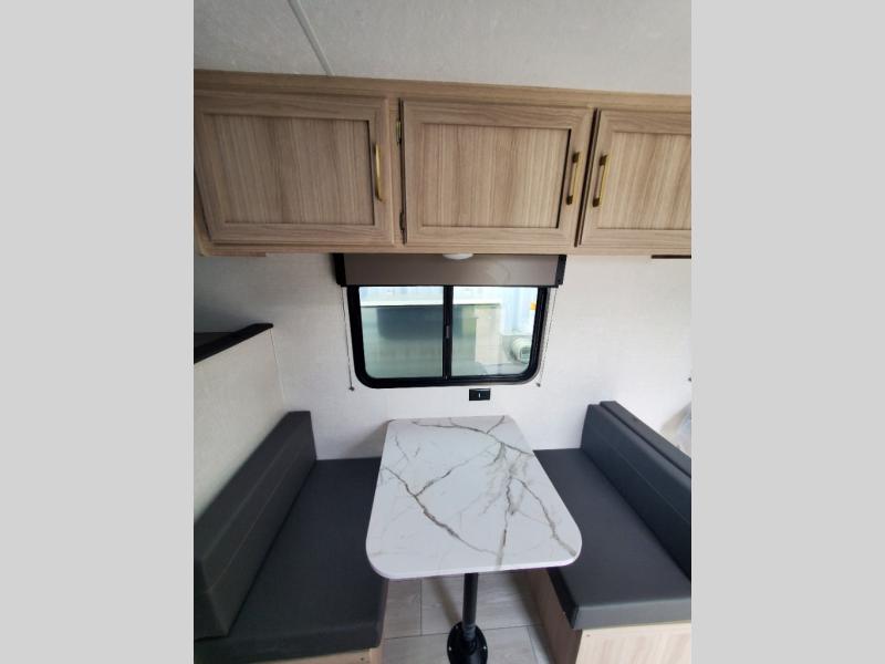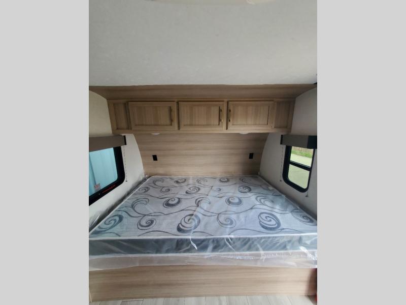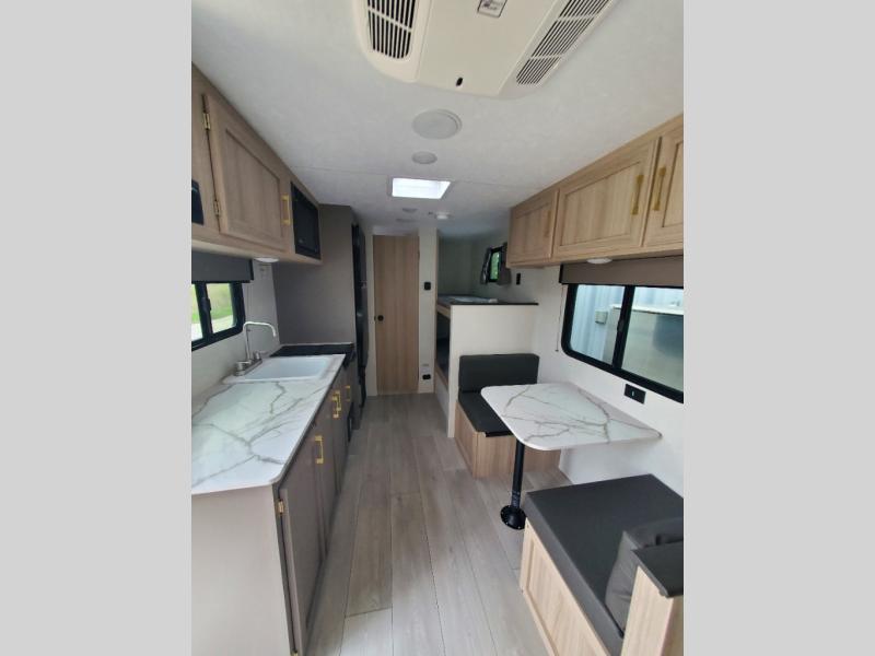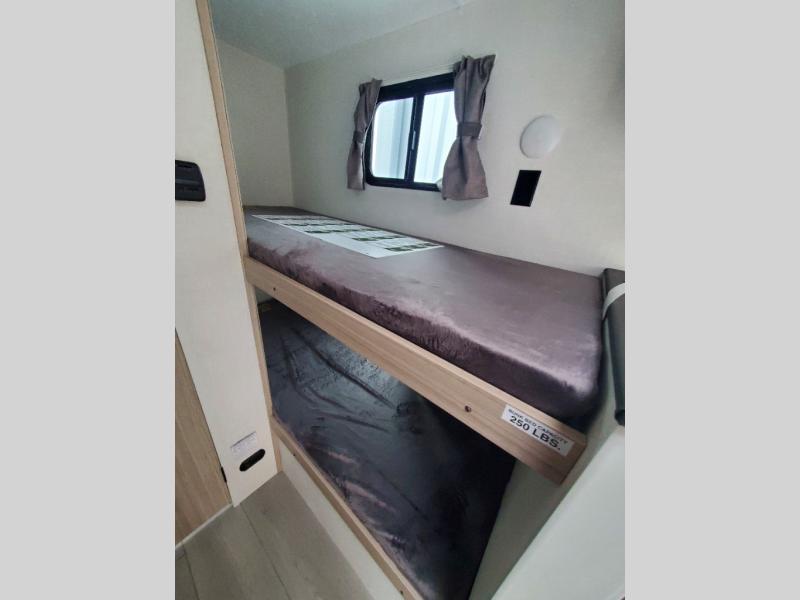 Bunk beds make this travel trailer the perfect family-friendly unit, so head to your local state park! The front 54" x 80" bed will provide comfortable sleeping space for you, plus there is a booth dinette for one or two little ones to sleep on. This model includes a two burner cooktop, a microwave oven, plus a single bowl sink for hassle-free clean up. The 13' power awning will protect you from the elements, and the pass-through storage will be perfect for fishing poles.