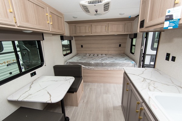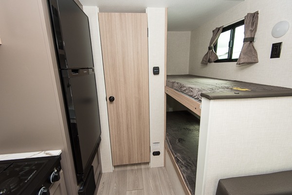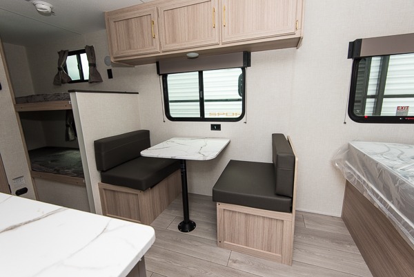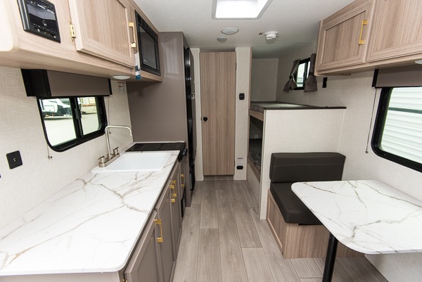 Bunk beds make this travel trailer the perfect family-friendly unit, so head to your local state park! The front 54" x 80" bed will provide comfortable sleeping space for you, plus there is a booth dinette for one or two little ones to sleep on. This model includes a two burner cooktop, a microwave oven, plus a single bowl sink for hassle-free clean up. The 13' power awning will protect you from the elements, and the pass-through storage will be perfect for fishing poles.