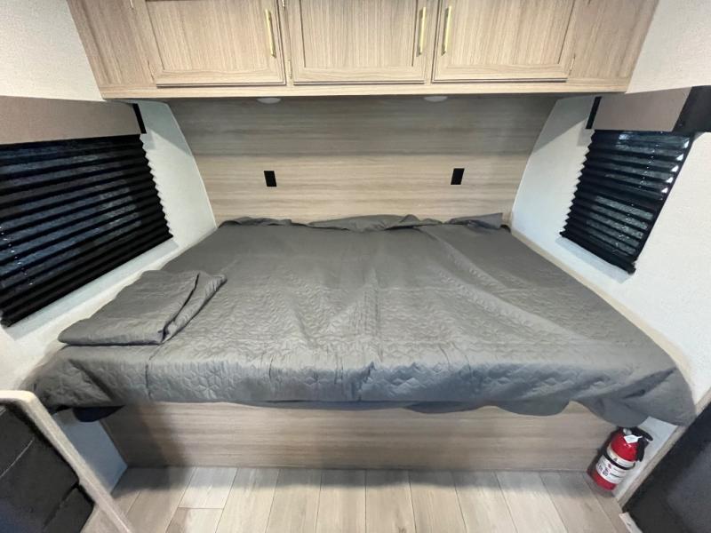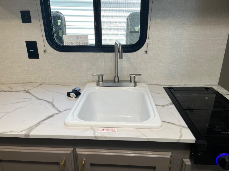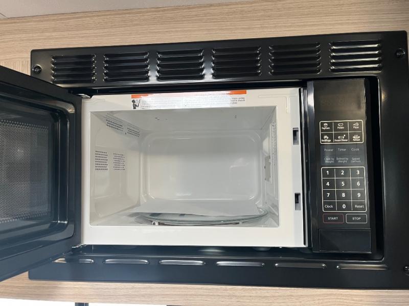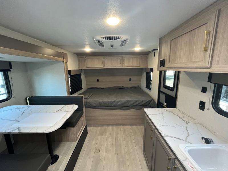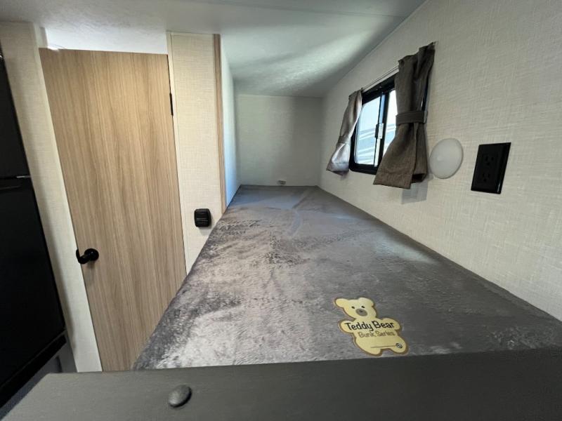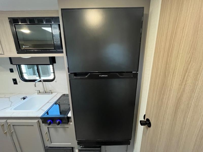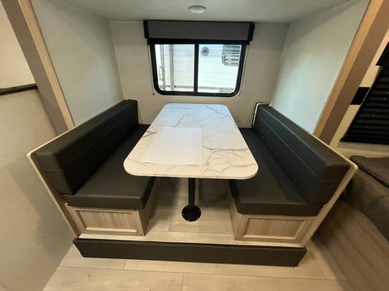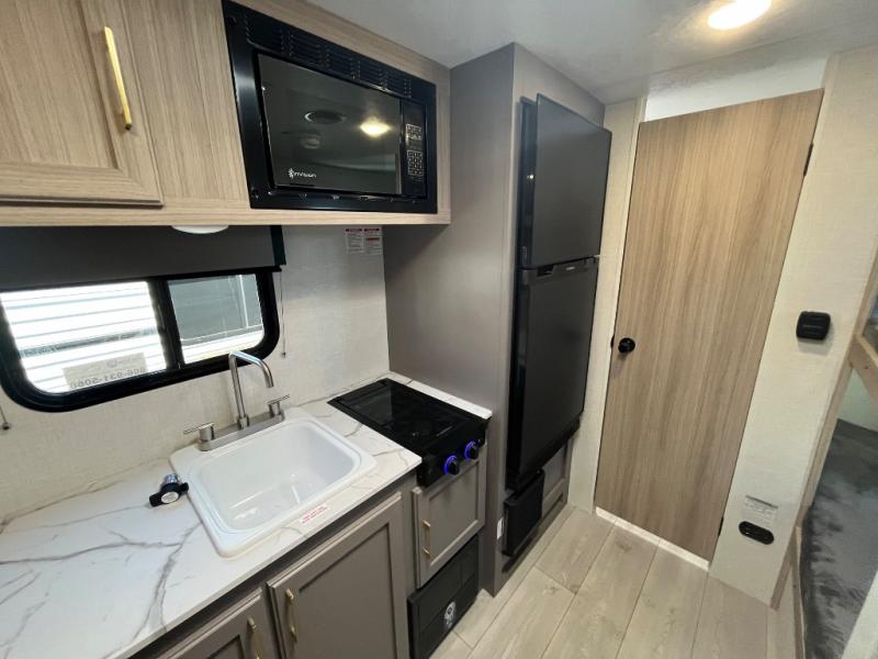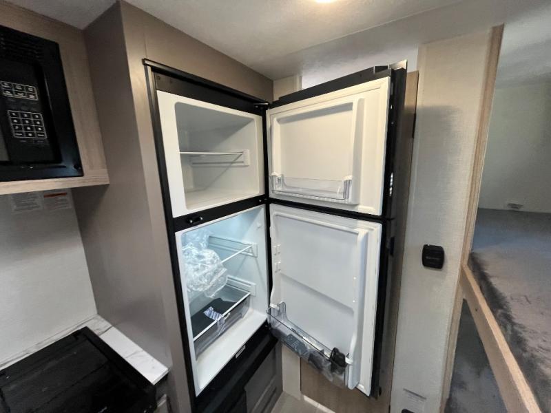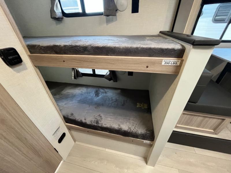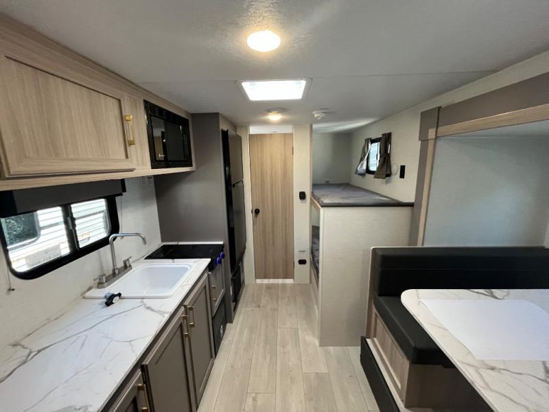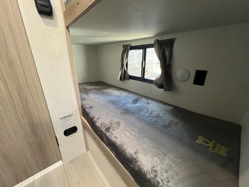You can easily sleep five with this RV thanks to the bunk beds, the front bed, and the booth dinette slide out. Whip up breakfast on the two burner cooktop with a glass cover, or use the convenient microwave oven. The 8 cu. ft. 12V refrigerator will store your perishables, and the single bowl sink allows you to keep everything clean. Start camping today with this cozy travel trailer!