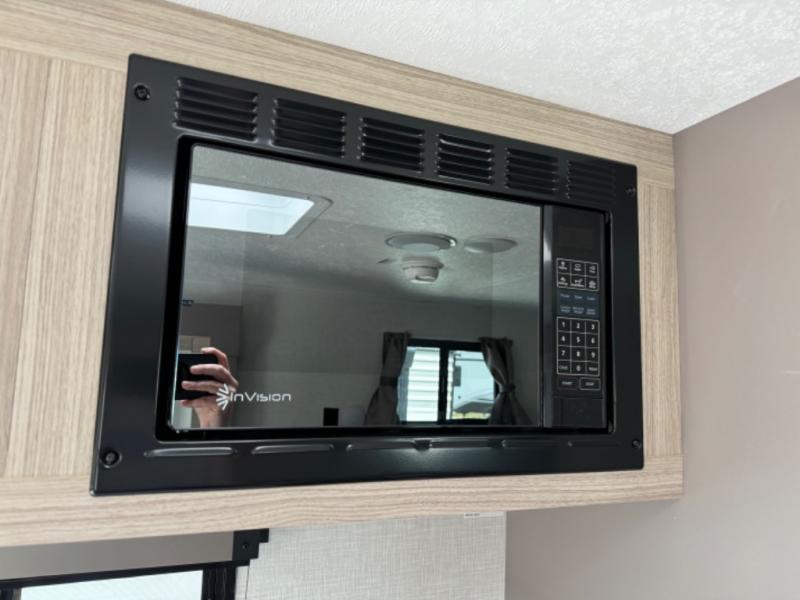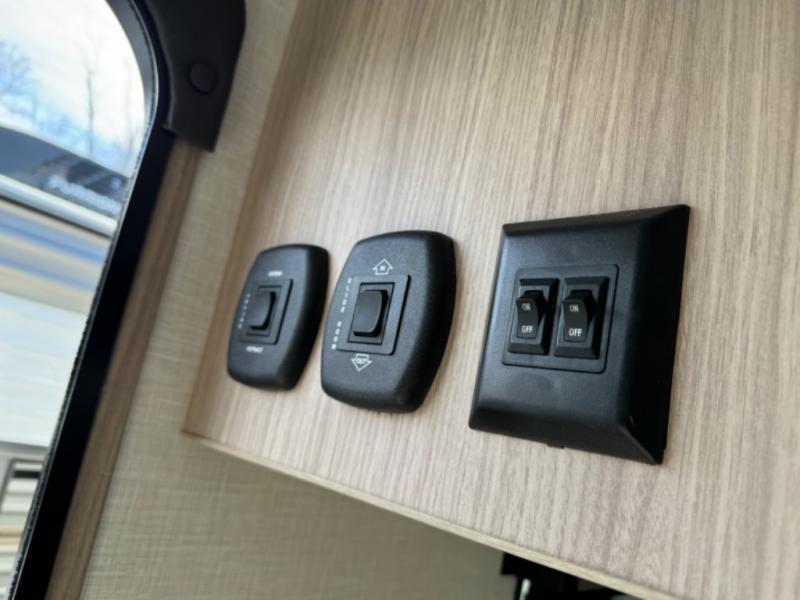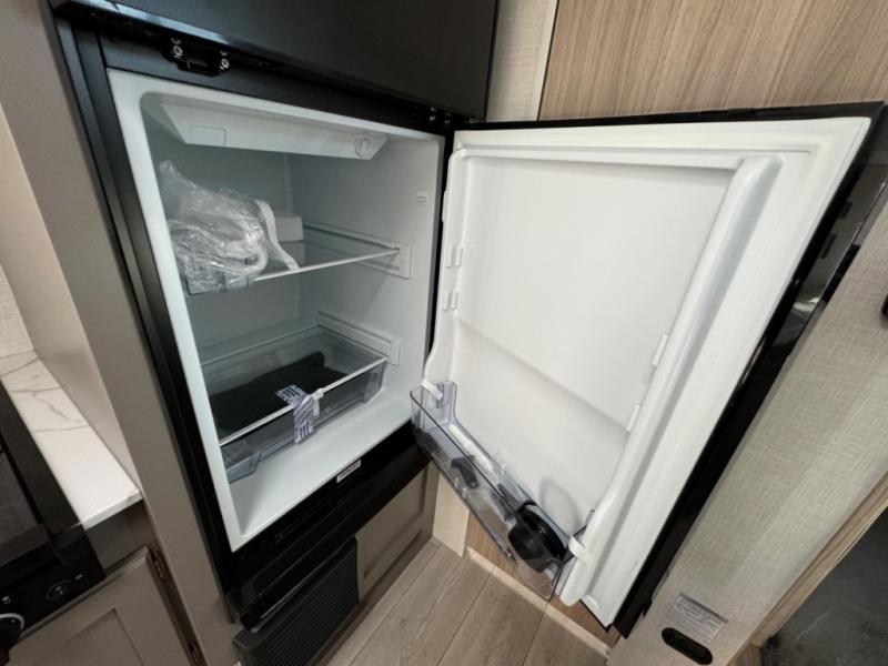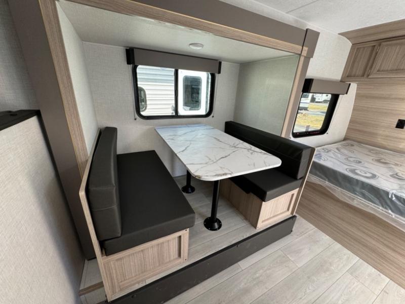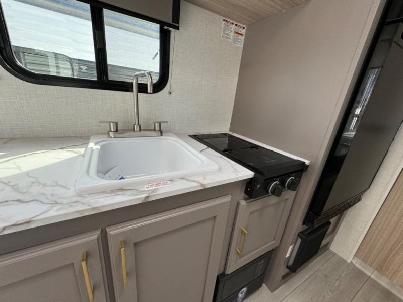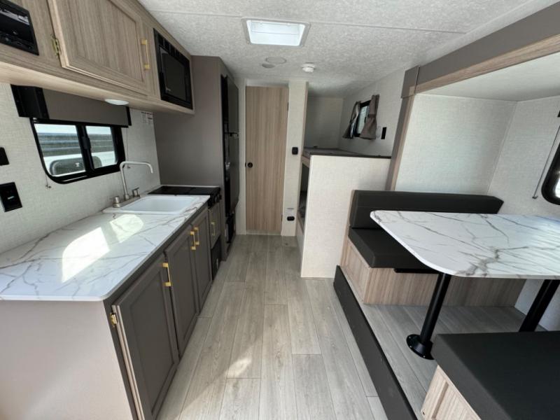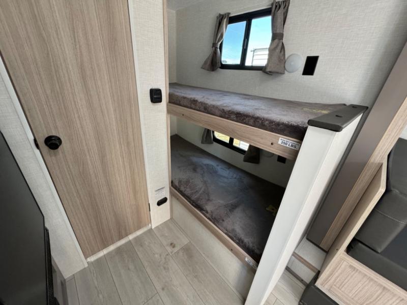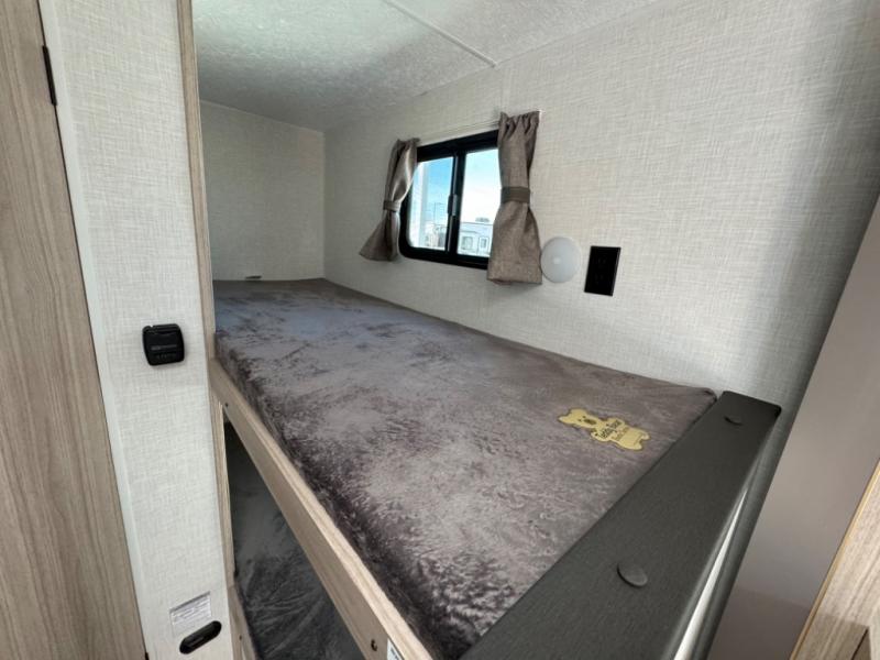 You can easily sleep five with this travel trailer thanks to the bunk beds, the front bed, and the booth dinette slide out. Whip up breakfast on the two burner cooktop with a glass cover, or use the convenient microwave oven. The 8 cu. ft. 12V refrigerator will store your perishables, and the single bowl sink allows you to keep everything clean. Start camping today with this cozy travel trailer!