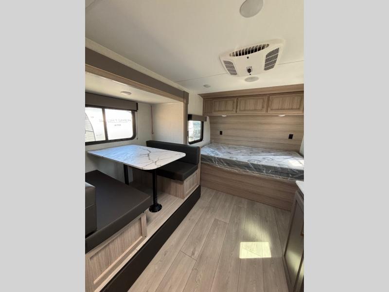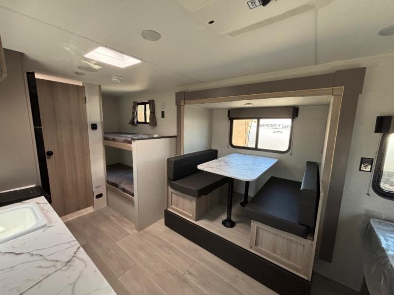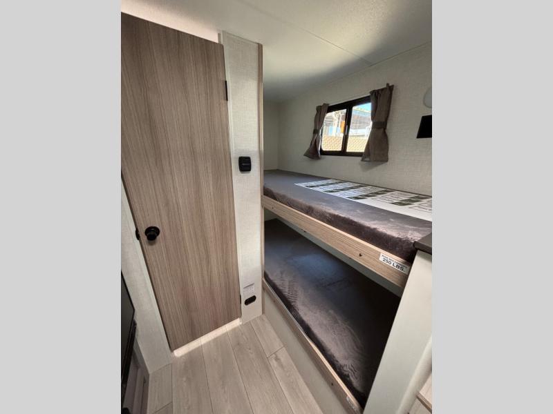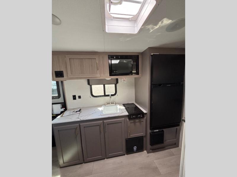 You can easily sleep five with this travel trailer thanks to the bunk beds, the front bed, and the booth dinette slide out. Whip up breakfast on the two burner cooktop with a glass cover, or use the convenient microwave oven. The 8 cu. ft. 12V refrigerator will store your perishables, and the single bowl sink allows you to keep everything clean. Start camping today with this cozy travel trailer!