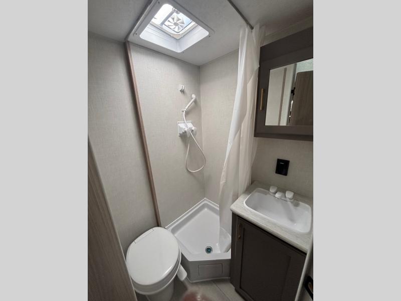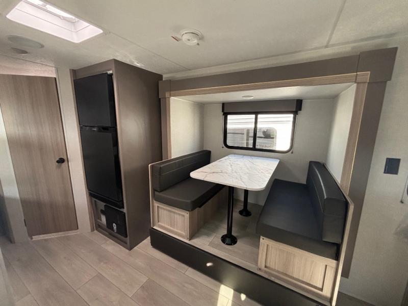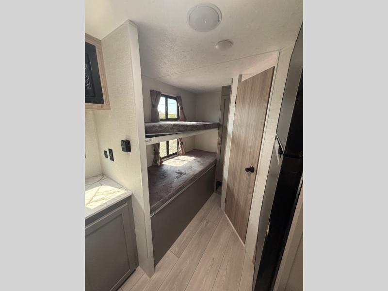 You're going to love camping in this spacious travel trailer that can sleep five people each night. When you arrive at your destination, set up the 14' power awning and start lunch on the outside kitchen with a griddle. The little ones will love the bunk beds, and you will have the front queen bed all to yourselves. This model also includes a full bath that will allow you to stay clean!