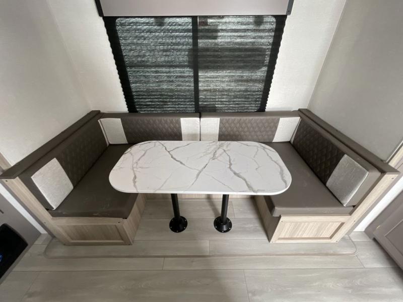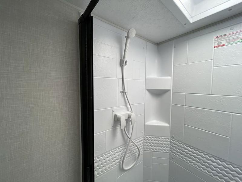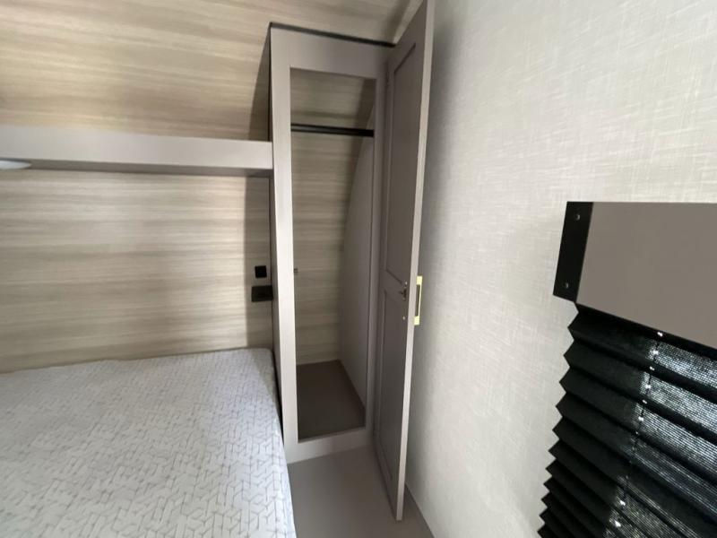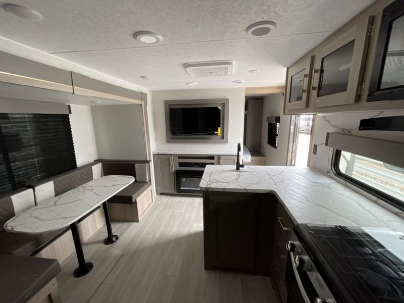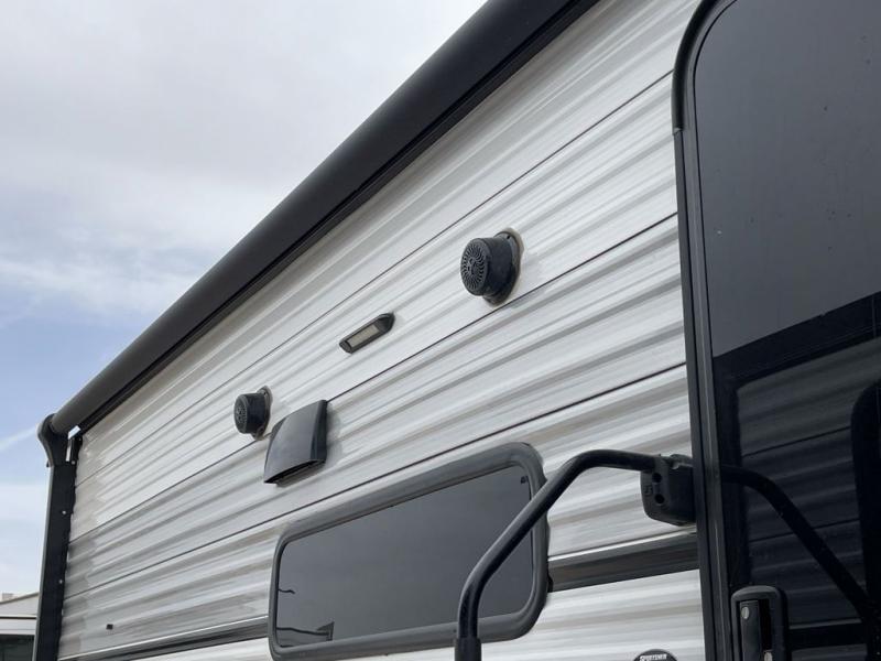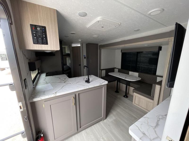 You can comfortably sleep eight people each night in this travel trailer, so invite your whole crew along! The little ones will love the double-size bunks, and the full bath is close by for convenience. You and your spouse can take the front private bedroom that includes a queen bed and dual shirt closets, and any other guests can sleep on the U-shaped dinette. Prepare a hearty breakfast on the three burner cooktop each morning, and the sink covers will provide you with more counter space to cut up fresh fruit! This model includes plenty of storage space, including an exterior trunk door plus a pass-through storage for fishing poles and tackle boxes!