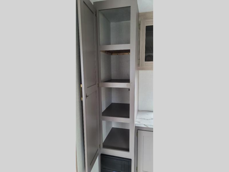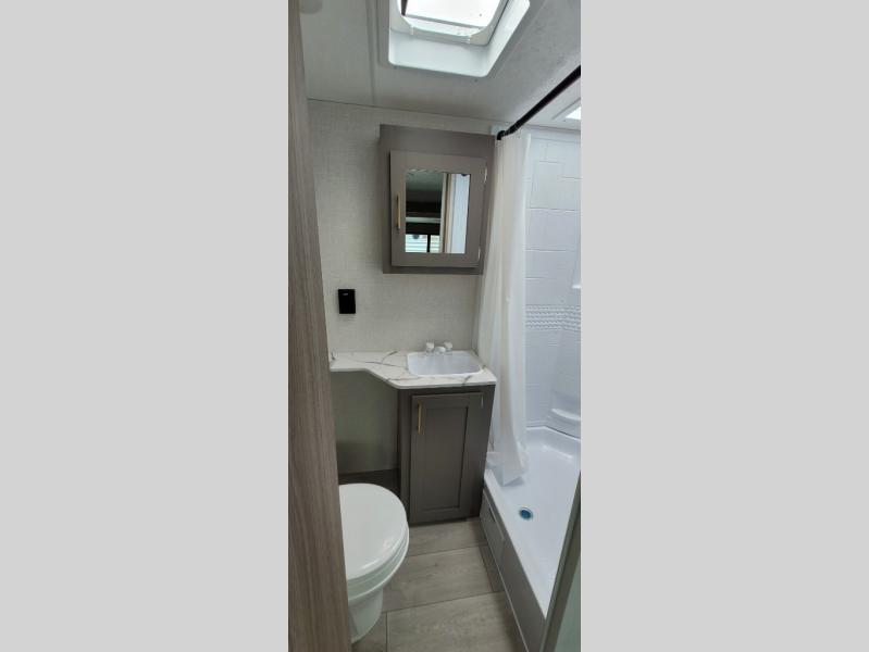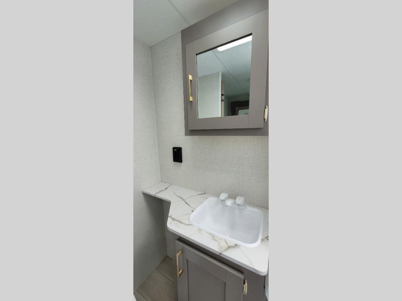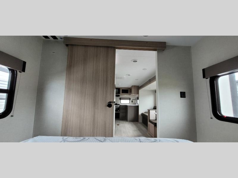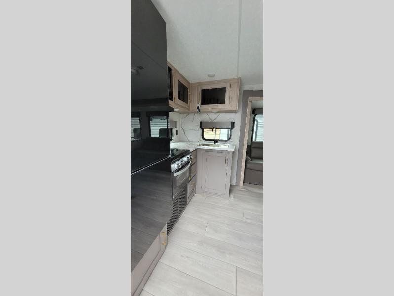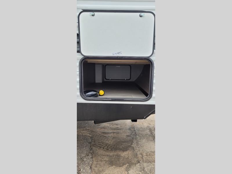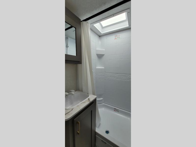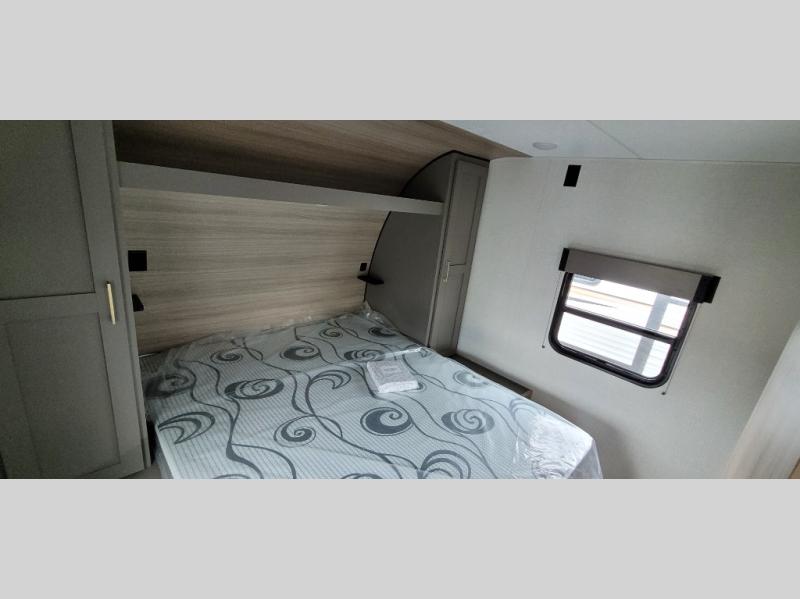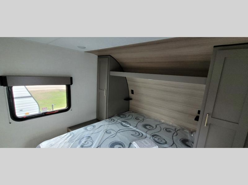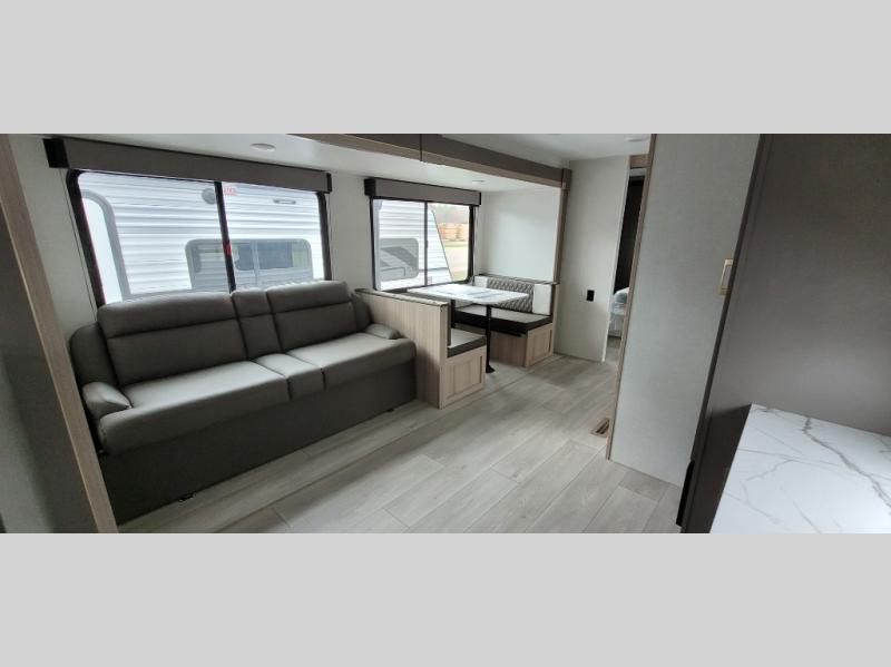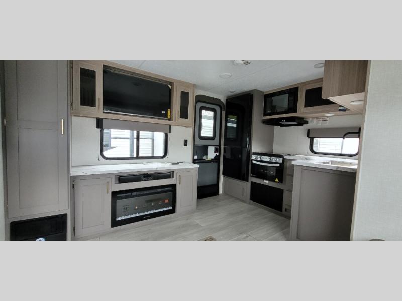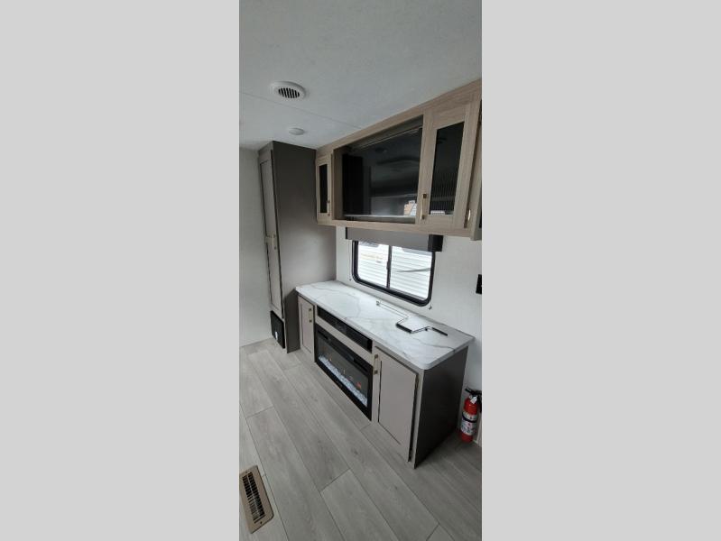 You will love the amount of interior space you have in this travel trailer thanks to the large slide out and rear kitchen with plenty of counter space. There is a 70" sofa and 42" booth dinette within the slide out across from the entertainment center, and you can add the optional 30" fireplace here for more comfort. The full bath includes a bath shelf with towel hooks, plus a foot-flush toilet for convenience. You will feel right at home in the front private bedroom that includes a queen bed, dual shirt closets, plus a TV mount if you choose to bring along a television.