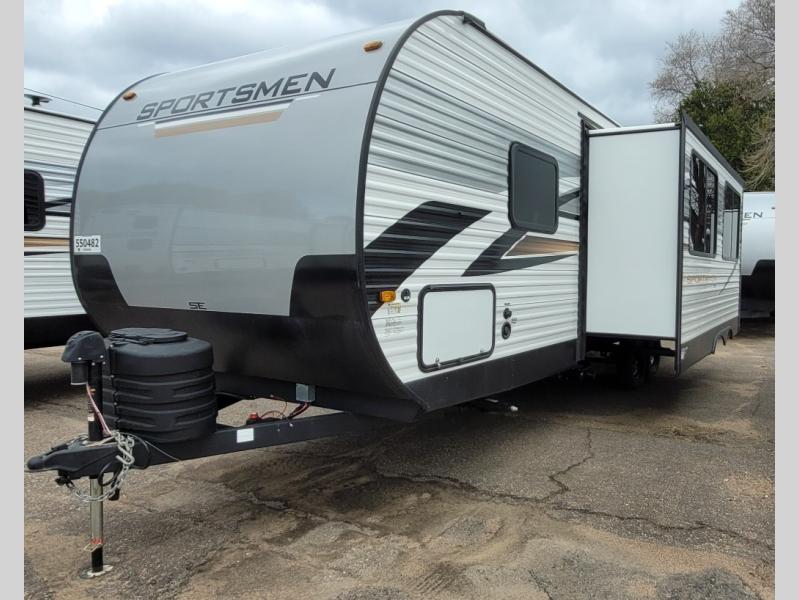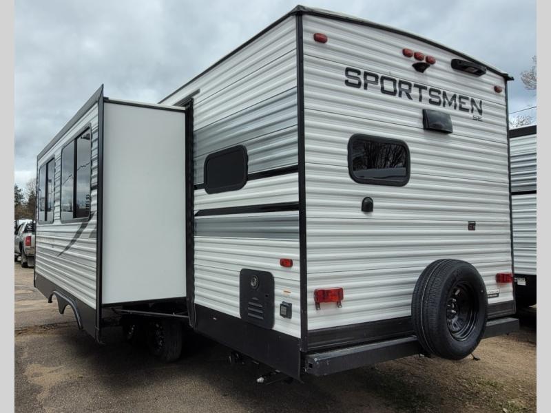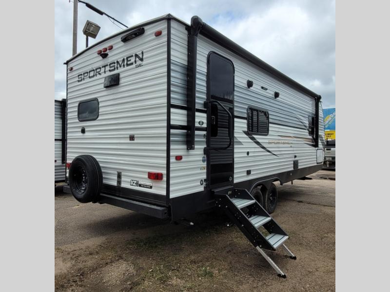 Each Sportsmen SE travel trailer by KZ is constructed with KZ exclusive tough shield exterior metal, a one-piece seamless walk-on Tufflex roofing material, and diamond plate rock guard to protect your unit from road debris. You will appreciate the extra large baggage doors for stowing away your gear when not in use, and tinted windows to help keep the harmful sun rays out plus keeping it cooler inside. Some of the exterior conveniences found in the mandatory Advantage Package are the solid folding steps with a large folding grab handle for easy entry and exit, a full glass friction hinged entry door, plus an exterior shower for your pets or to rinse off before you head inside. You'll also appreciate the nitrogen-filled tires, solar and backup camera prep, plus a Leash Latch with a bonus beverage opener. You'll feel right at home inside with linoleum flooring throughout, a 13,500 BTU air conditioner, large overhead cabinets, a shower surround, and much more!