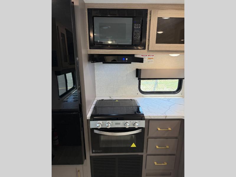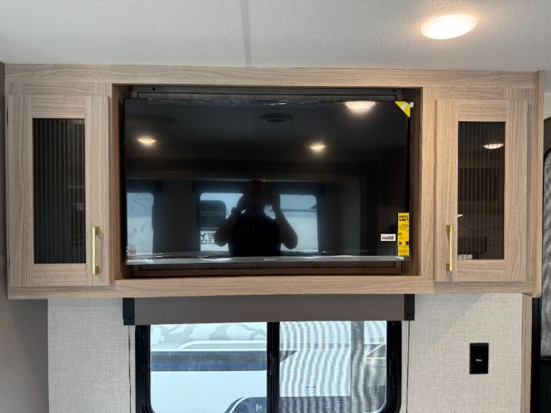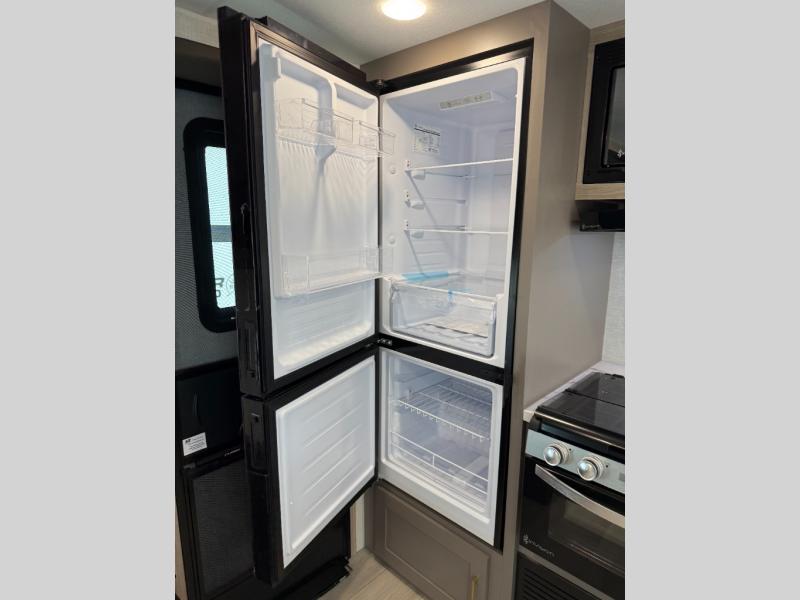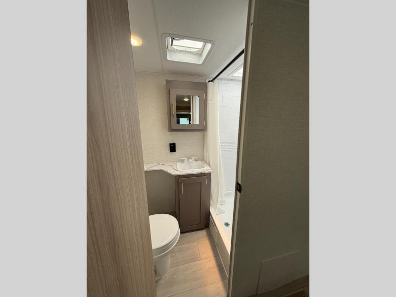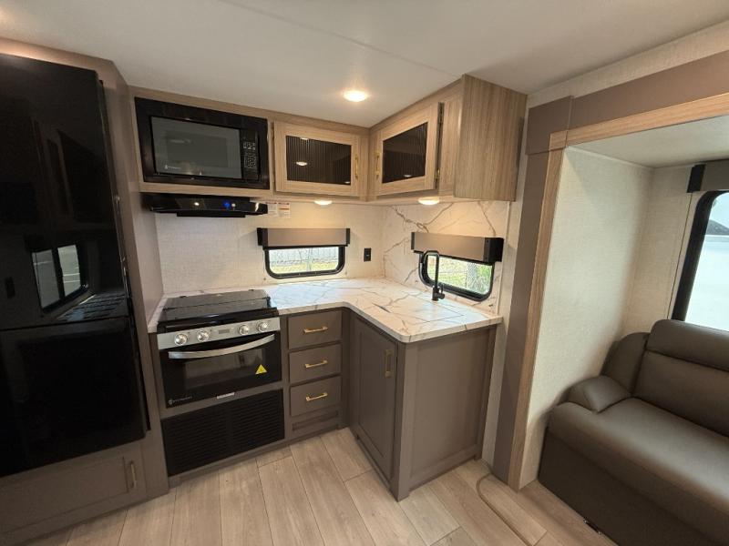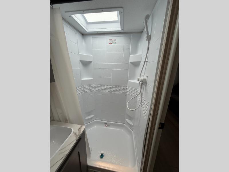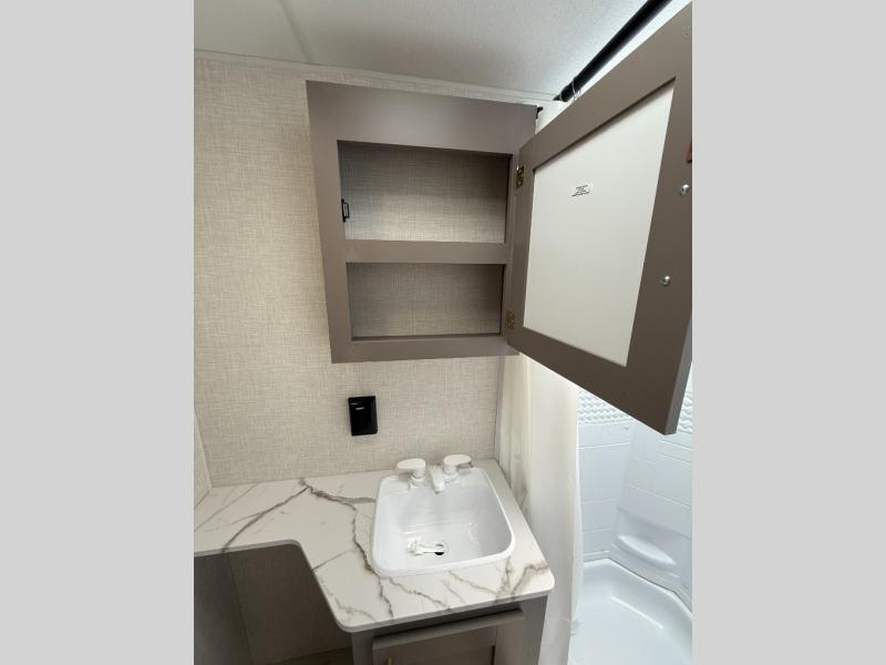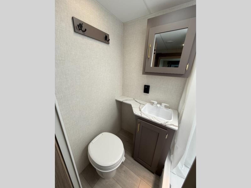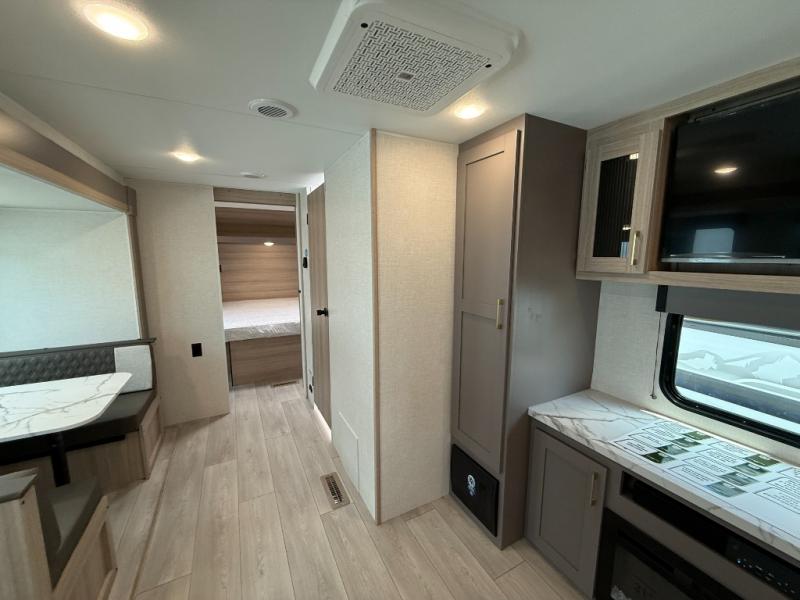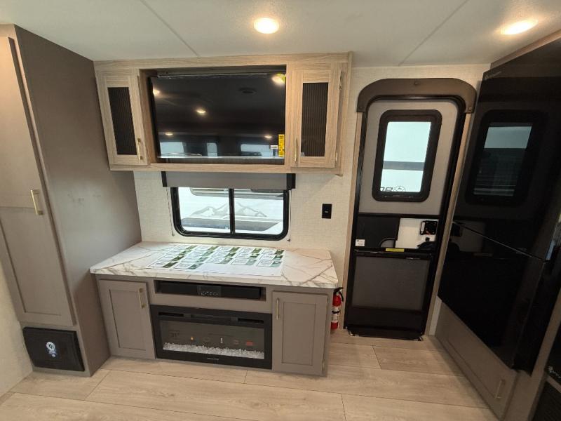 You will love the amount of interior space you have in this travel trailer thanks to the large slide out and rear kitchen with plenty of counter space. There is a 70" sofa and 42" booth dinette within the slide out across from the entertainment center, and you can add the optional 30" fireplace here for more comfort. The full bath includes a bath shelf with towel hooks, plus a foot-flush toilet for convenience. You will feel right at home in the front private bedroom that includes a queen bed, dual shirt closets, plus a TV mount if you choose to bring along a television.