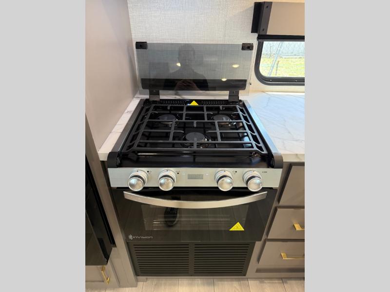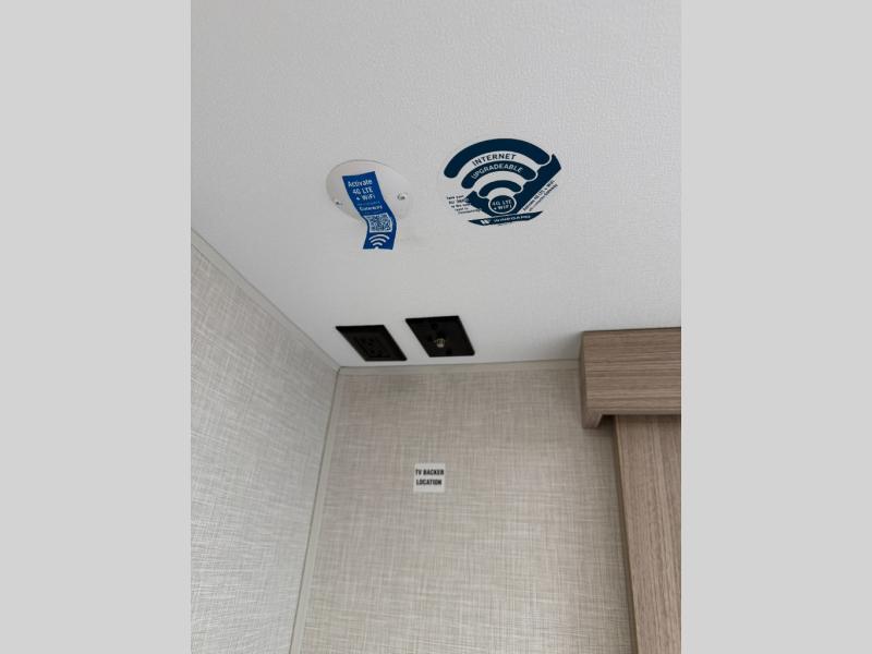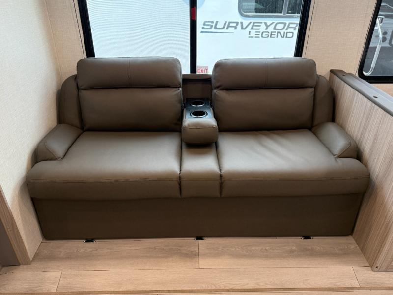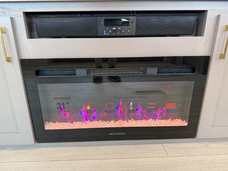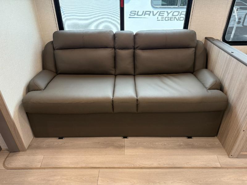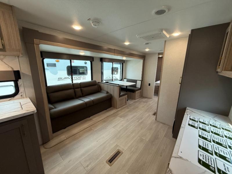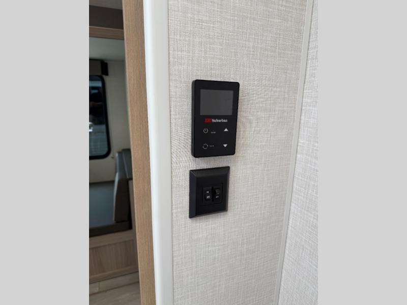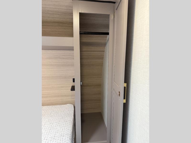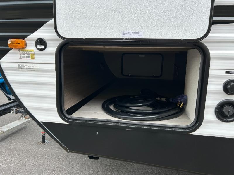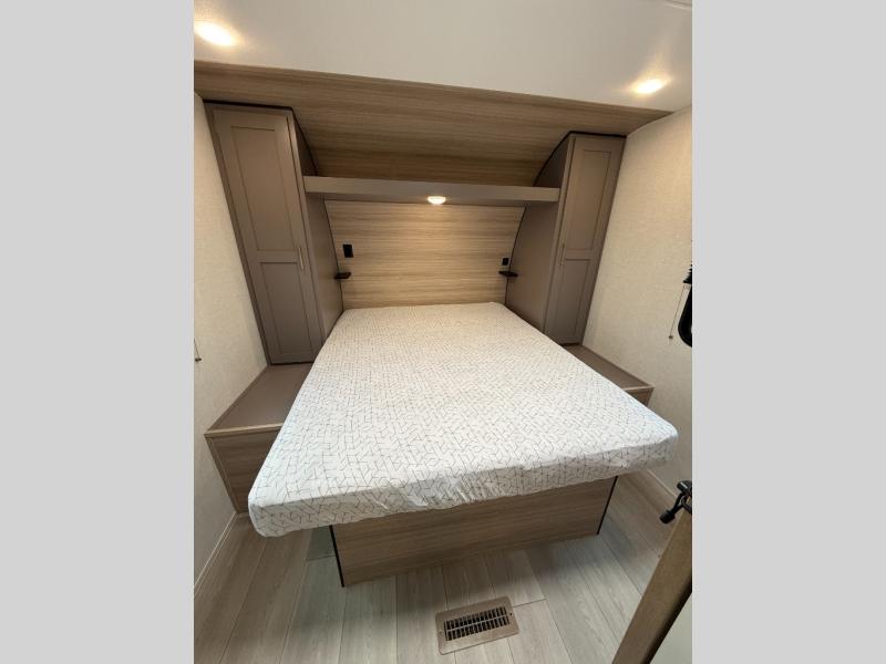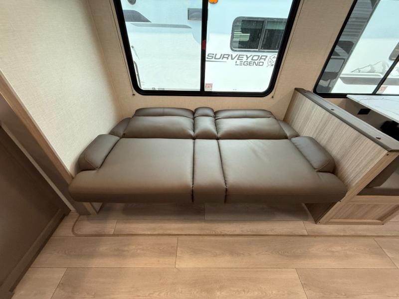 You will love the amount of interior space you have in this travel trailer thanks to the large slide out and rear kitchen with plenty of counter space. There is a 70" sofa and 42" booth dinette within the slide out across from the entertainment center, and you can add the optional 30" fireplace here for more comfort. The full bath includes a bath shelf with towel hooks, plus a foot-flush toilet for convenience. You will feel right at home in the front private bedroom that includes a queen bed, dual shirt closets, plus a TV mount if you choose to bring along a television.