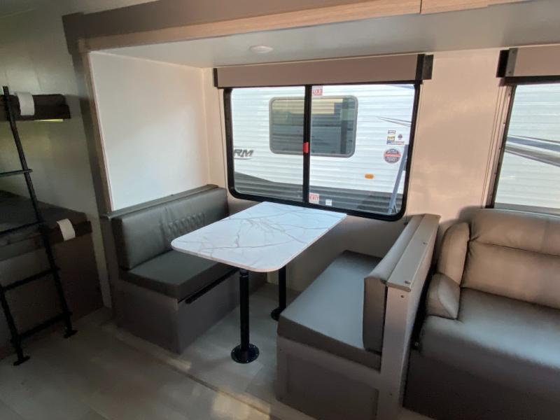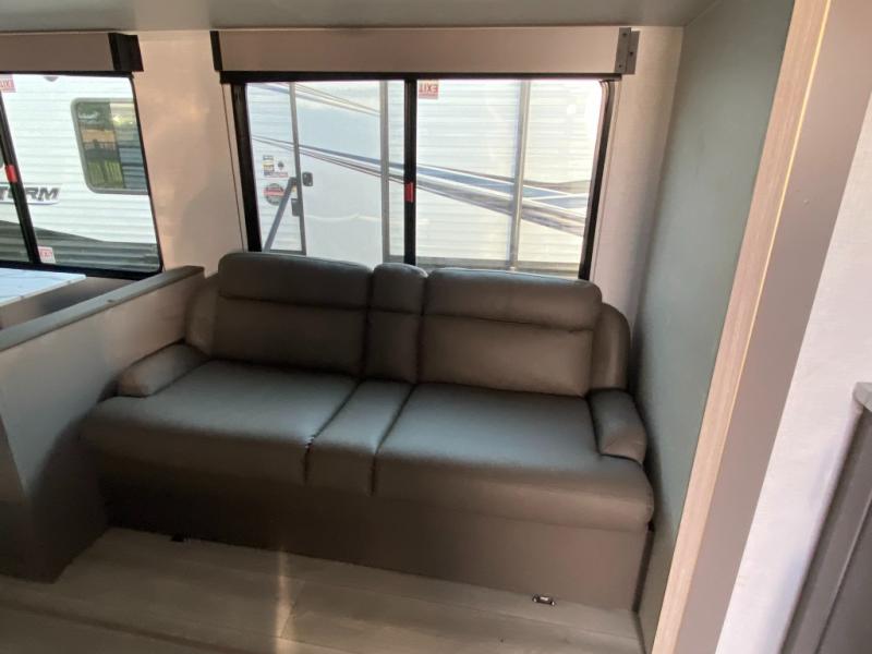 This is a great travel trailer to sleep all your friends or family! Once you arrive at the campground, the chef of your group can prepare lunch on the outside kitchen that includes a griddle and a refrigerator. The 18' power awning here will provide shade from the hot sun, and you can grab the lawn chairs from the pass-through storage to relax. You will find plenty of seating space inside on the 70" sofa and booth dinette within the large slide out, plus there is an entertainment center here. The interior kitchen includes everything you need to prepare meals each day, including a three burner cooktop, a microwave oven, plus a wardrobe/pantry for jackets or dry goods!