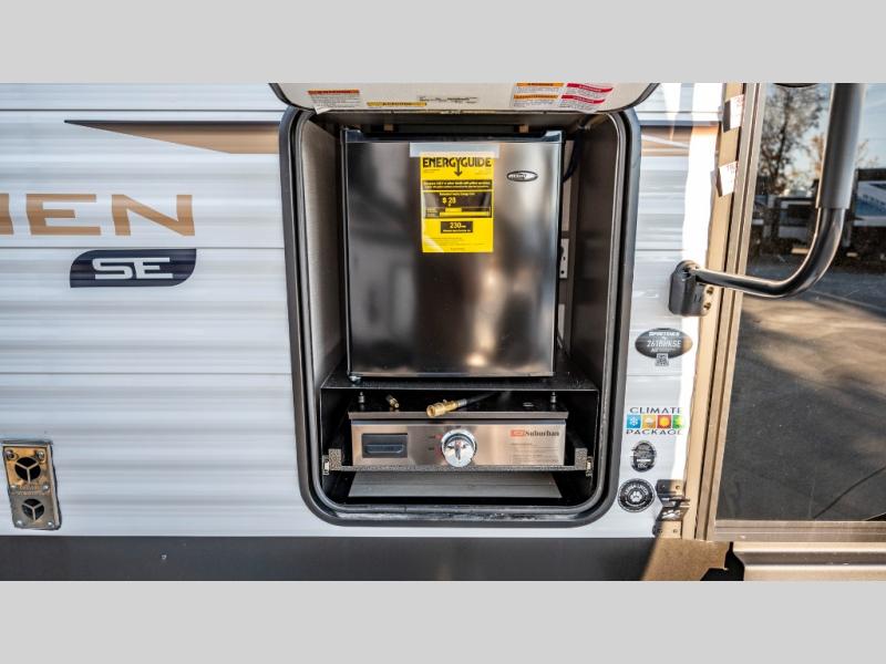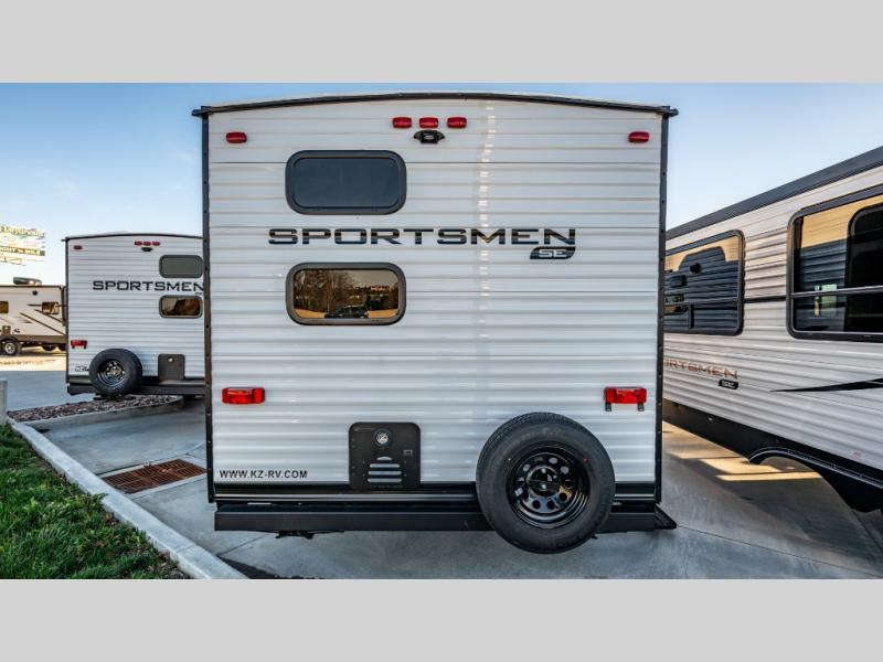 Each Sportsmen SE travel trailer and toy hauler by KZ is constructed with KZ exclusive tough shield exterior metal, a one-piece seamless walk-on Tufflex roofing material, and diamond plate rock guard to protect your unit from road debris. You will appreciate the extra large baggage doors for stowing away your gear when not in use, and tinted windows to help keep the harmful sun rays out plus keeping it cooler inside. Some of the exterior conveniences found in the mandatory Advantage Package are the solid folding steps with a large folding grab handle for easy entry and exit, a full glass friction hinged entry door, plus an exterior shower for your pets or to rinse off before you head inside. You'll also appreciate the nitrogen-filled tires, solar and backup camera prep, plus a Leash Latch with a bonus beverage opener. You'll feel right at home inside with linoleum flooring throughout, a 13,500 BTU air conditioner, large overhead cabinets, a shower surround, and much more!