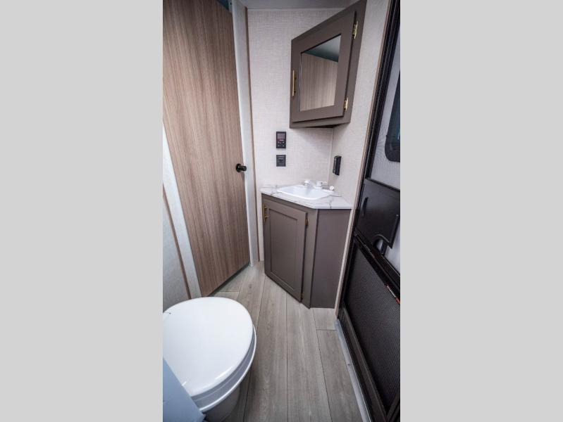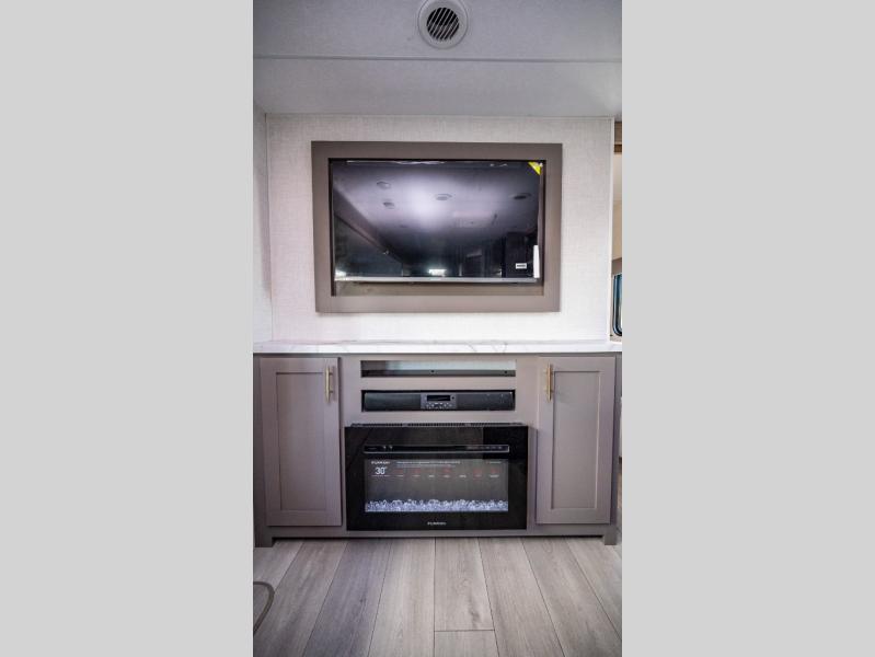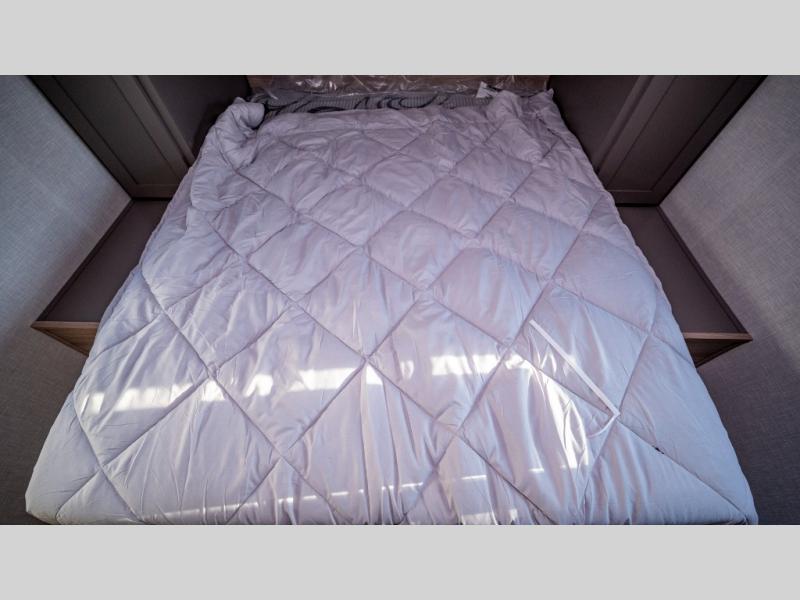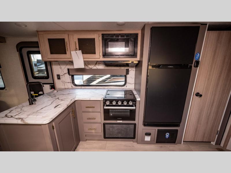 This is a great travel trailer to sleep all your friends or family! Once you arrive at the campground, the chef of your group can prepare lunch on the outside kitchen that includes a griddle and a refrigerator. The 18' power awning here will provide shade from the hot sun, and you can grab the lawn chairs from the pass-through storage to relax. You will find plenty of seating space inside on the 70" sofa and booth dinette within the large slide out, plus there is an entertainment center here. The interior kitchen includes everything you need to prepare meals each day, including a three burner cooktop, a microwave oven, plus a wardrobe/pantry for jackets or dry goods!