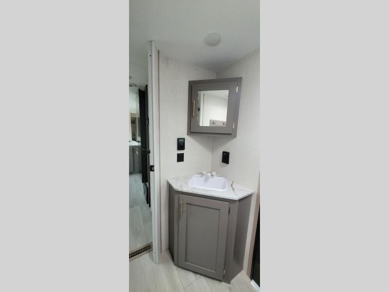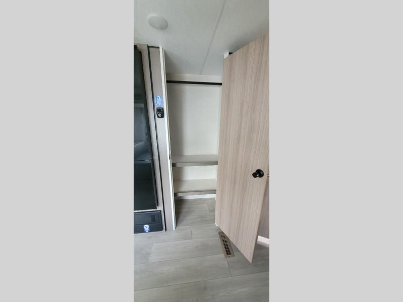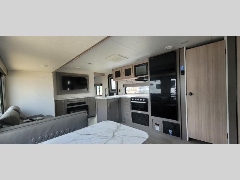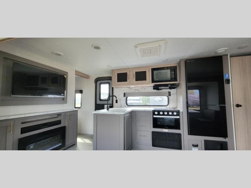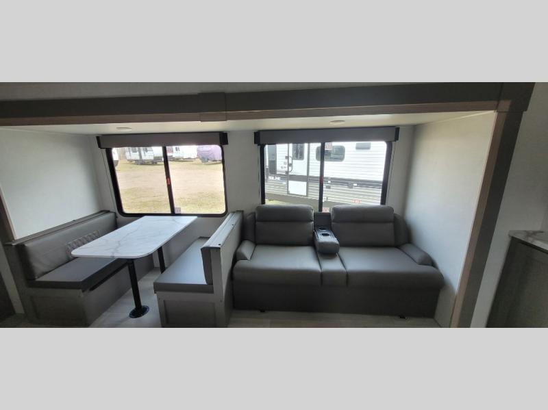 This is a great travel trailer to sleep all your friends or family! Once you arrive at the campground, the chef of your group can prepare lunch on the outside kitchen that includes a griddle and a refrigerator. The 18' power awning here will provide shade from the hot sun, and you can grab the lawn chairs from the pass-through storage to relax. You will find plenty of seating space inside on the 70" sofa and booth dinette within the large slide out, plus there is an entertainment center here. The interior kitchen includes everything you need to prepare meals each day, including a three burner cooktop, a microwave oven, plus a wardrobe/pantry for jackets or dry goods!